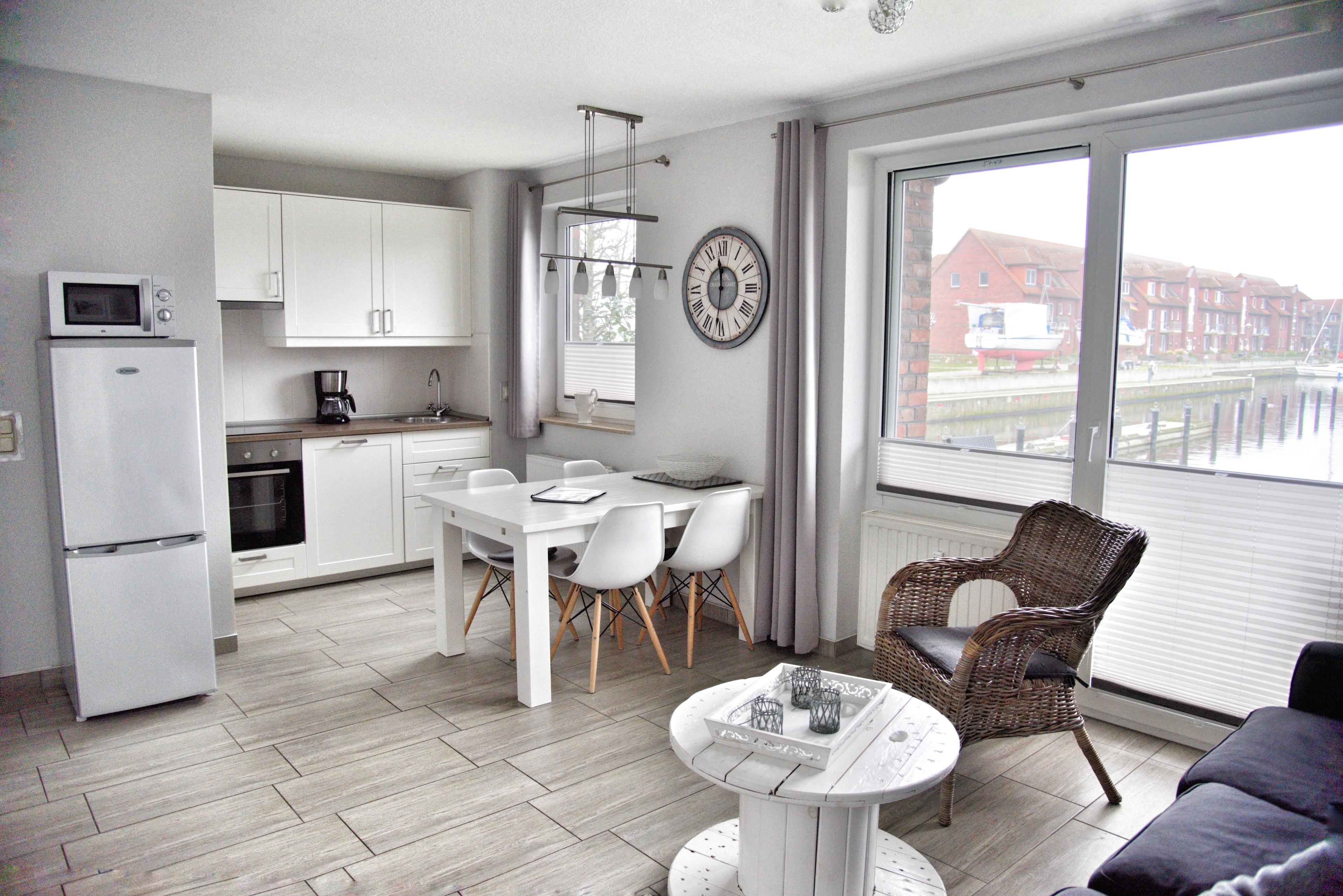 Bei der Ferienwohnung Bilge handelt es sich um eine hochwertig eingerichtete, maritim geprägte Nichtraucherwohnung, die sich auf 42 Quadratmetern erstreckt. Aus jedem Fenster und auch von der Terrasse können Sie direkt auf das Hafenbecken der Lagunenstadt schauen. Auf der Terrasse, welche gen Westen ausgerichtet ist, stehen Ihnen vier Stühle, ein Tisch und ein Sonnenschirm zur Verfügung.