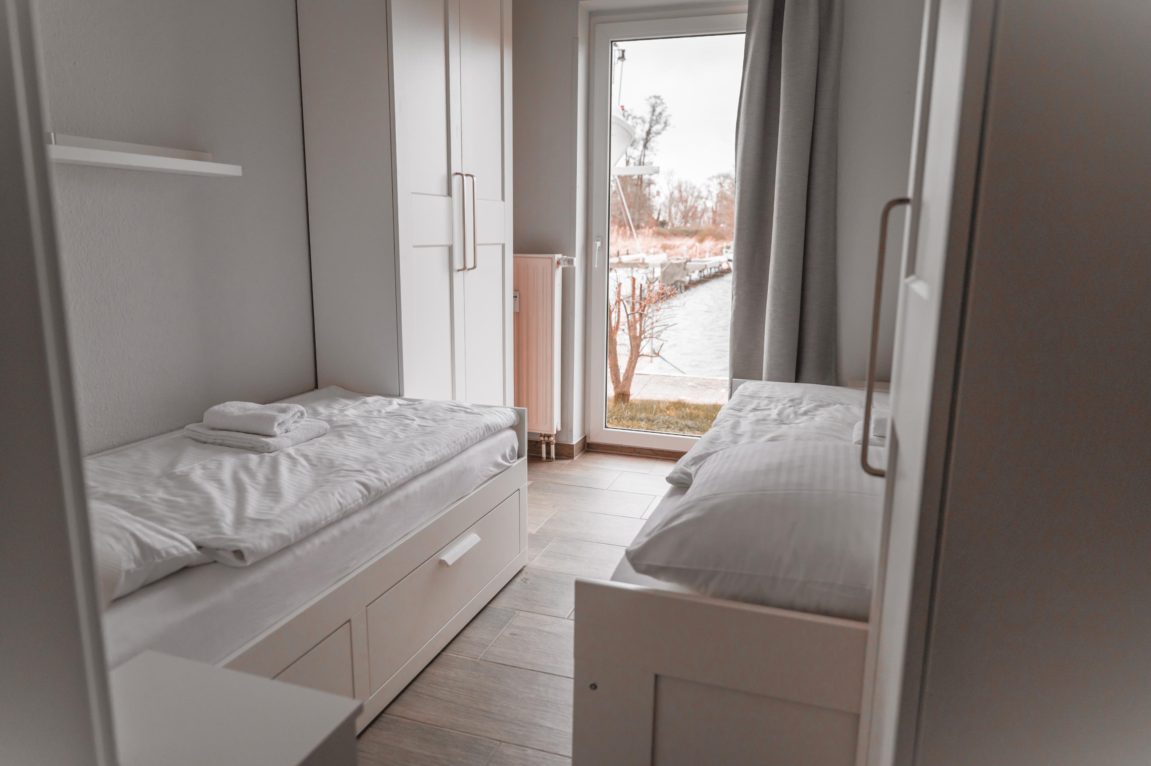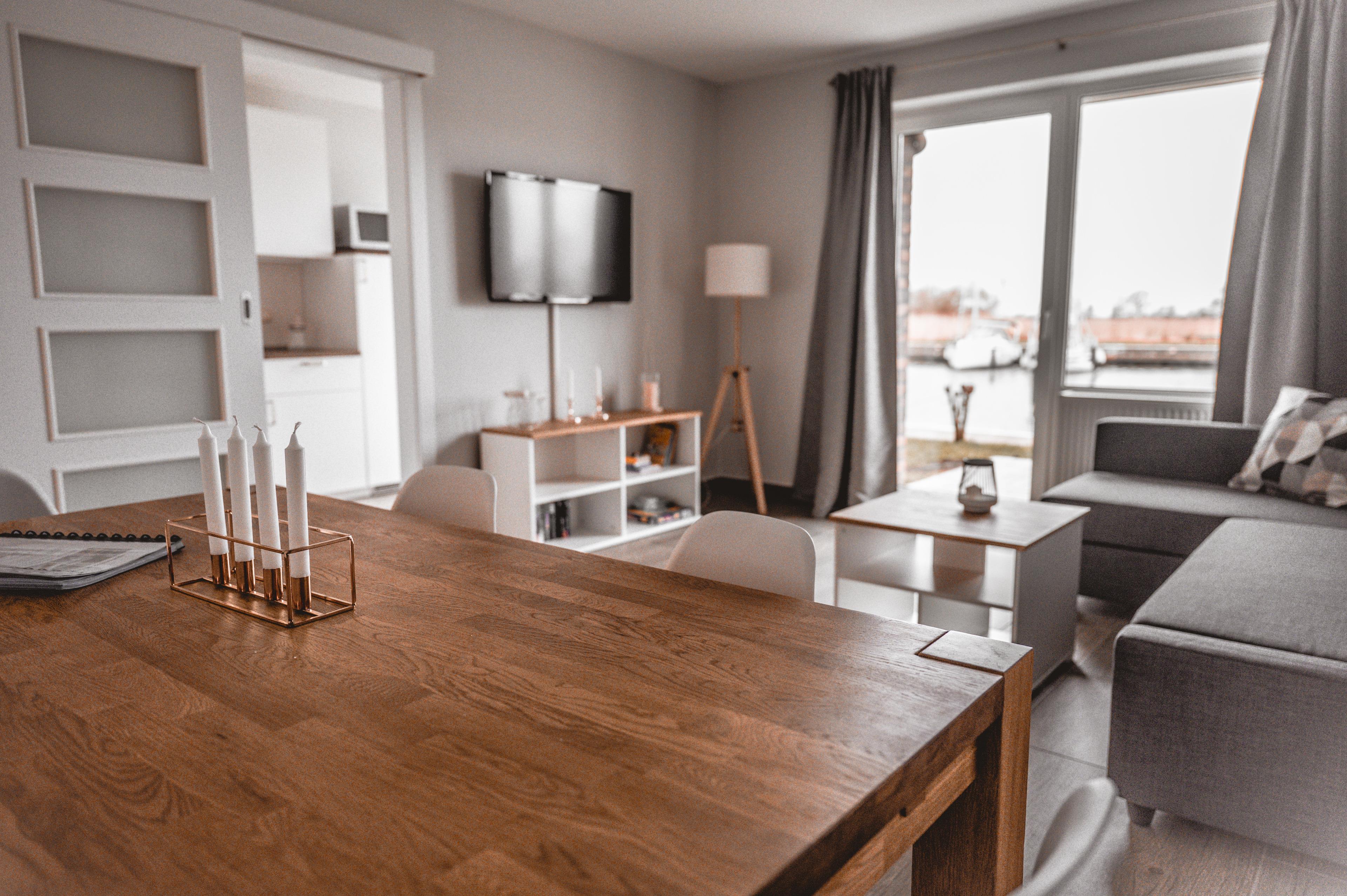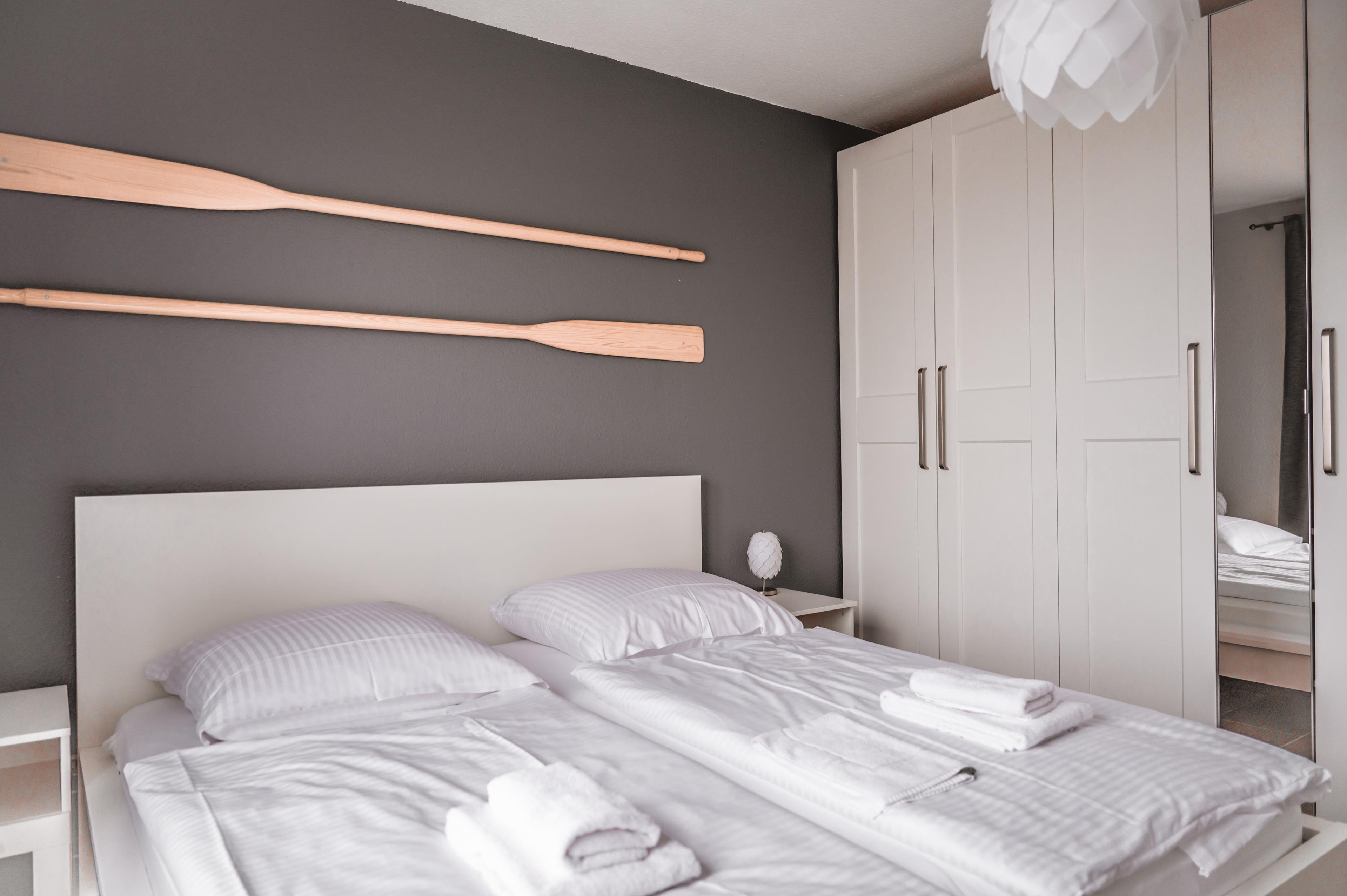 Bei der Ferienwohnung Bug handelt es sich um eine hochwertig eingerichtete Nichtraucherwohnung, welche sich auf 65 Quadratmetern erstreckt. Auf der Terrasse, welche gen Westen ausgerichtet ist, stehen Ihnen Gartenstühle, ein Tisch und ein Sonnenschirm zur Verfügung. Aus jedem Fenster der Ferienwohnung und auch von der Terrasse aus blicken Sie direkt auf die Hafenanlagen der Marina. Alle Fenster sind bodentief. Boote und maritimes Flair zum Anfassen.