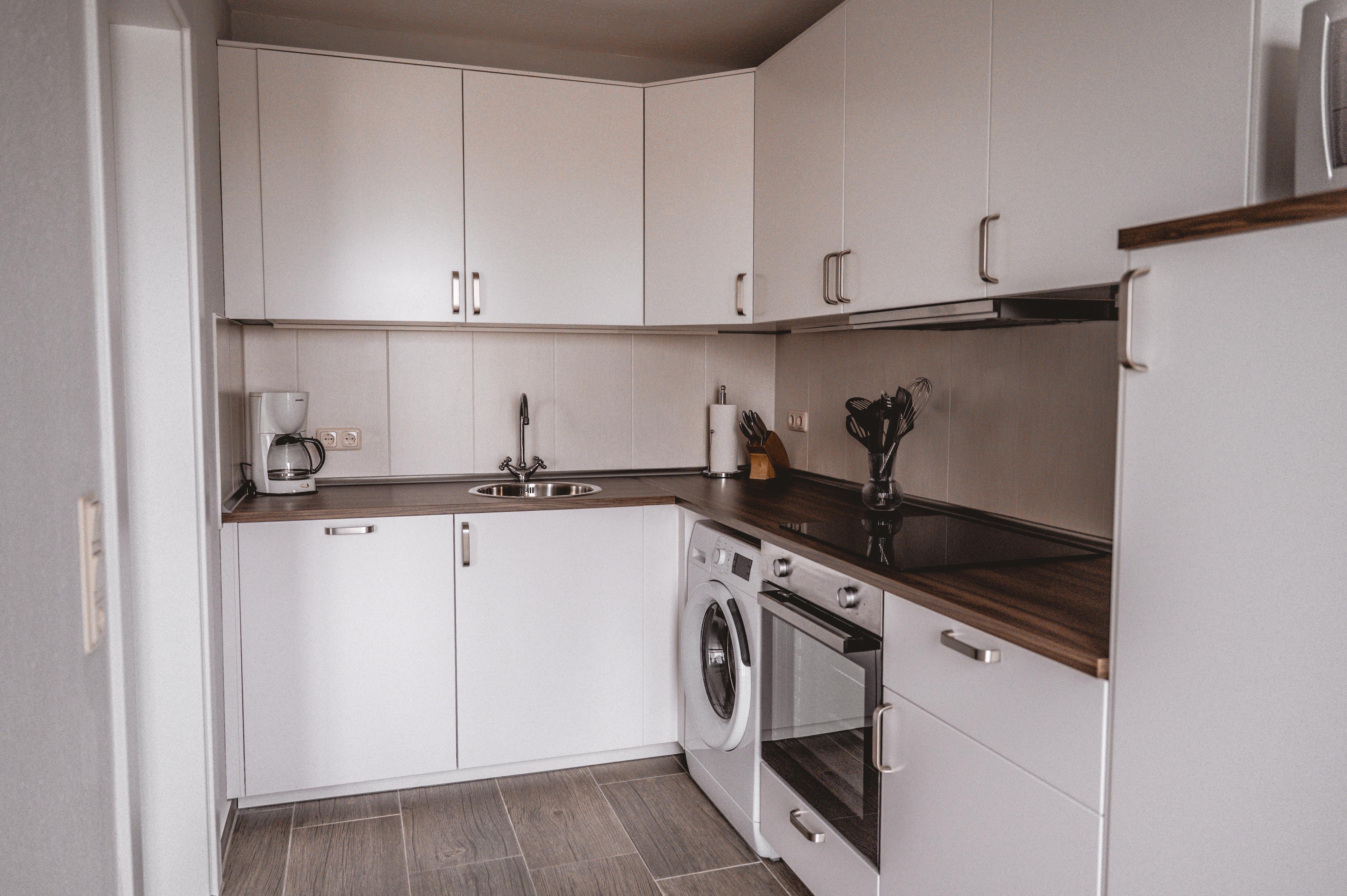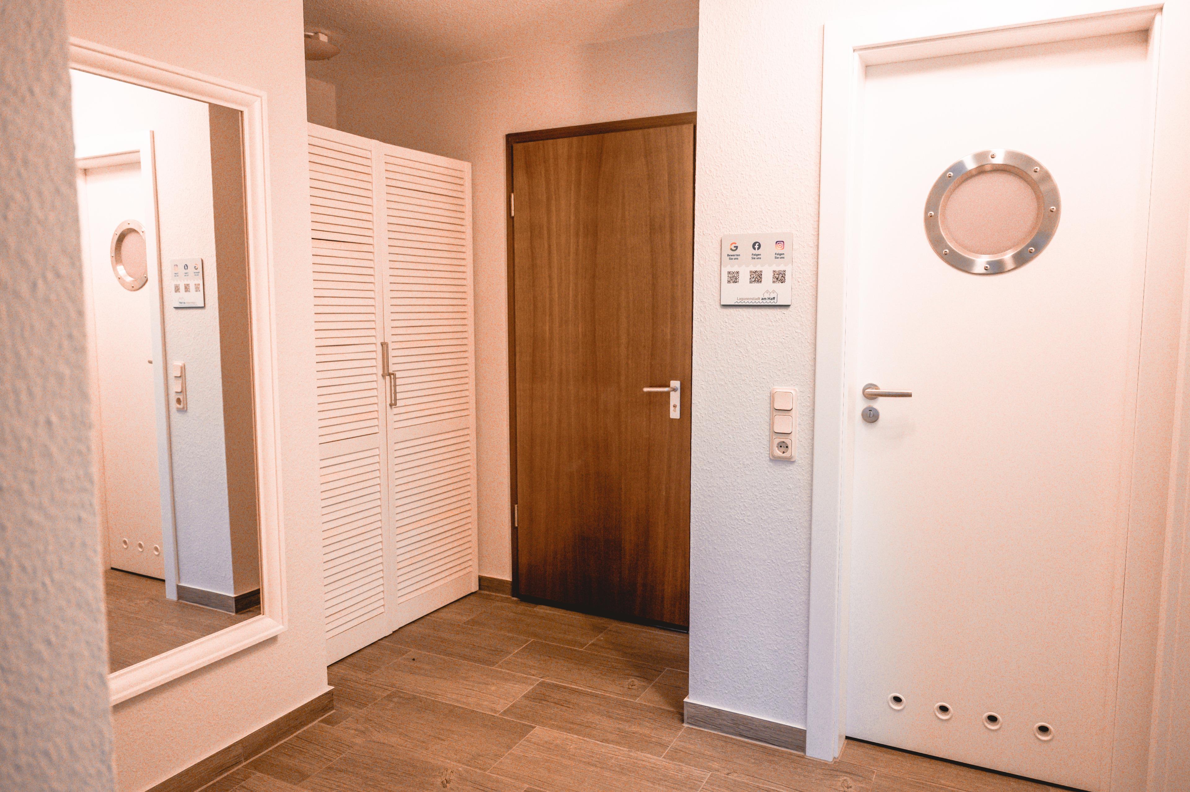 Ihr Wohnzimmer verfügt über einen Esstisch mit sechs Stühlen, ein Schlafsofa und einen Sessel. Der Wohnbereich weist eine ansprechende, maritime Ausstattung auf, vorhanden sind ein TV und ein Kabelanschluss. Auch einige Gesellschaftsspiele warten hier schon auf Sie. In Ihrem großen Schlafzimmer befindet sich ein Doppelbett. Nachtische, Leselampen und Garderoben möchten hier von Ihnen genutzt werden. Der große Schrank wird Ihnen gute Dienste leisten. Im kleinen Schlafzimmer sind zwei Einzelbetten für Sie vorhanden. Auch hier befinden sich weitere Ablagen, Schränke, eine Garderobe, Nachttische und Leselampen. Ihre große Küche ist für Sie voll ausgestattet. Bestandteile sind unter anderem ein Cerankochfeld mit Backofen, ein Geschirrspüler, eine Waschmaschine, Kaffeemaschine, Mikrowelle, viel Geschirr, eine Kühl- und Gefrierkombination und weiteres Equipment. Das Badezimmer hält eine Badewanne mit Duschecke für Sie vor. Ablageflächen und einen Fön warten hier auch schon auf Sie. All Ihre Mitbringsel finden hier ausreichend Platz. Der Flur ist mit einer Garderobe, einem Spiegel und Abstellmöglichkeiten für Reinigungsgeräte ausgestattet.
