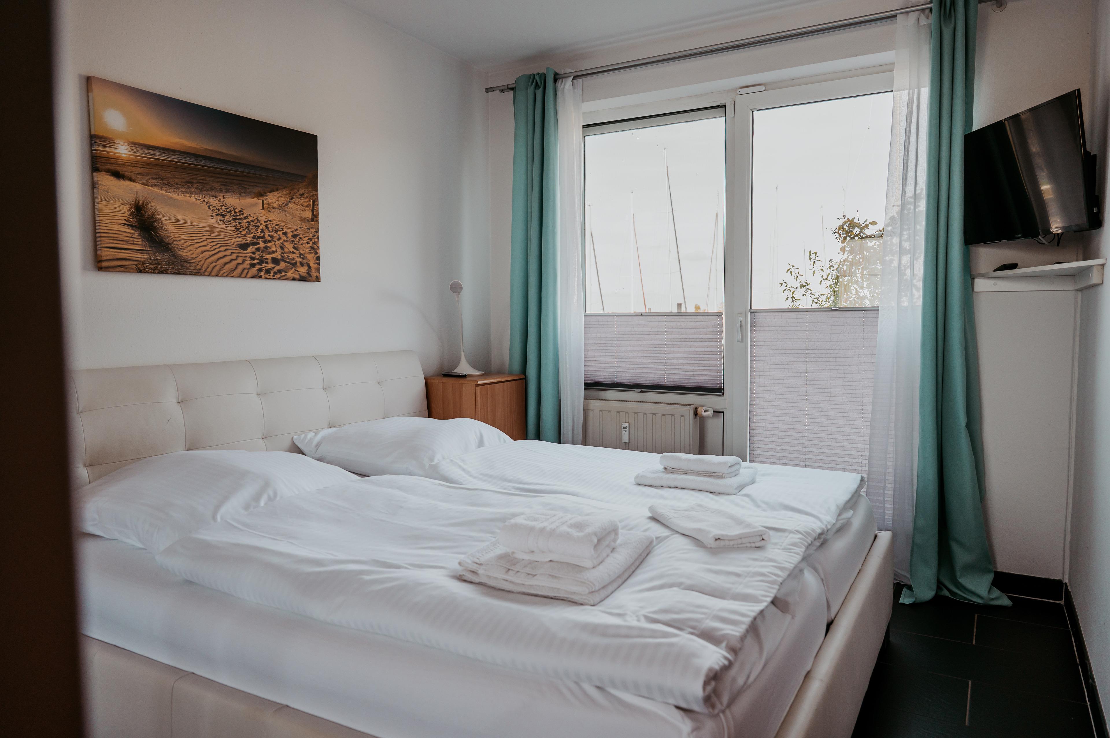 Bei der Ferienwohnung Pier handelt es sich um eine hochwertig eingerichtete, maritim geprägte Nichtraucherwohnung, die sich auf 57 Quadratmetern erstreckt. Auf der Terrasse, welche gen Südwesten ausgerichtet ist, stehen Ihnen Gartenstühle, ein Tisch und ein Sonnenschirm zur Verfügung. Ein Schlafzimmer und die Küche liegen zum Innenhof. Vom anderen Schlafzimmer und vom Wohnzimmer sowie von der Terrasse hat man einen besonderen Ausblick auf die Hafeneinfahrt der Marina.
