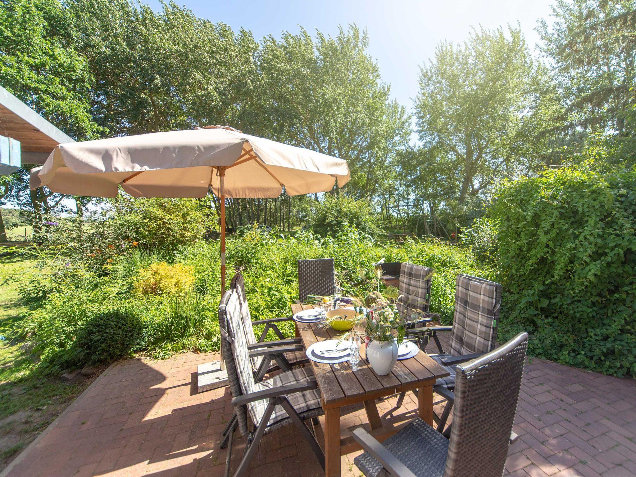 Im Garten befinden sich für die Gäste eine eigene Terrasse mit Sitzgelegenheiten und Grill.