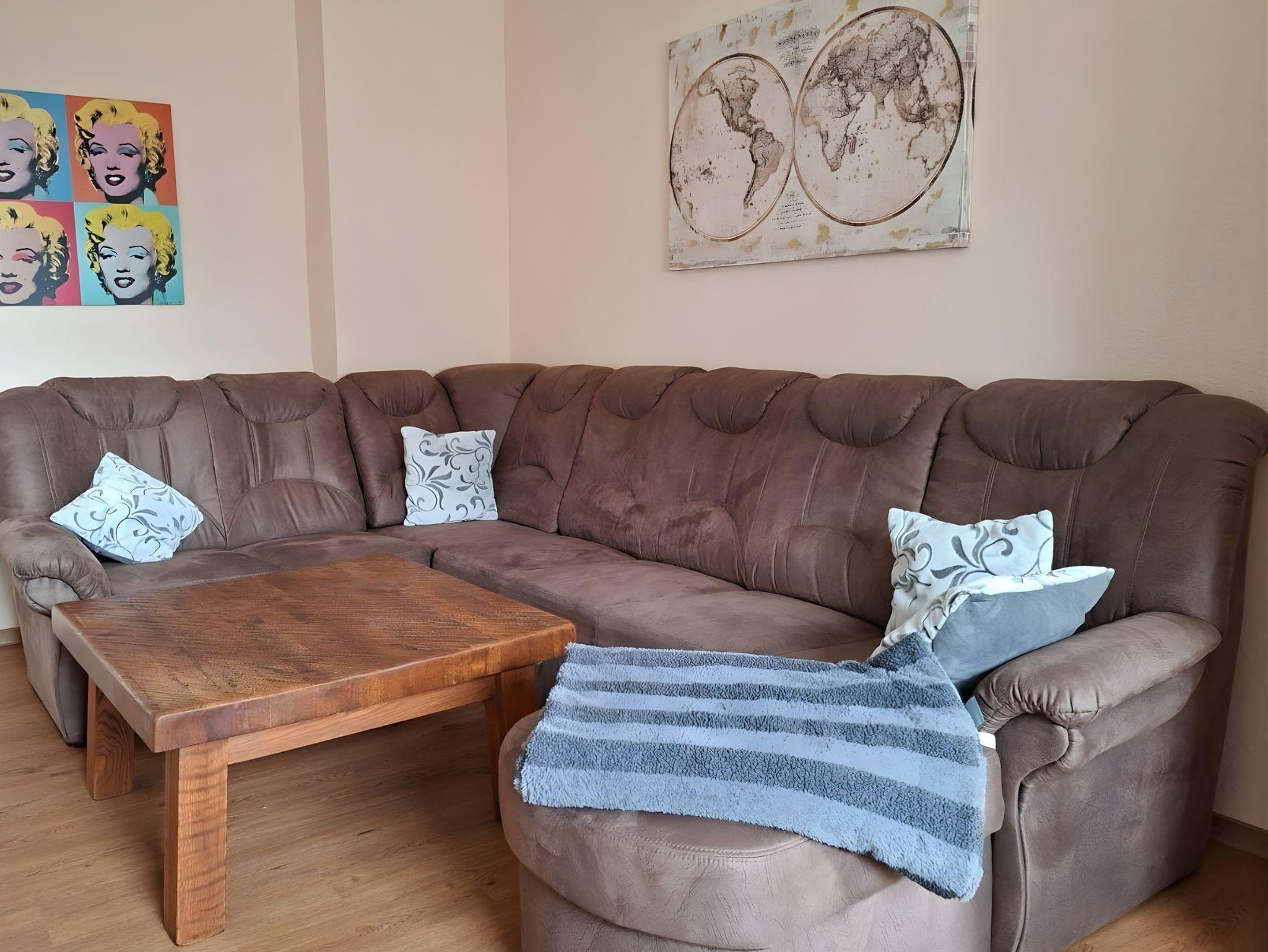 In dieser großzügigen Ferienwohnung genießen Sie einen entspannten Urlaub in gemütlicher Atmosphäre. Das Wohnzimmer mit ausziehbarer Eckcouch lädt zum Verweilen und zu geselligen Abenden ein. Bei Bedarf bietet es zusätzlichen Schlafplatz für Familien oder Freunde.