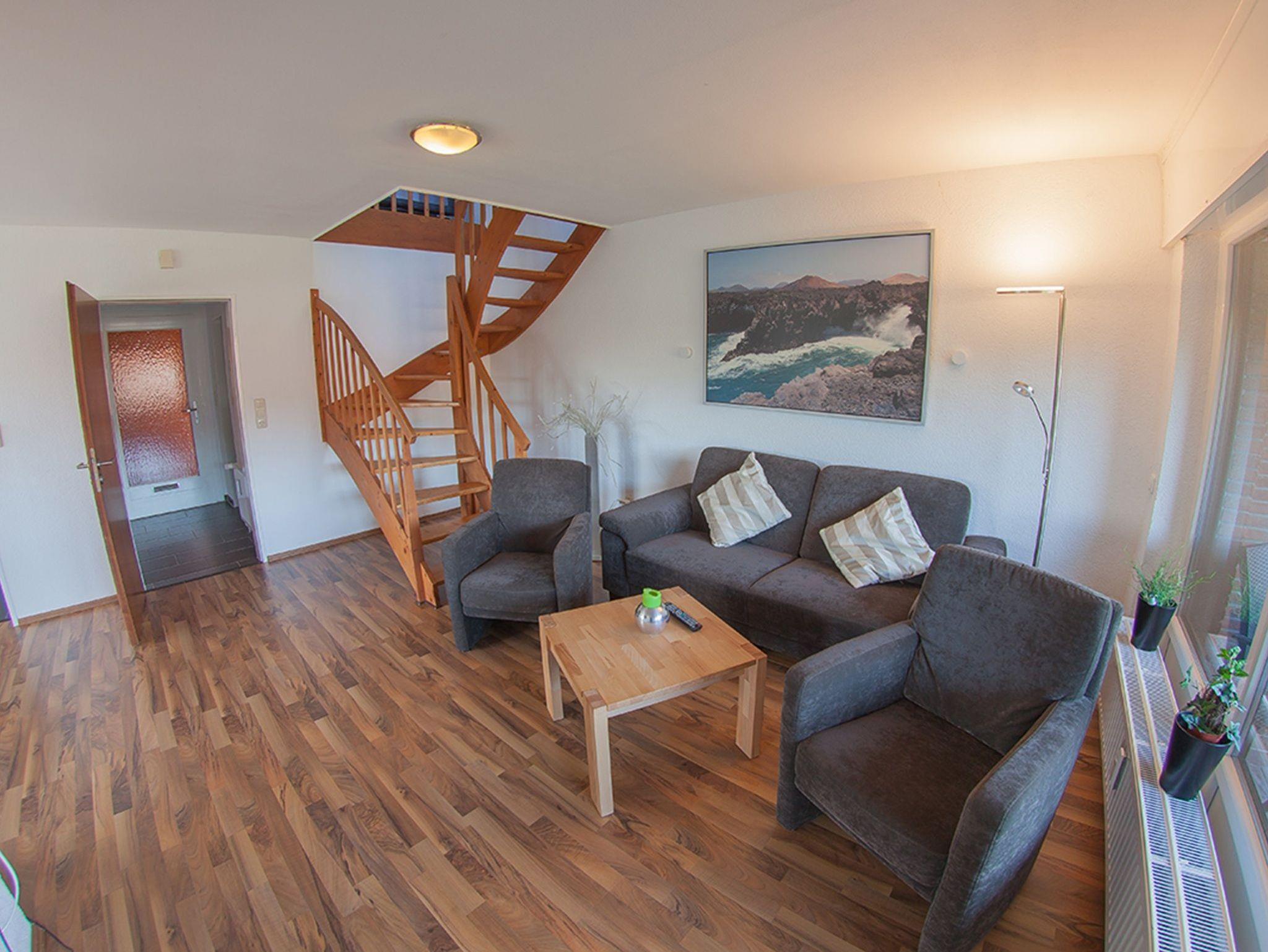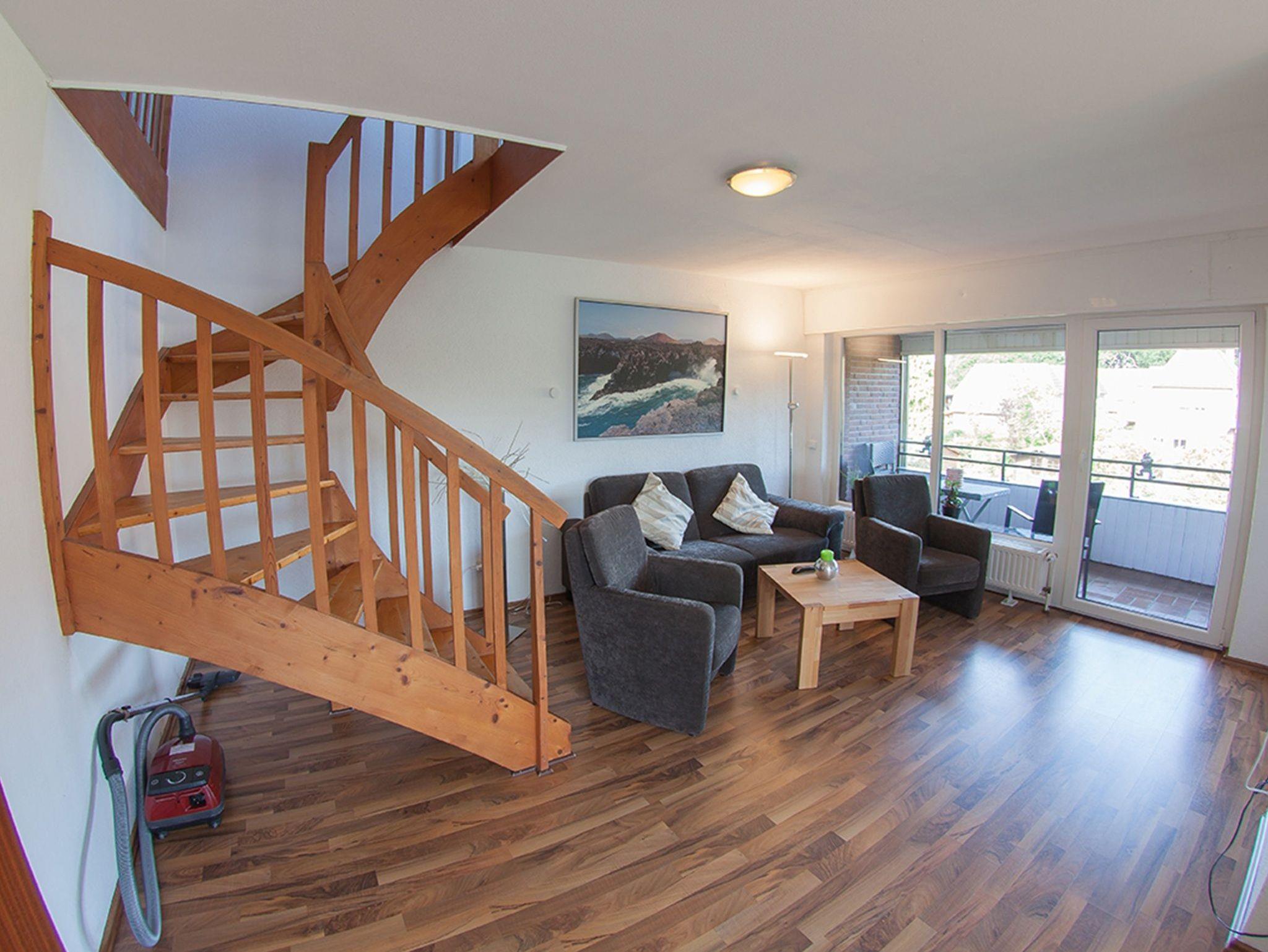 Das Acht-Parteienhaus Hollwert 8 befindet sich in einem reinen Wohngebiet ruhig gelegen circa 400 Meter vom Kurhausstrand. Hier erwartet Sie im erste Obergeschoss die geschmackvoll eingerichtete Ferienwohnung Nordseeluft ihre Gäste. Im großzügigen Eingangsbereich mit Garderobe befindet sich links das moderne Duschbad. Geradeaus weiter geht es in den Wohn/Essbereich mit wandhängendem TV, einer komplett ausgestatteten separaten Küche sowie dem Doppelschlafraum - mit Rollläden versehen. Über eine Holztreppe erreichen Sie das großzügig ausgebaute, möblierte Dachstudio mit zwei Einzelbetten und Ausstattung für Kinder/Jugendliche. Achtung: das Dachfenster hat keine Verdunklungsmöglichkeit! Ein schöner Balkon zur Süd-Westseite mit Mobiliar ist ebenfalls vorhanden.