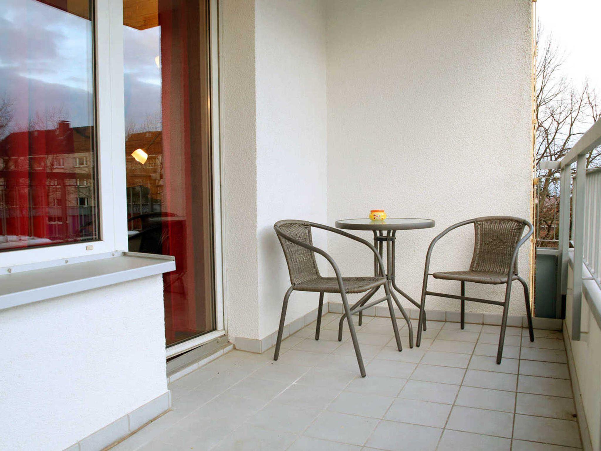 Der Süd-Balkon mit Tisch und Stühlen lädt zum Verweilen in der Sonne ein.