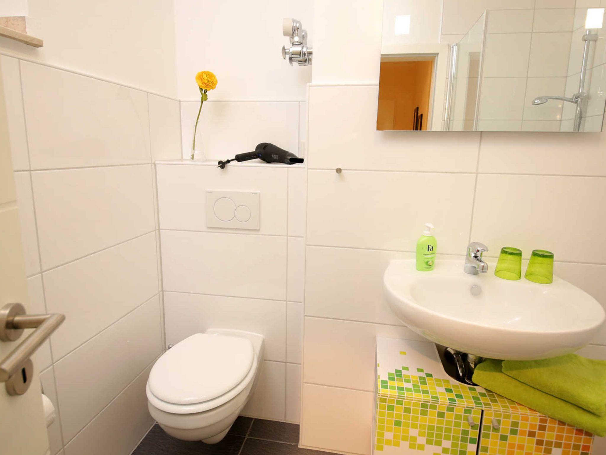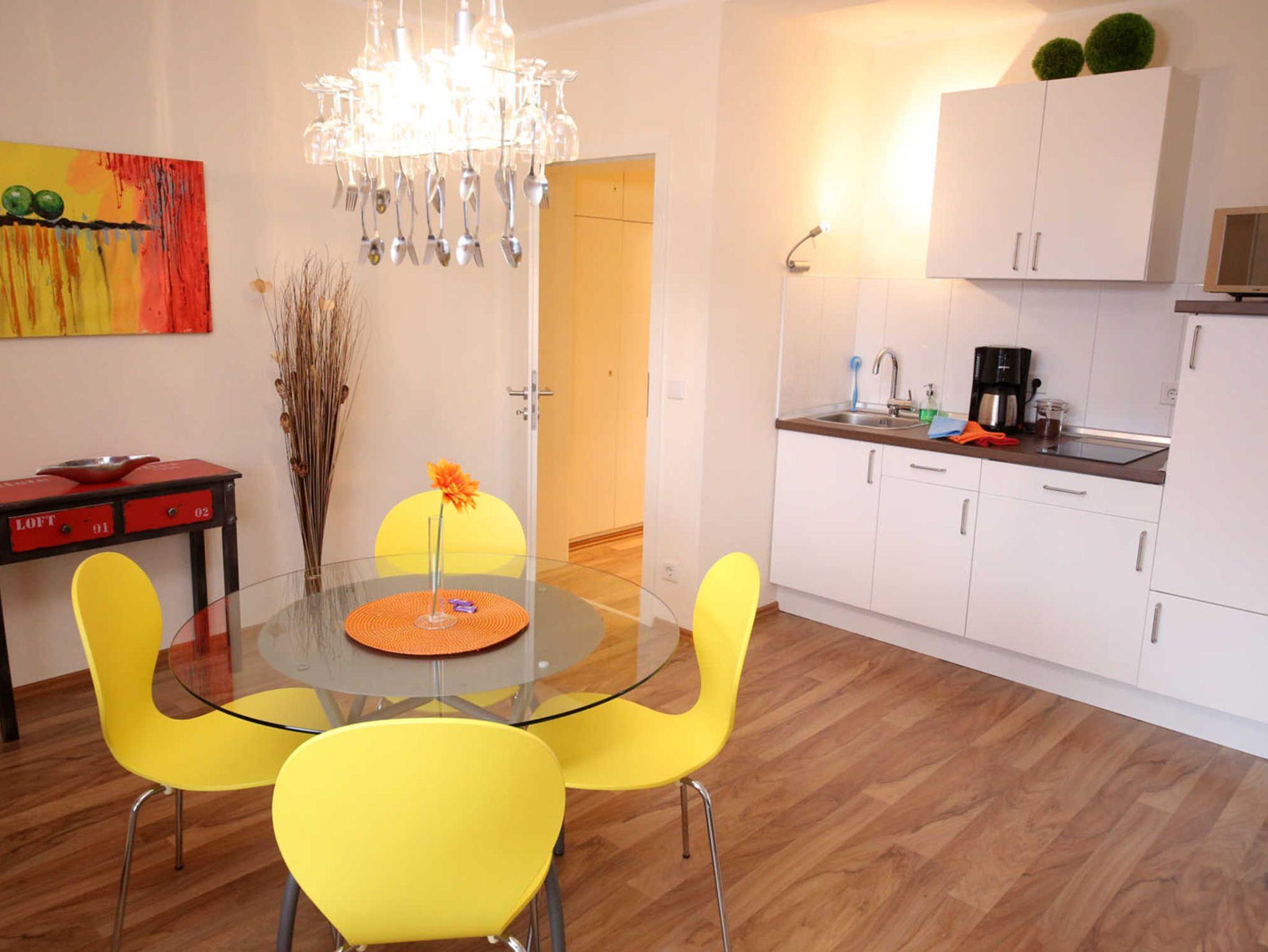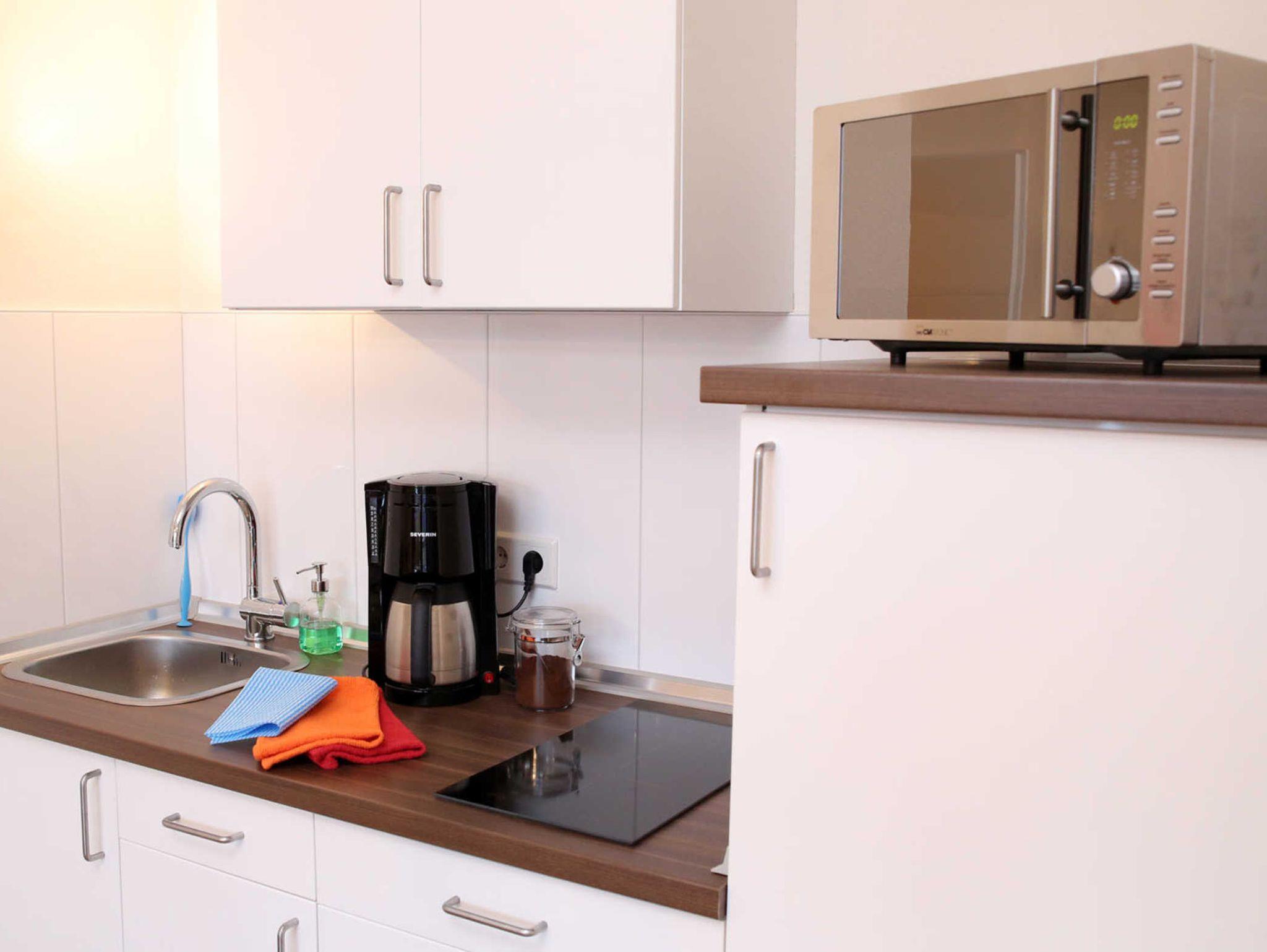 Der Koch-/Ess-Bereich wurde mit einer modernen Küchenzeile ausgestattet (u. a. mit Mikrowelle mit Grillfunktion), das Bad mit Dusche/WC und Handtuchheizung.