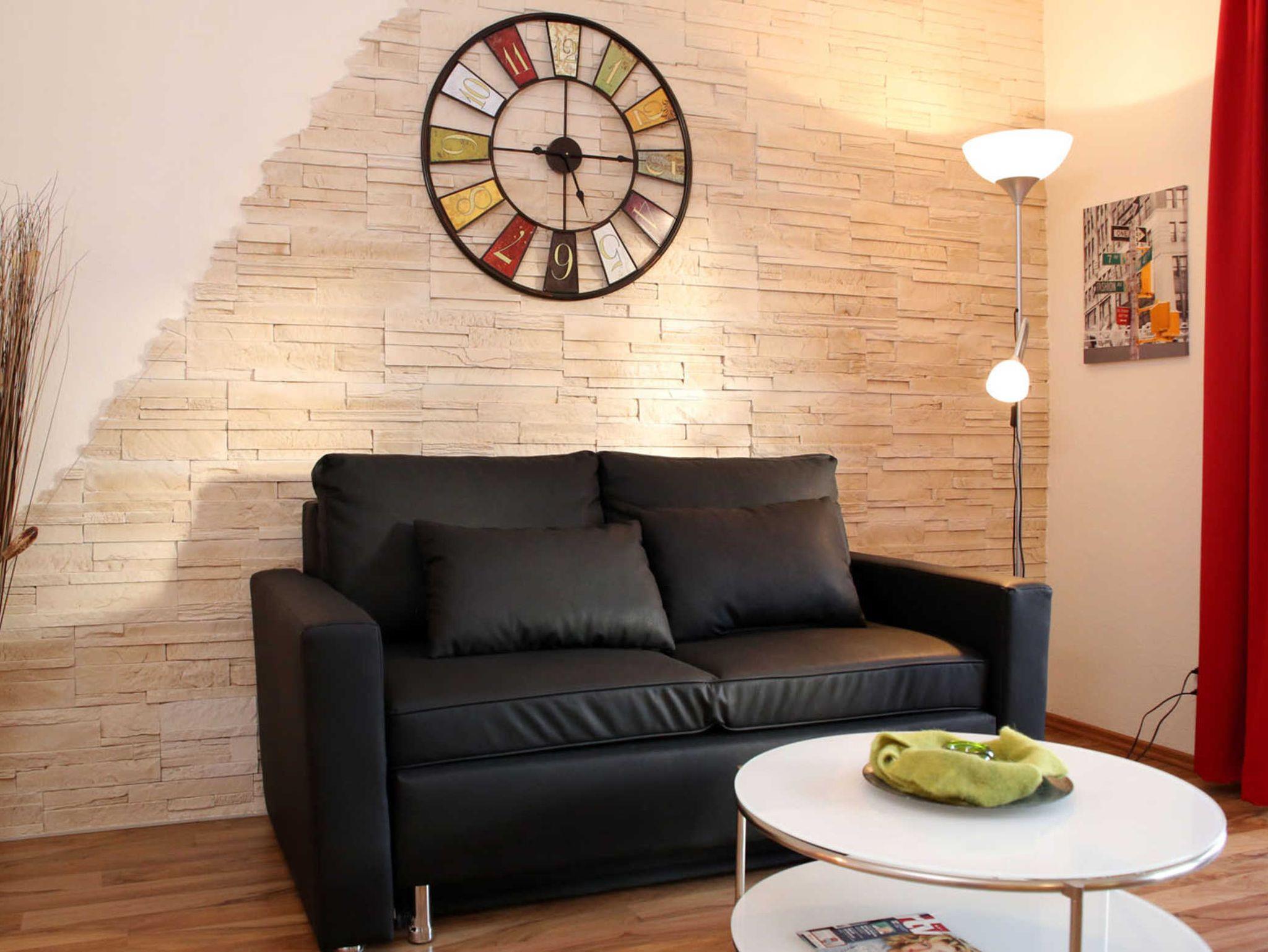 Das Wohnzimmer ist mit einer bequemen, ausziehbaren Schlafcouch ausgestattet, mit Flachbild-TV, DVD-Player und Hifi-Anlage.