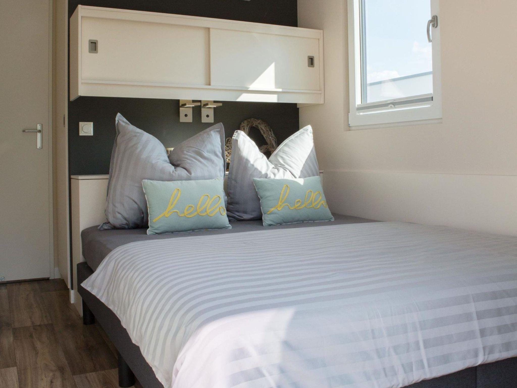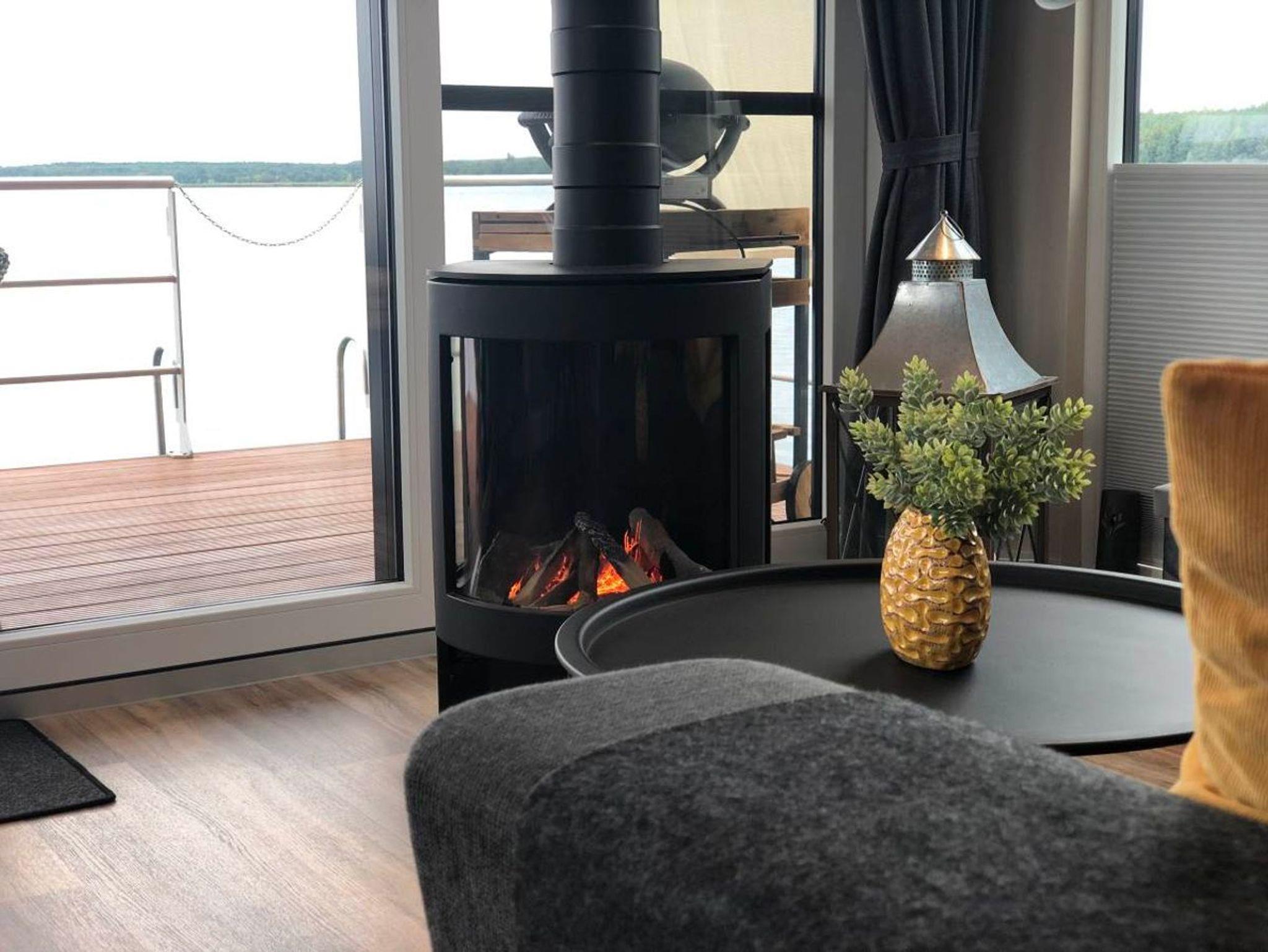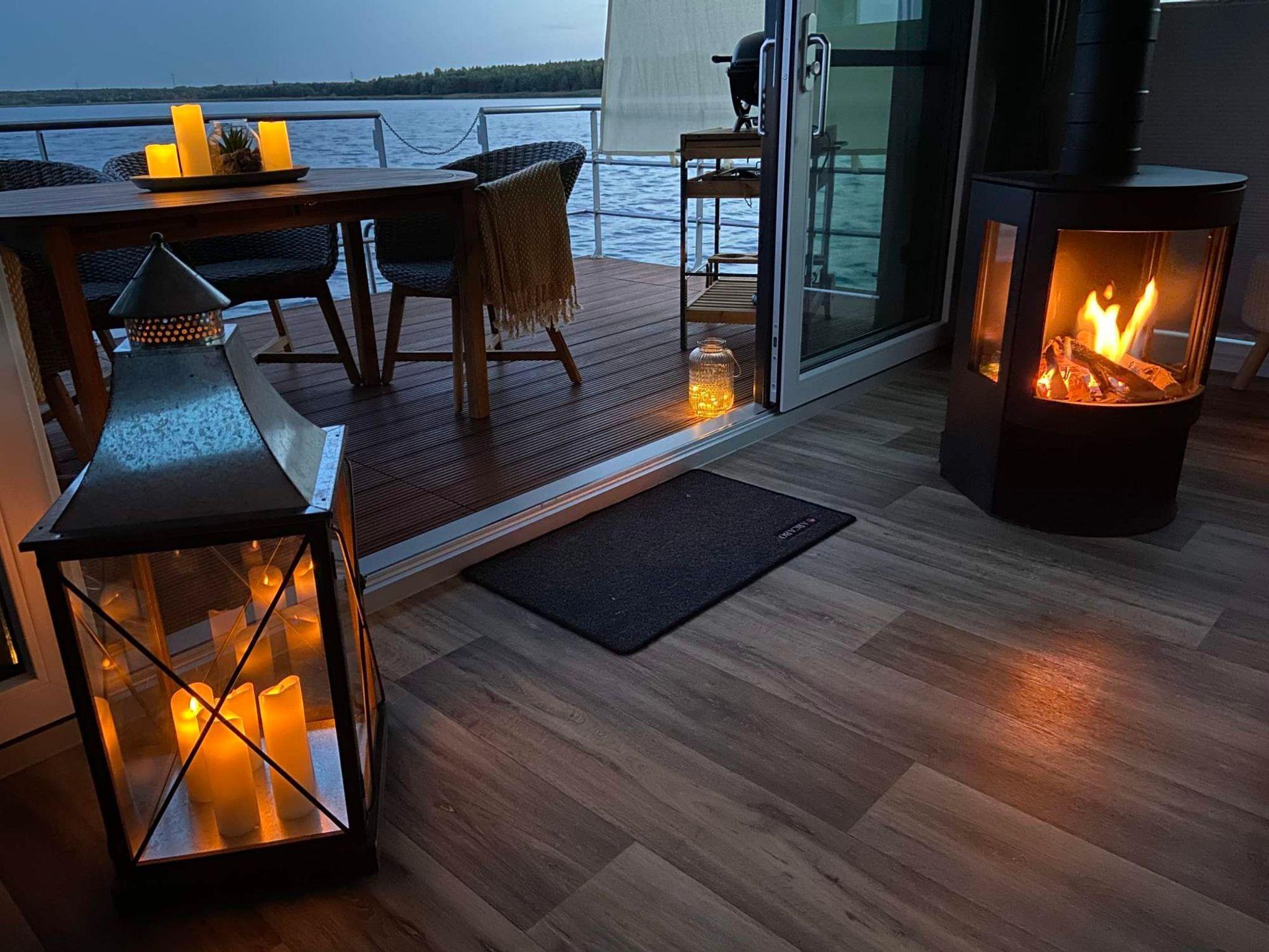 Das schwimmende Ferienhaus verfügt über zwei separate Schlafzimmer mit je einem Doppelbett, ein gefliestes Badezimmer mit Waschtisch und Dusche, sowie ein extra WC mit Waschbecken, eine vollausgestattete Küchenzeile, Panorama-Wohnzimmer mit Gas-Kamin* und alles andere, was Sie für eine schöne Zeit auf dem Wasser benötigen. Die drei abgeschlossenen Innenräume und zwei Terrassen bieten ausreichend Rückzugsmöglichkeiten, um in Ruhe Kraft zu tanken und die Sonne und das Wasser zu genießen.