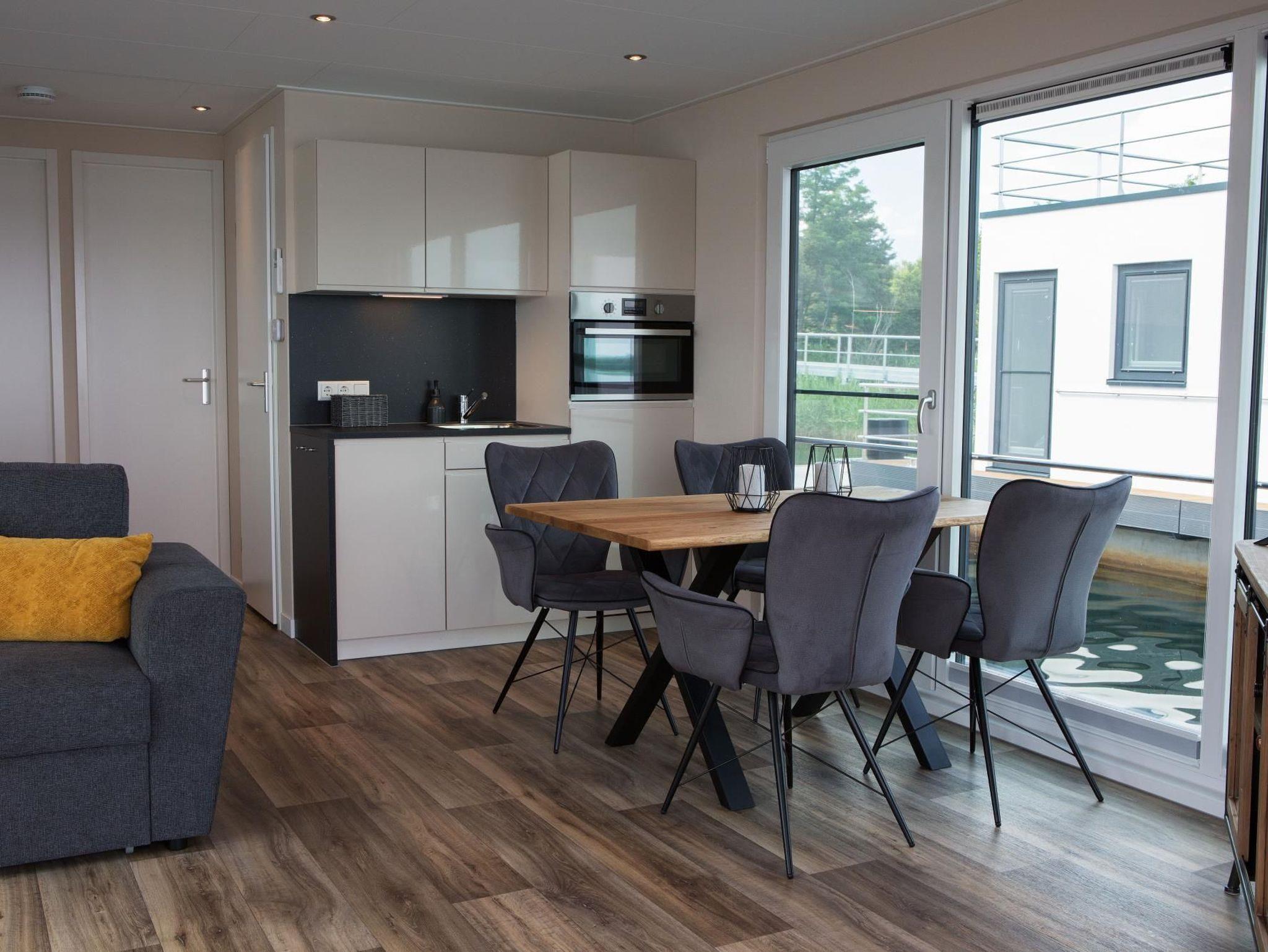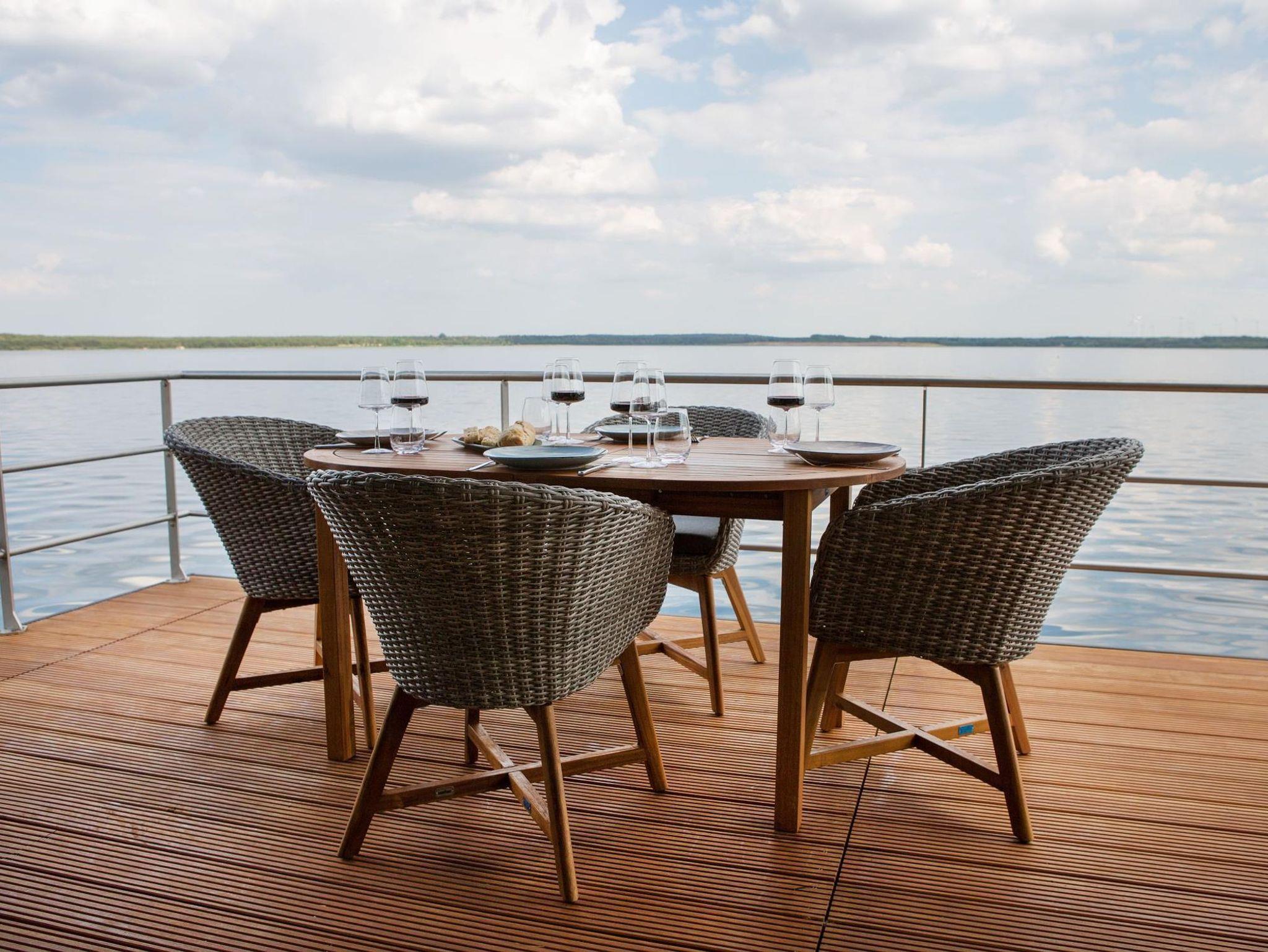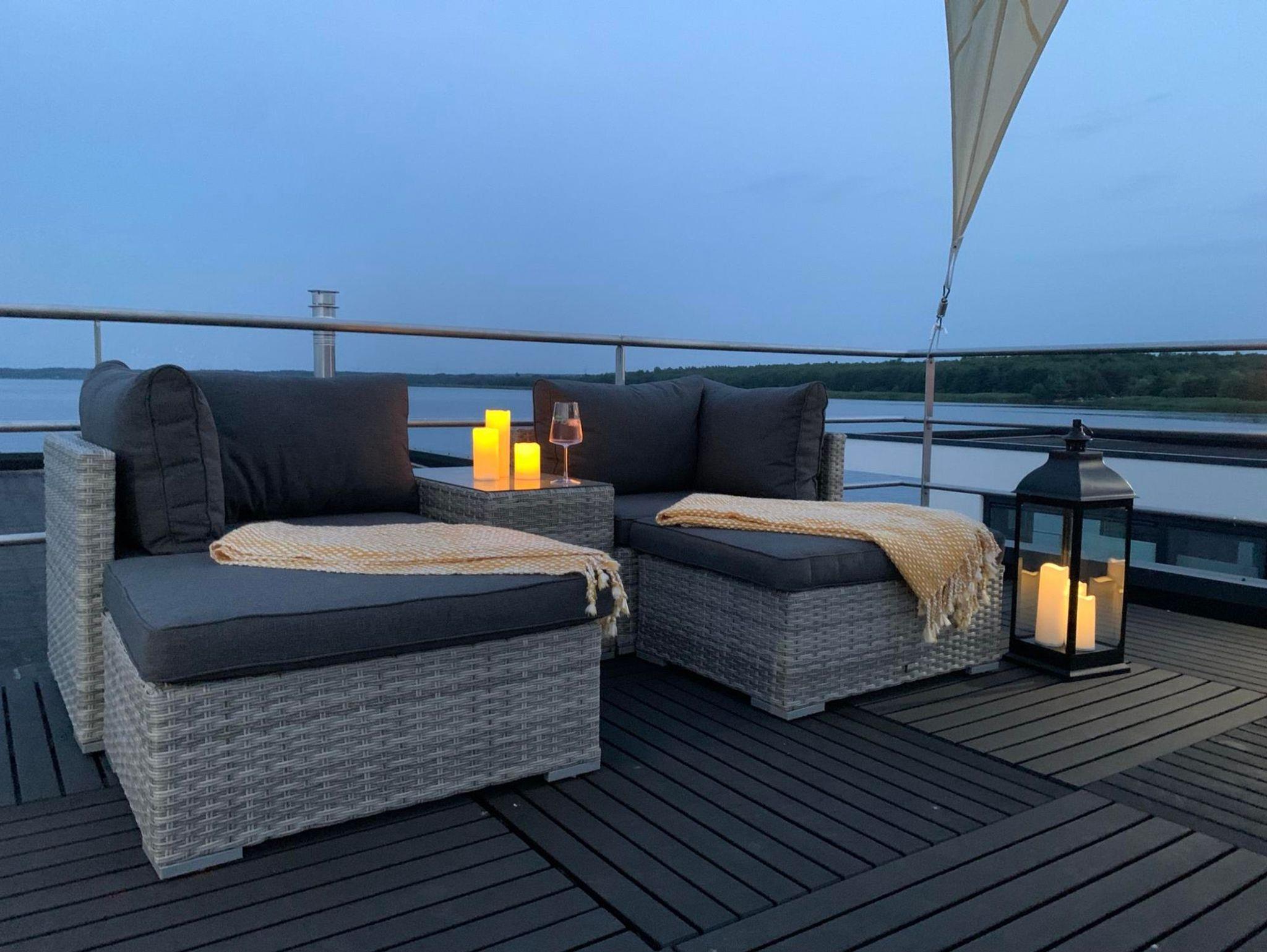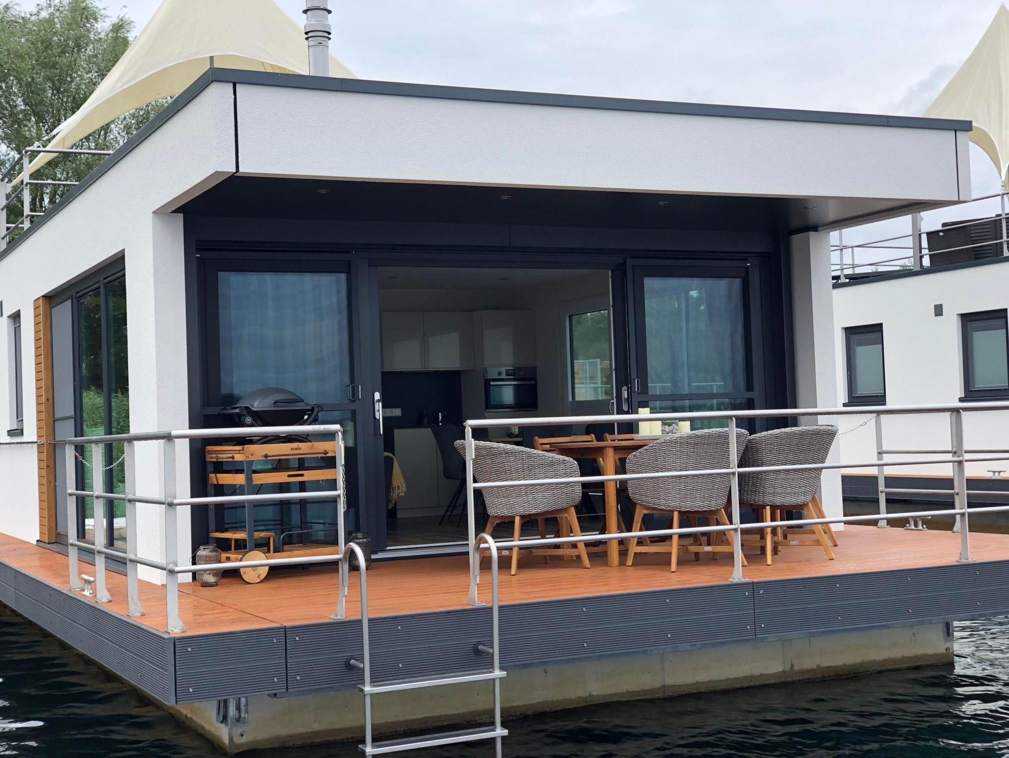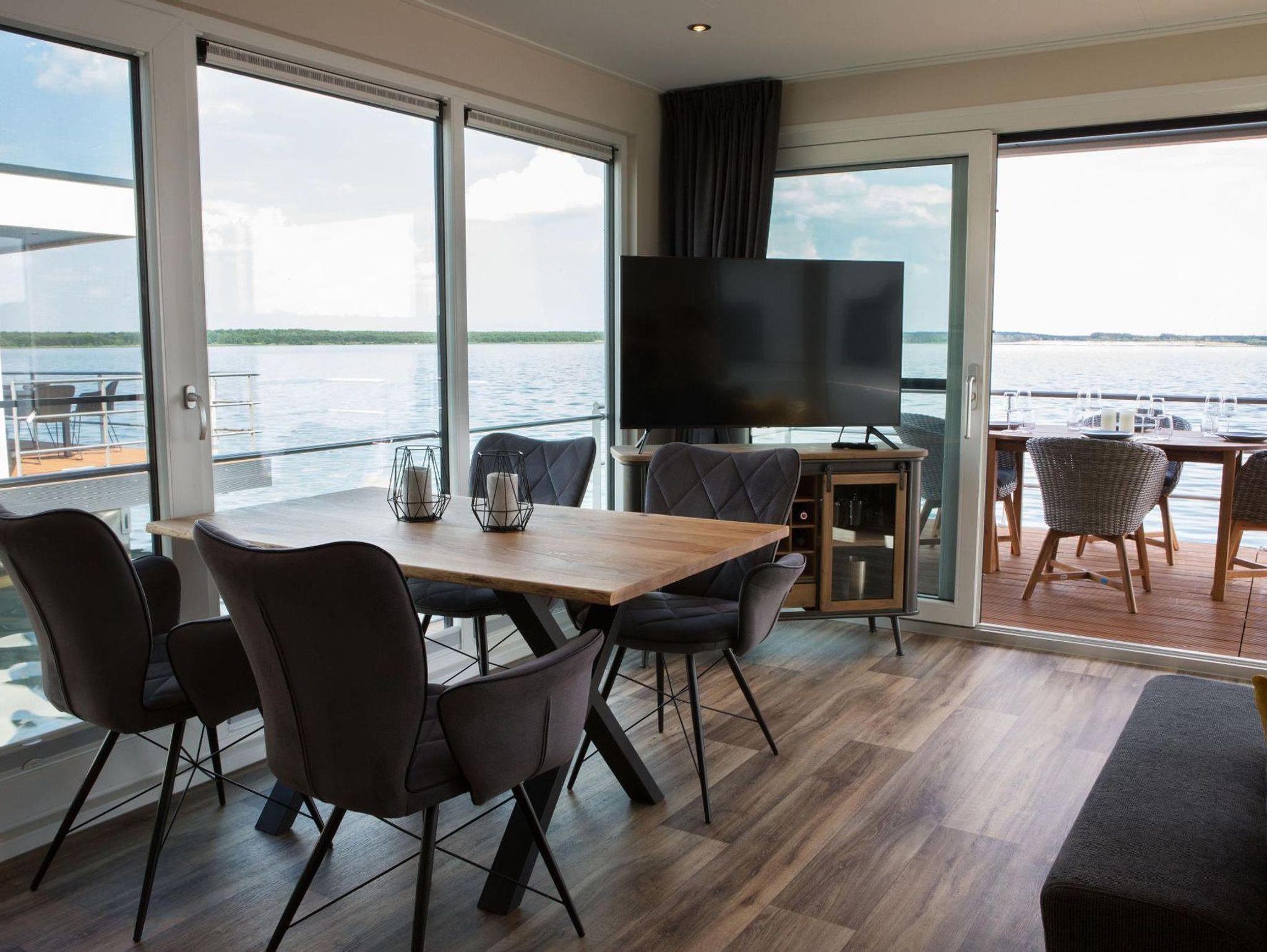 Die technisch ausgereifte Ausstattung bietet praktischen Komfort und jede Menge Annehmlichkeiten für ein Ferienhaus auf dem Wasser und bietet Platz für bis 4 Personen. Auf 44 m² Wohnfläche und mit einer modernen Heizungs-/Klima-Technik ausgestattet, ist es an kalten und heißen Tagen immer angenehm. Auf der 15 m² großen Terrasse am Bug oder der 25 m² großen Terrasse auf dem Oberdeck kann man die Natur pur rund um die Uhr genießen.