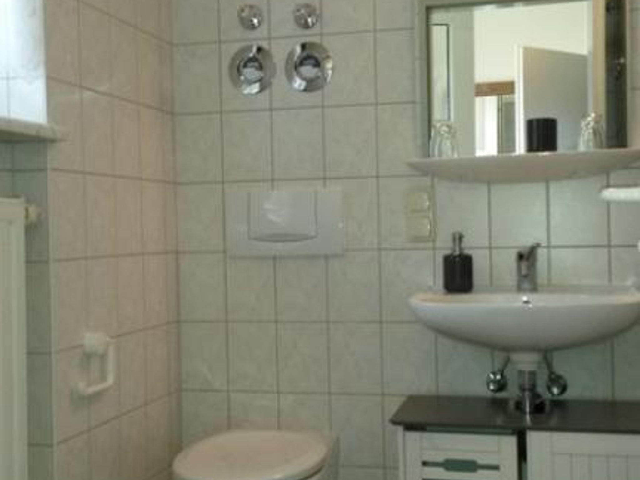 Badezimmer: mit Fenster, Dusche, Waschbecken, Waschbeckenunterschrank, WC, Fön, Kinder-WC-Sitz und Kinderhocker.