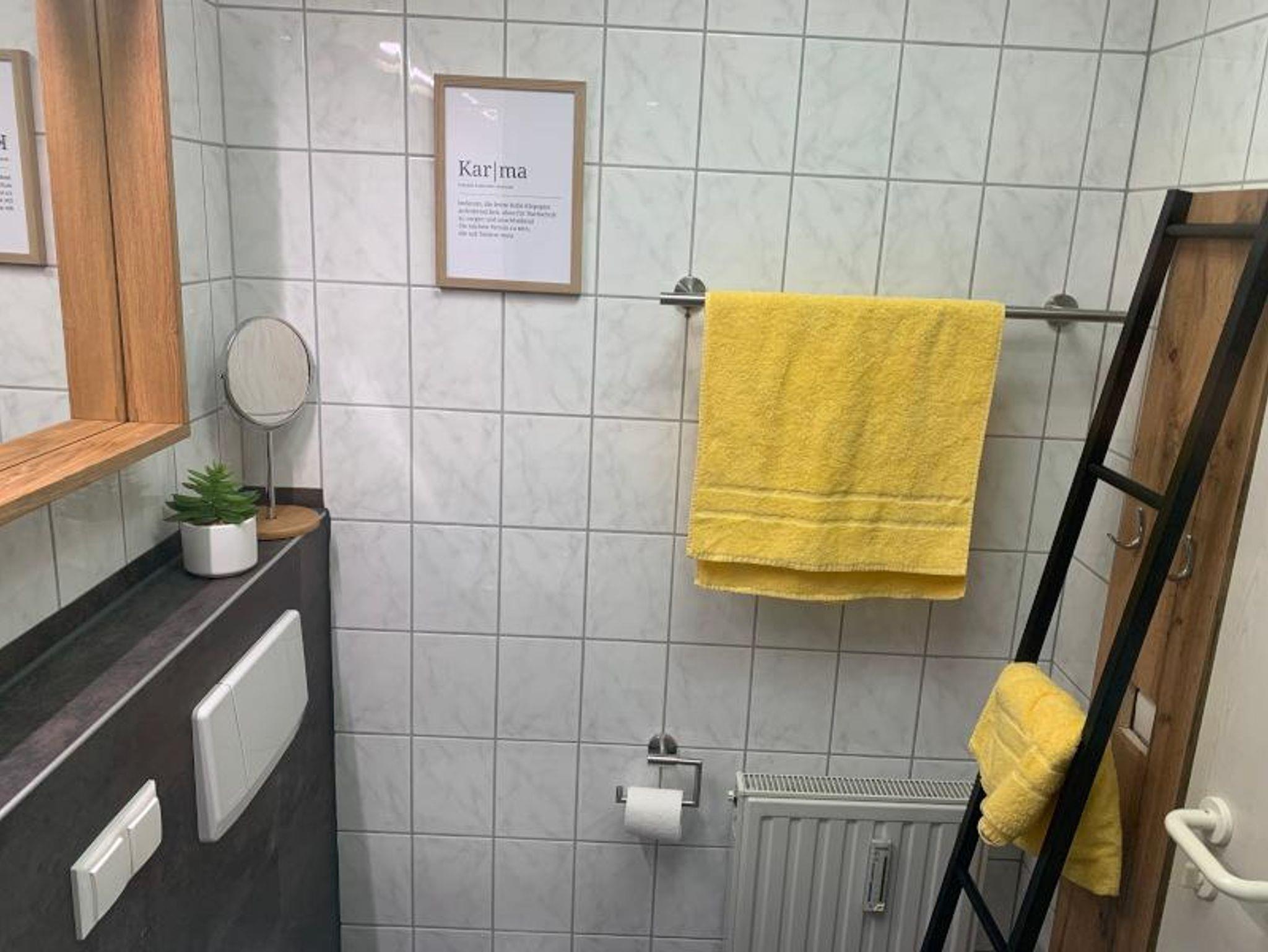 Das renovierte, funktionale Badezimmer ist mit einer Regendusche ausgestattet. Zur Grundausstattung gehören ein Fön und Kosmetikspiegel.