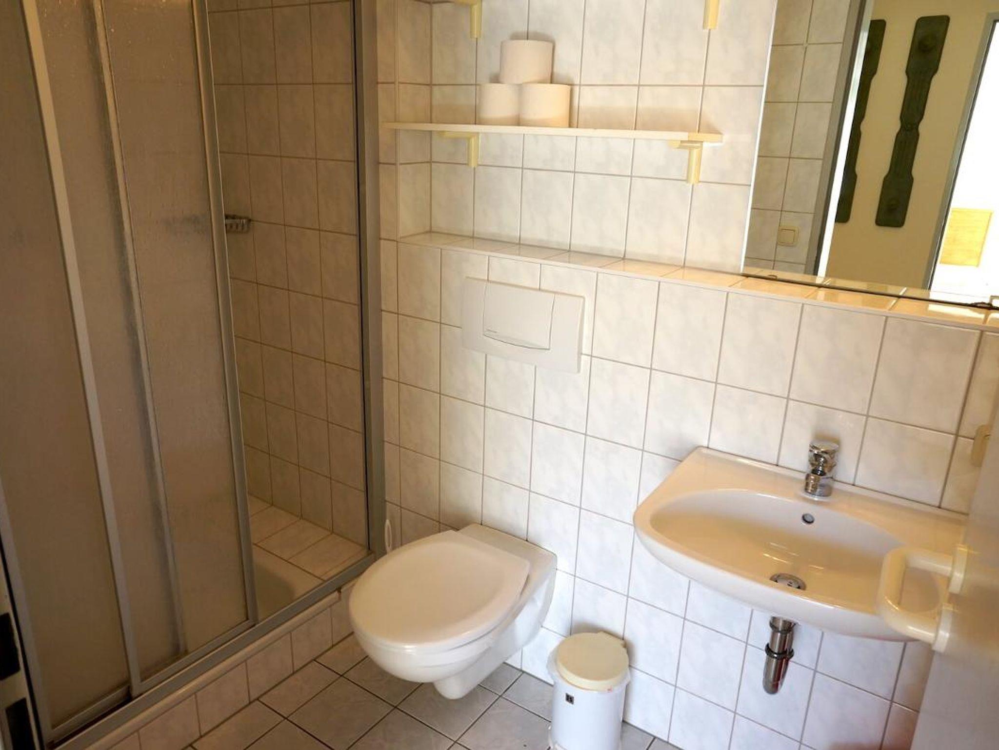eine Badewanne mit Duschvorrichtung und WC. Außerdem haben Sie einen