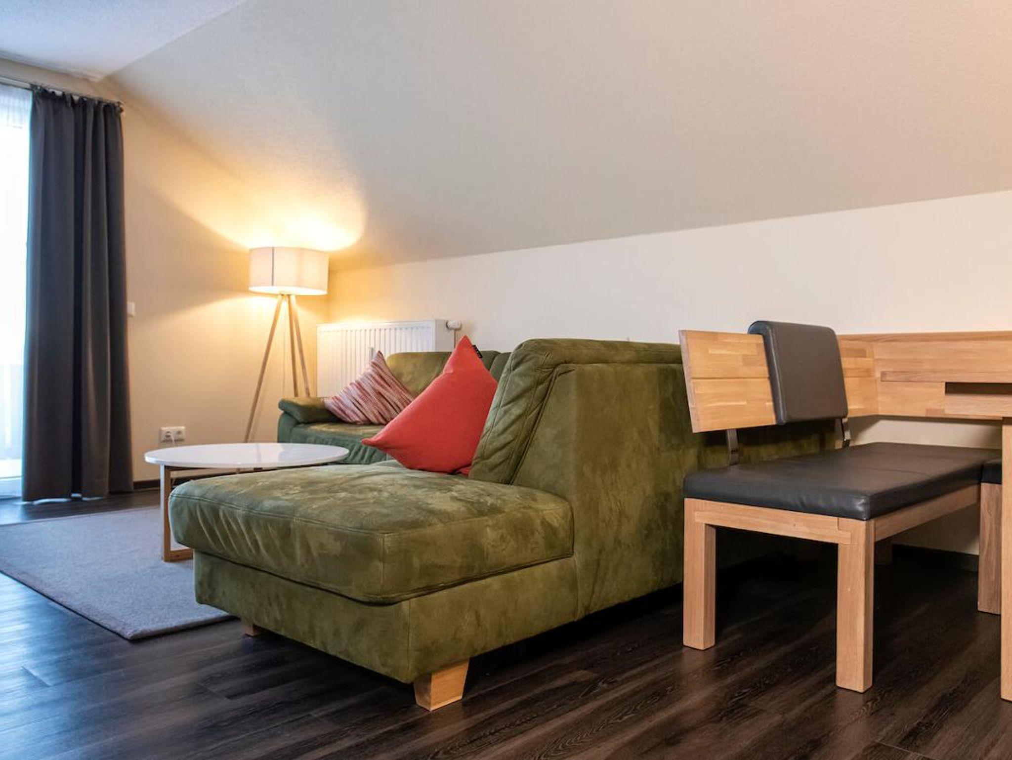 Wohn-Schlafraum mit bequemer Doppelbettcouch und voll ausgestatteter