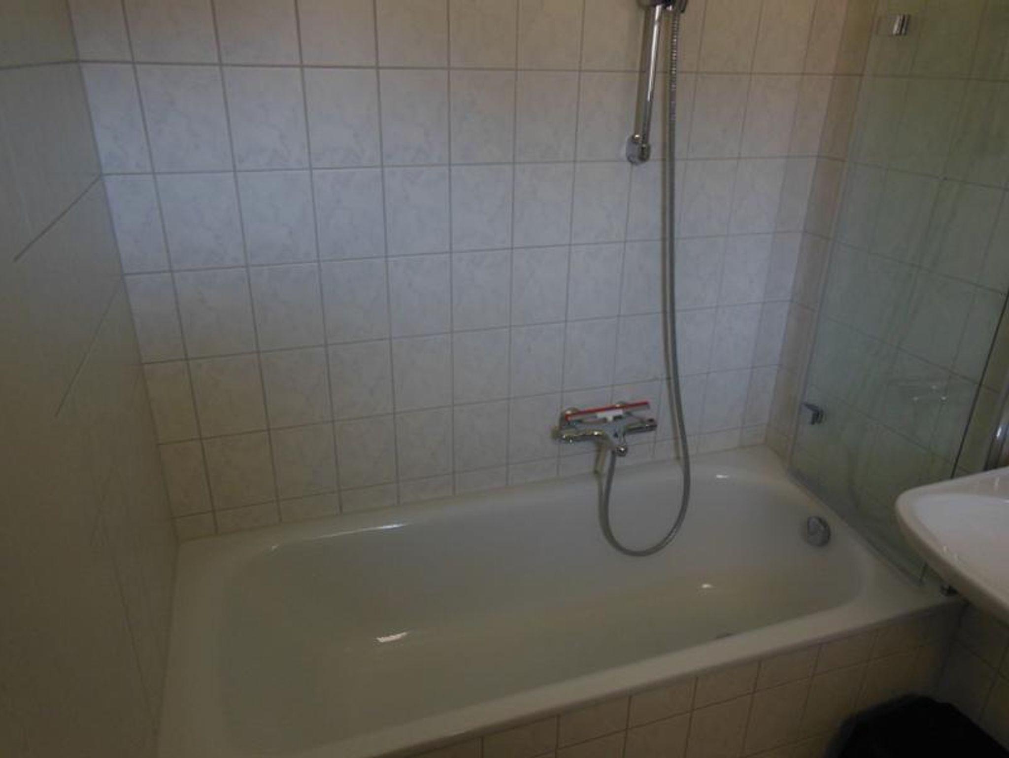 Das funktionale Badezimmer bietet eine Badewanne, welche mit Hilfe einer Glasduschwand auch als Dusche genutzt werden kann.