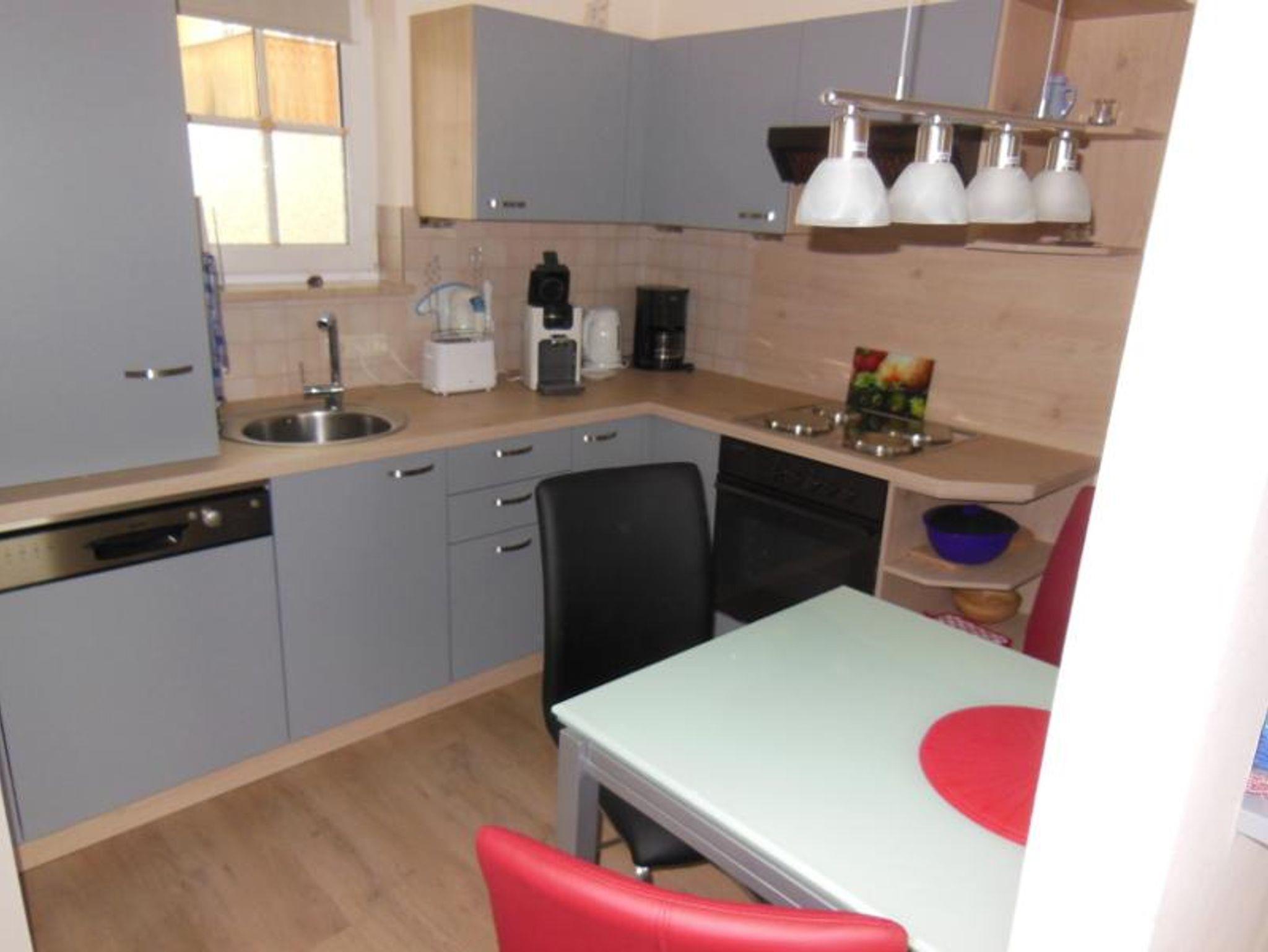 Die neue Küche mit Essecke beinhaltet neben einem Kühlschrank mit Gefrierfach, eine Spülmaschine und einen Herd mit Backofen.
