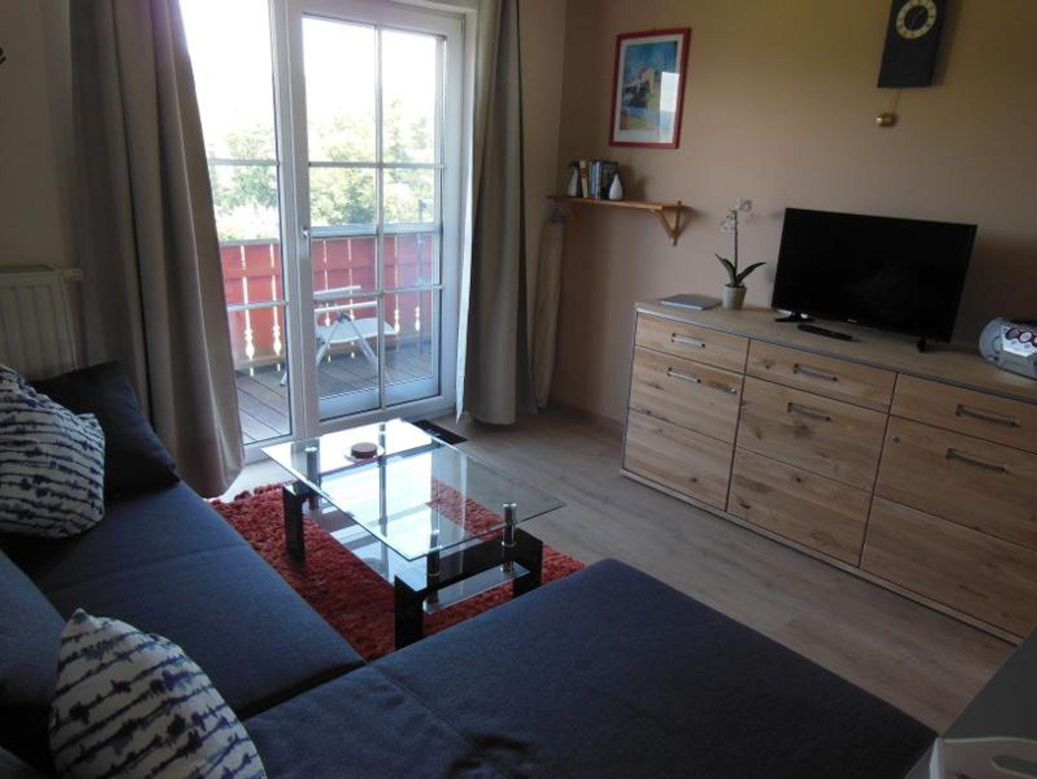 Im Wohnzimmer steht eine moderne Couch, die als Doppelliege ausziehbar ist, ein Glastisch, LCD Fernseher und ein MP3/ CD Player mit Radio zur Verfügung.