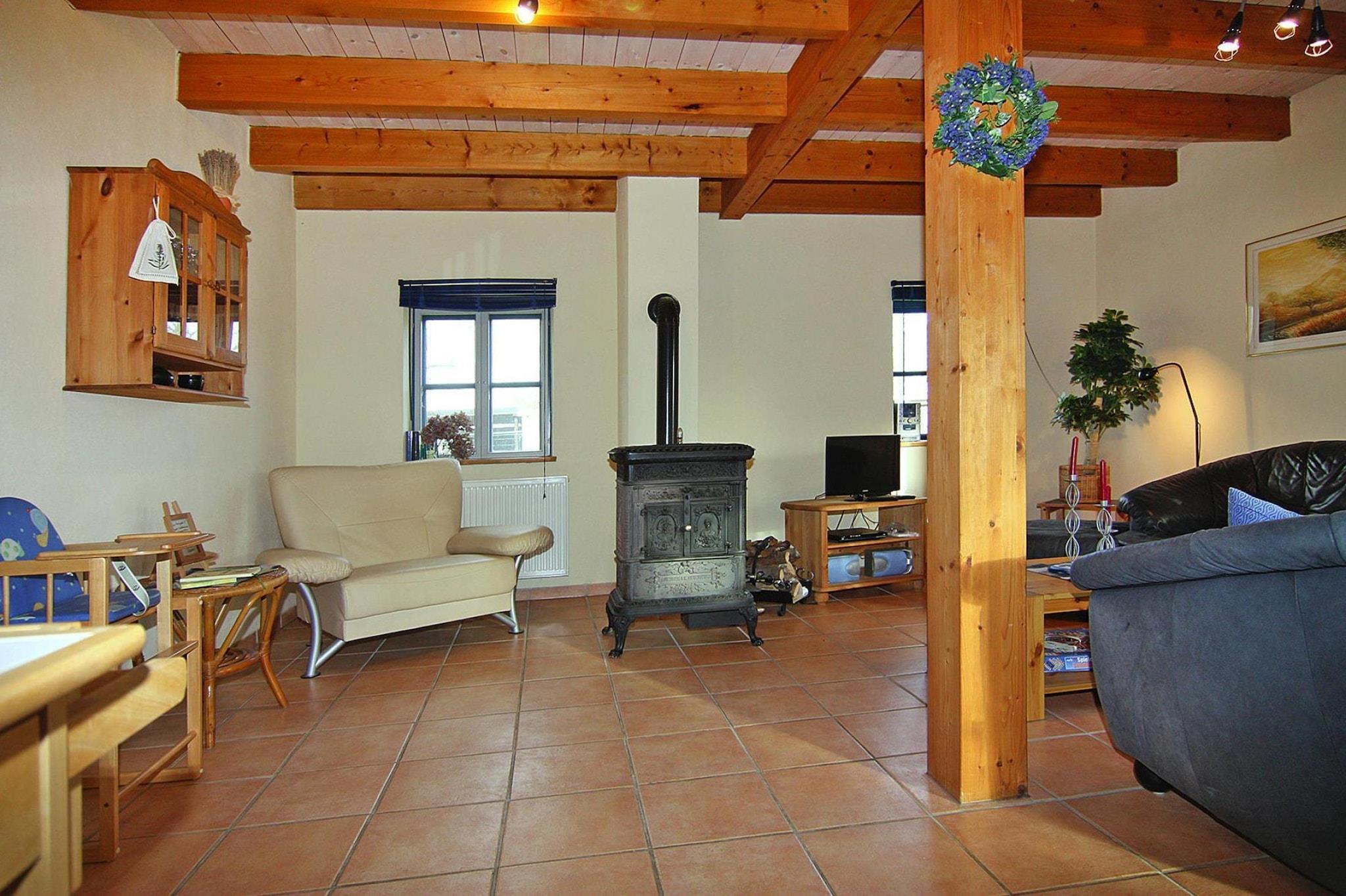 Parterre: (offene Küche(Esstisch, Kochplatte(4 Kochplatten, Ceranfeld), Toaster, Kaffeemaschine(cups), Backofen, Mikrowelle, Spülmaschine, Tiefkühlschrank, Kühl-/Gefrierkombination), Wohn/Esszimmer(TV(Satellit), Kaminofen, Radio, CD-Spieler), Badezimmer(Dusche, Toilette, Föhn)) In der 1. Etage: (Schlafzimmer(Doppelbett), Schlafzimmer(Einzelbett, Doppelbett)) Trockner(Gemeinschaftliche Nutzung mit anderen Gästen, gegen Gebühr), Sauna(Gemeinschaftliche Nutzung mit anderen Gästen, gegen Gebühr), Waschmaschine(Gemeinschaftliche Nutzung mit anderen Gästen, gegen Gebühr), Heizung, Terrasse, Fahrradabstellraum(Gemeinschaftliche Nutzung mit anderen Gästen), Gartenmöbel, Parkplatz, Trampolin(Gemeinschaftliche Nutzung mit anderen Gästen), Sonnenschirm, Tischtennisplatte(Gemeinschaftliche Nutzung mit anderen Gästen), Dart, Fitnessgeräte(Gemeinschaftliche Nutzung mit anderen Gästen), Hochstuhl, Spielzeug, Babybett (kostenlos), Handtücher/Bettwäsche (inklusive)