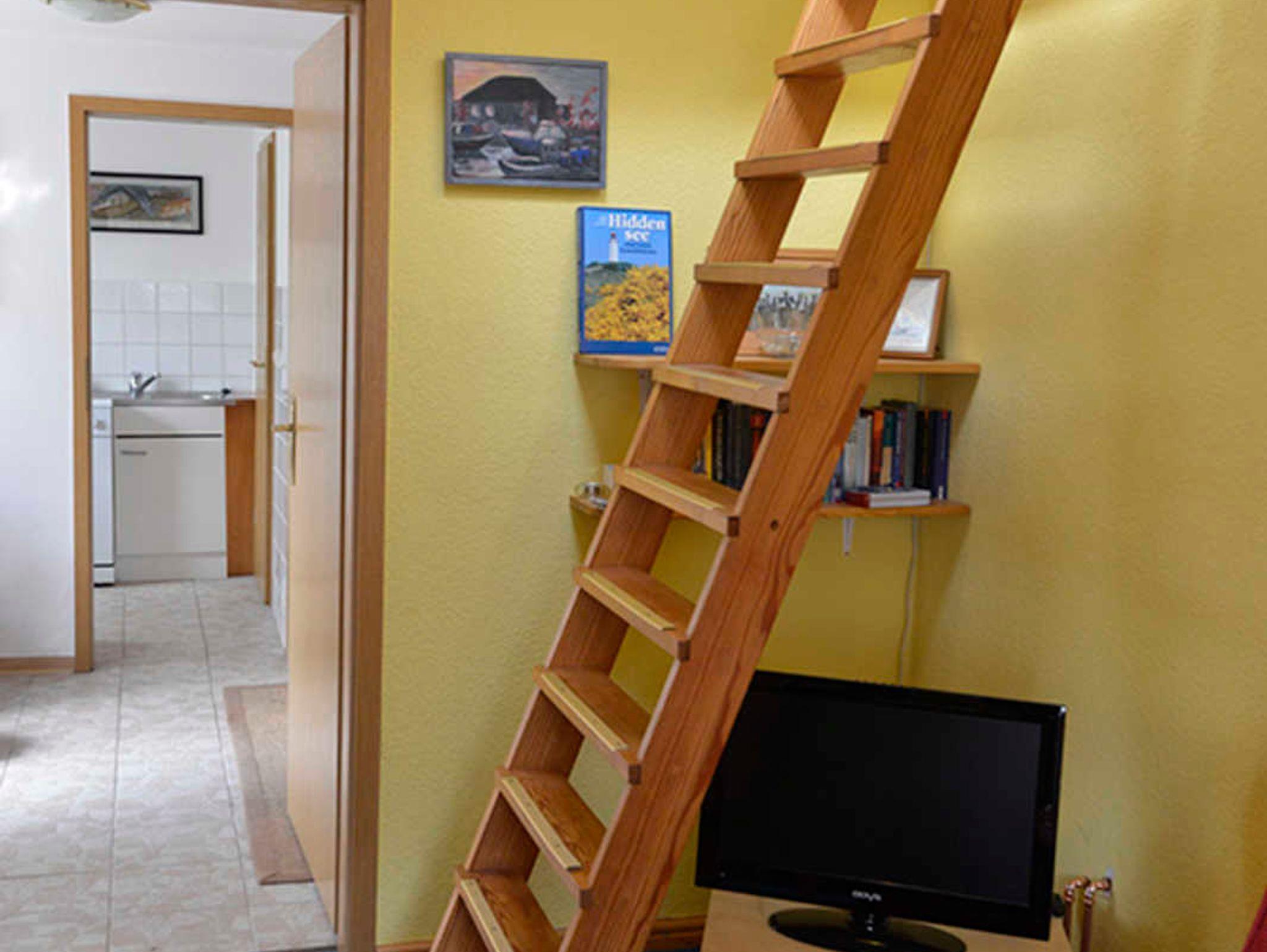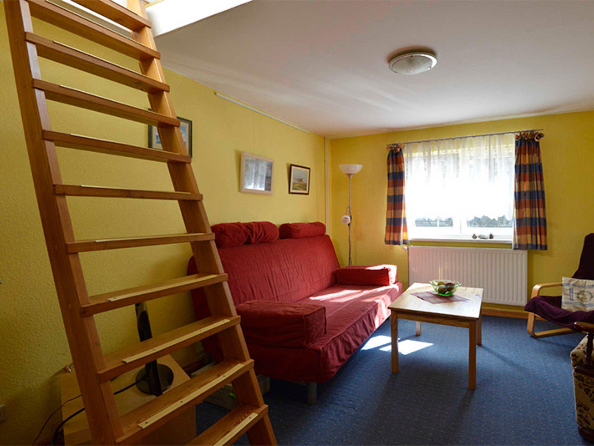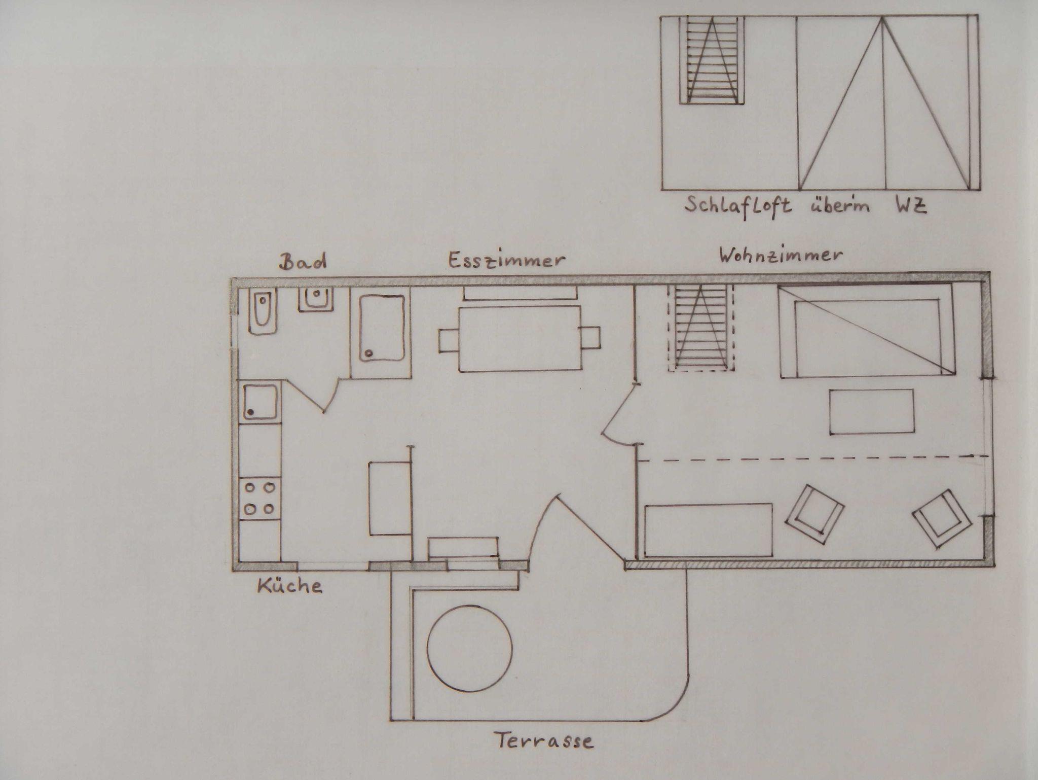 Vom Eingangsbereich nach rechts geht es durch eine Schiebetür ins Wohnzimmer. Das Fenster des Wohnzimmers liegt nach Süden. Der Raum kann auch als Schlafraum genutzt werden, das Sofa ist ausziehbar. Hier steht der Kleiderschrank, ein Fernseher und das Bücherregal. Über eine steile Stiege erreicht man den Schlafboden mit dem Doppelbett. Die Luke ist immer offen, so dass sich die Räume nicht trennen lassen. Oben gibt es ein Dachfenster mit Verdunkelungsrollo und Insektenschutzgitter. Diese beiden Zimmer sind mit Teppichboden ausgelegt.