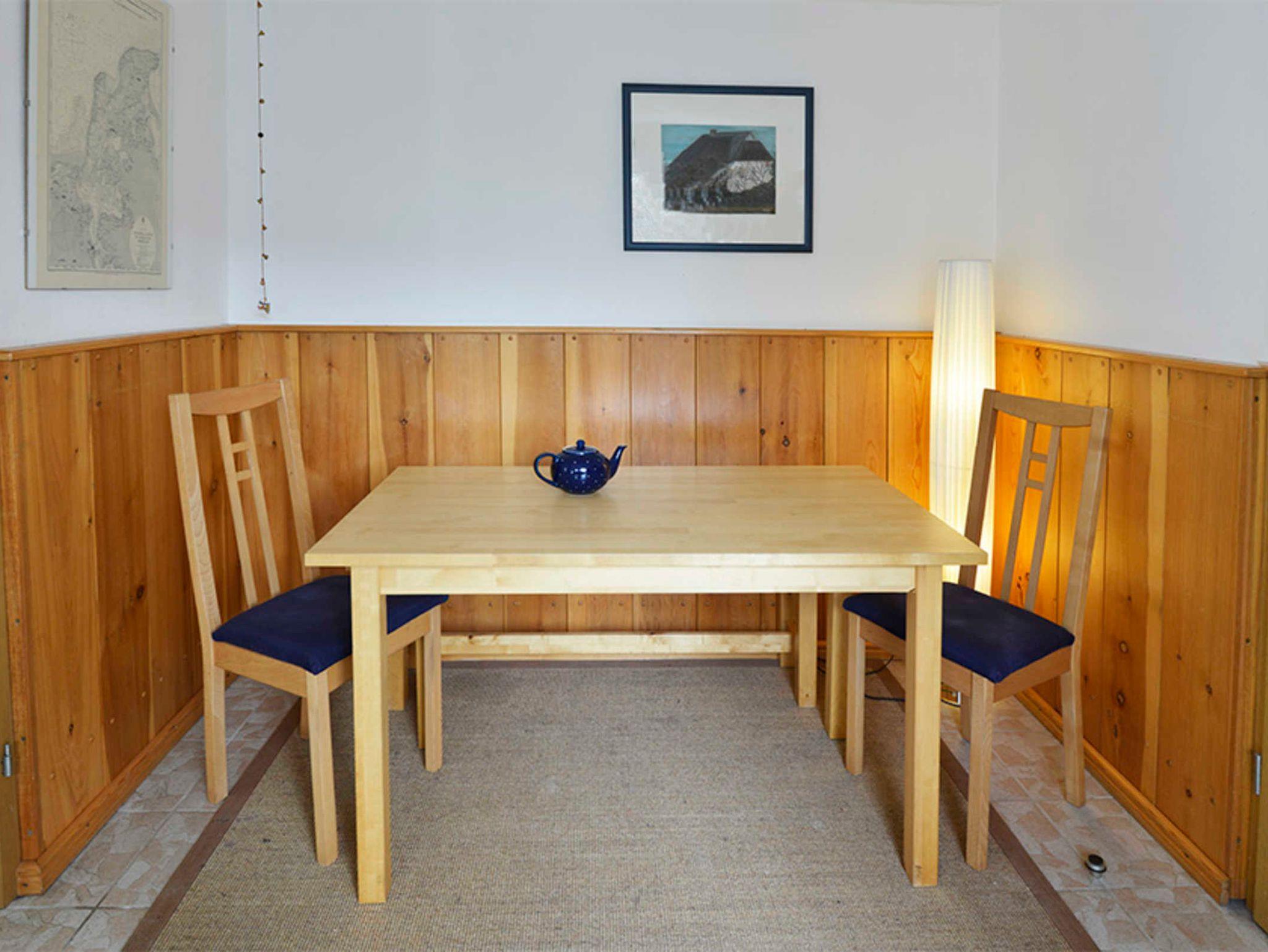 Im Eingangsbereich steht ein Esstisch mit 2 Stühlen und einer Bank. Im Schrank gibt es einige Gesellschaftsspiele.