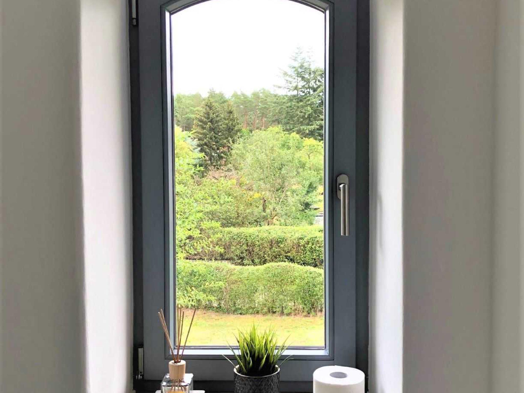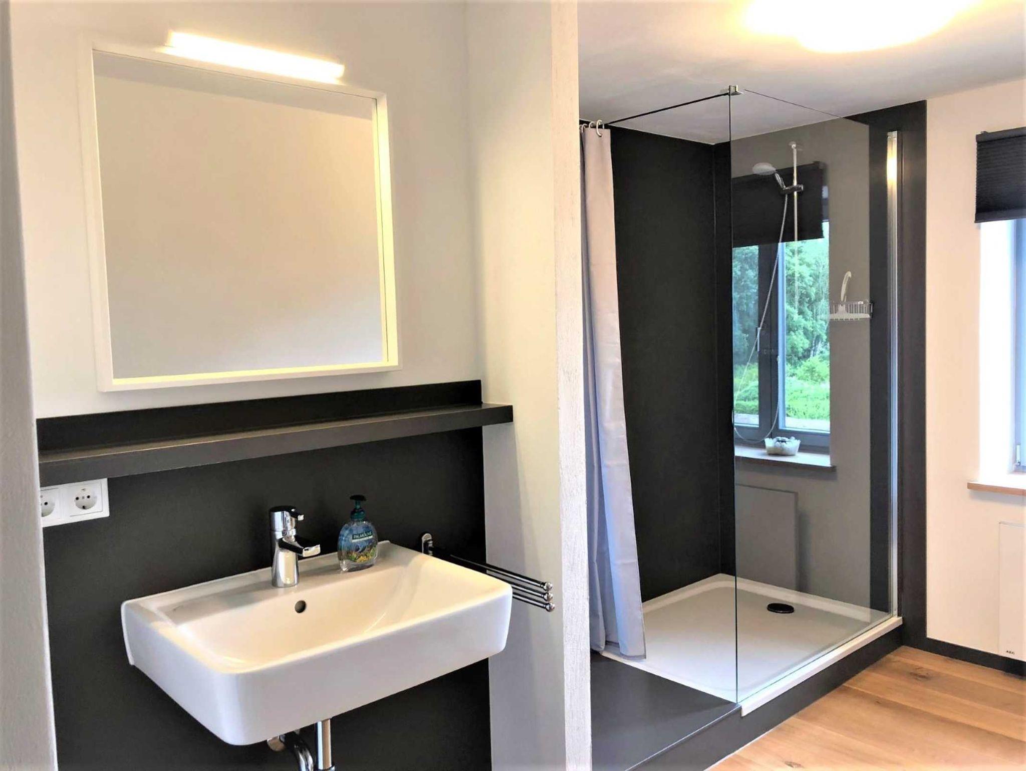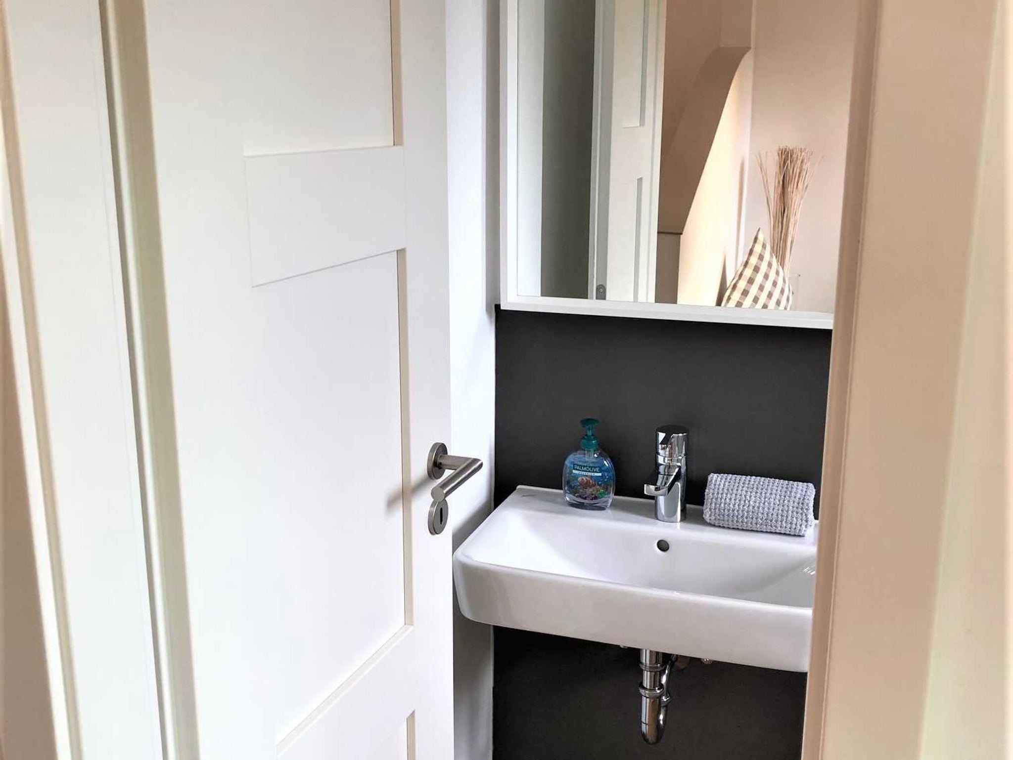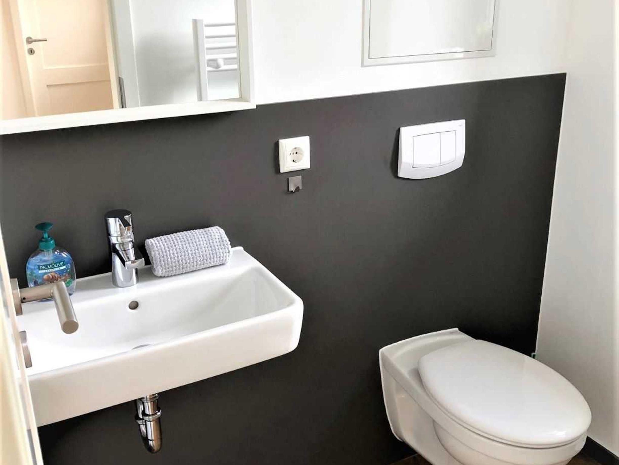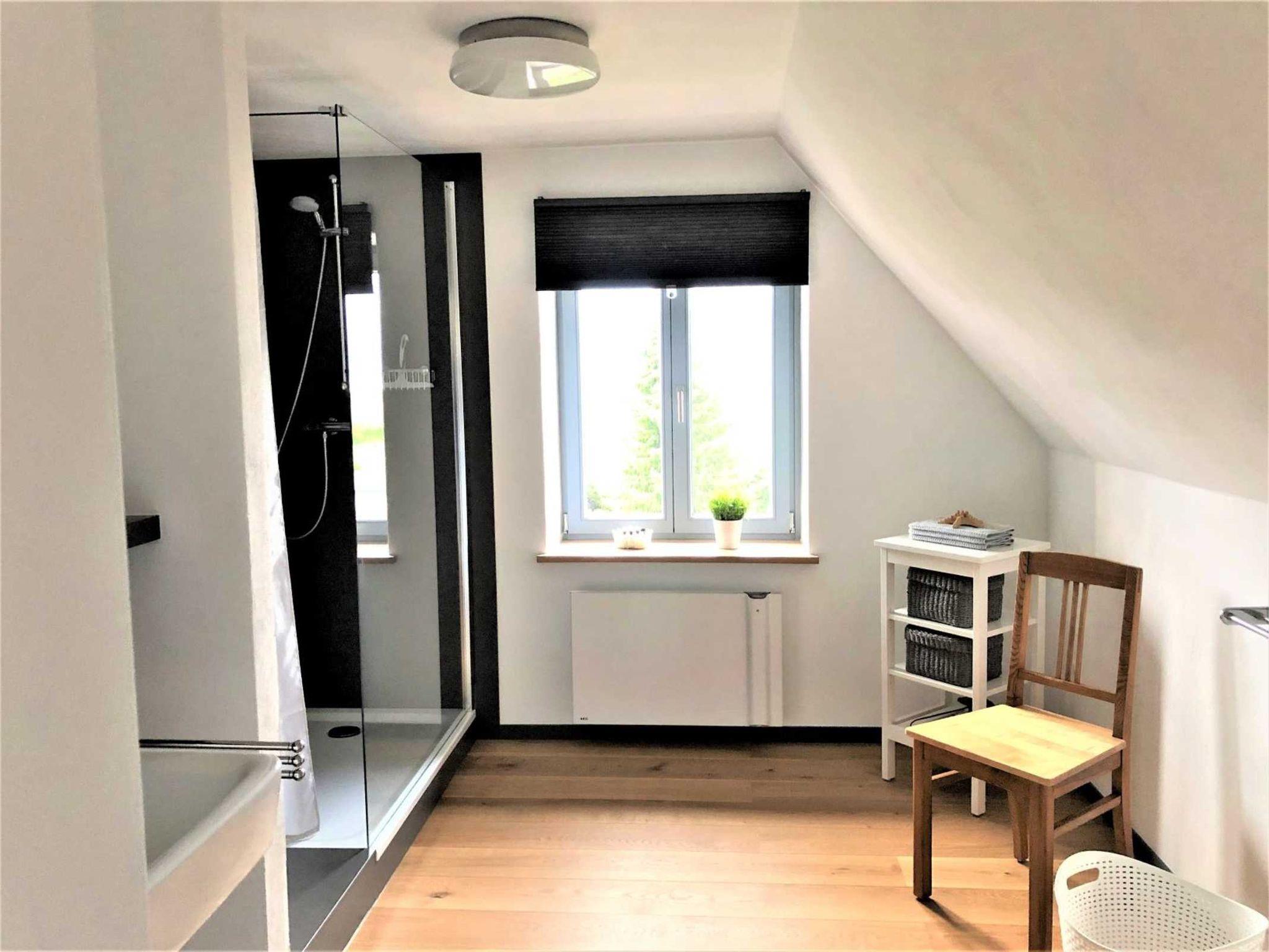 In dem ansprechenden, modernen Tageslicht-Badezimmer mit Blick auf das Haff im Obergeschoß befinden sich eine geräumige Dusche, Waschbecken und WC. Im Erdgeschoß gibt es zusätzlich ein Gäste WC mit einer Waschgelegenheit.
