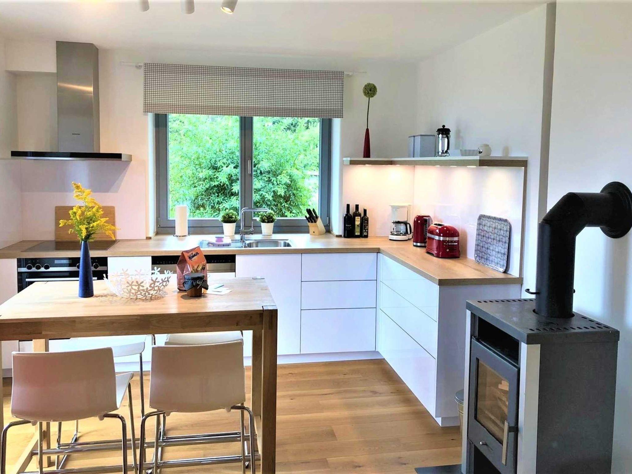 Die vollausgestattete Küche in modernem weißglänzendem Design lässt keine Wünsche offen und verfügt über Toaster, Kaffeemaschine, Wasserkocher, Cerankochfeld, Dunstabzug (Abluft nach außen), Kühl- Gefrierkombination, Backofen, Geschirrspüler und vieles mehr.