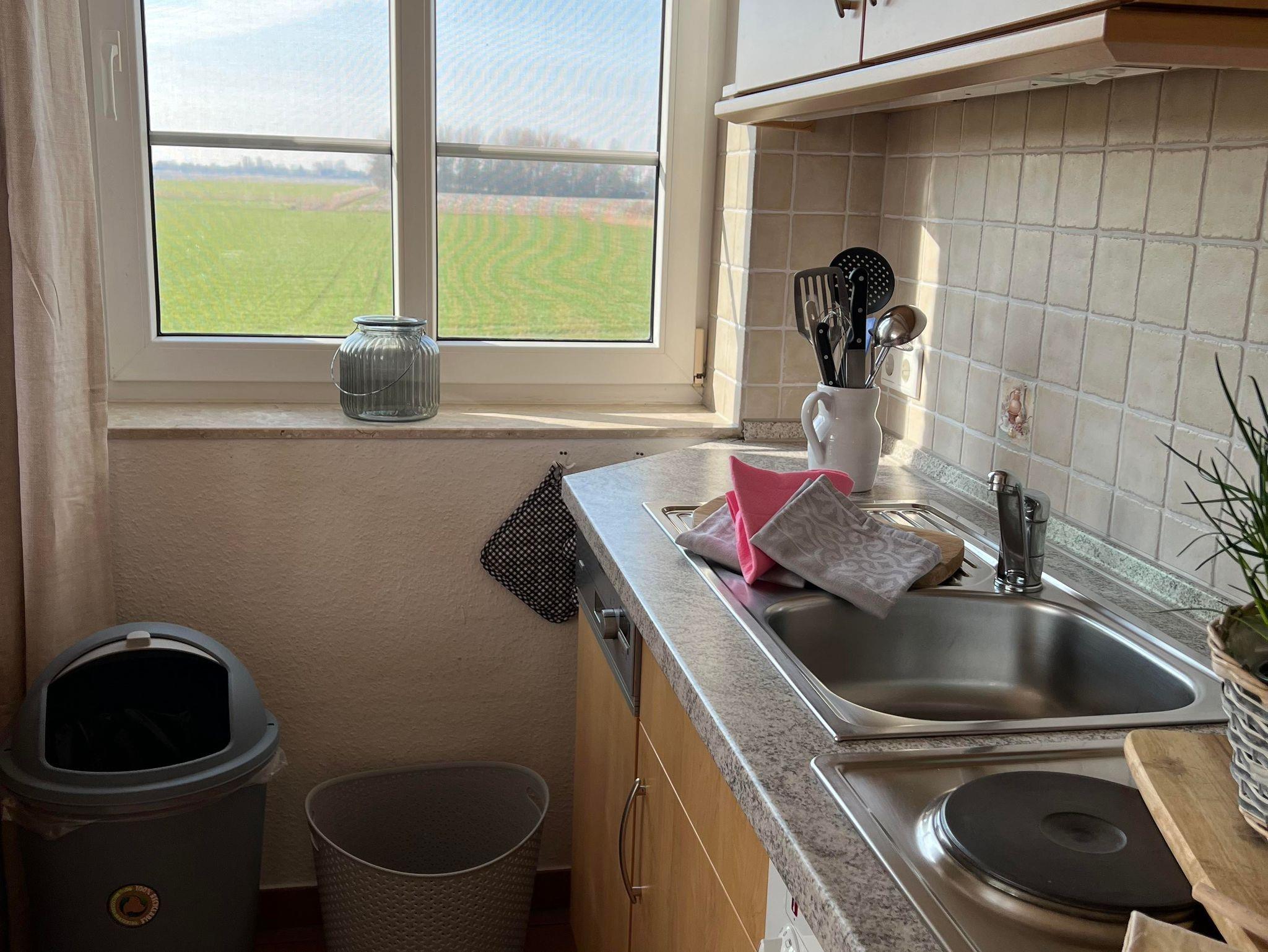 Außerdem bietet sich die Möglichkeit abends auf dem Balkon oder der Gemeinschaftsterrasse zu sitzen und den weiten Blick über die Felder und auf den Deich zu genießen.