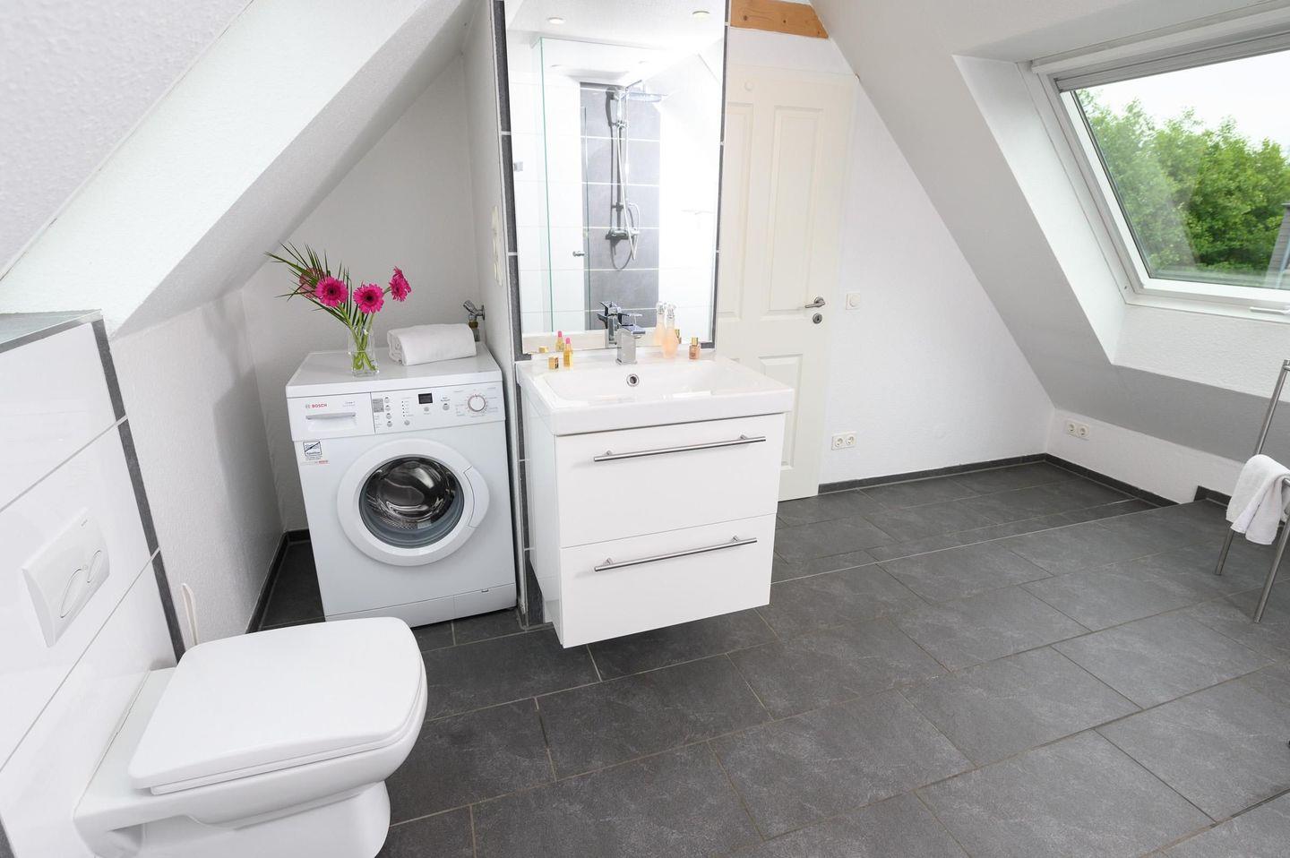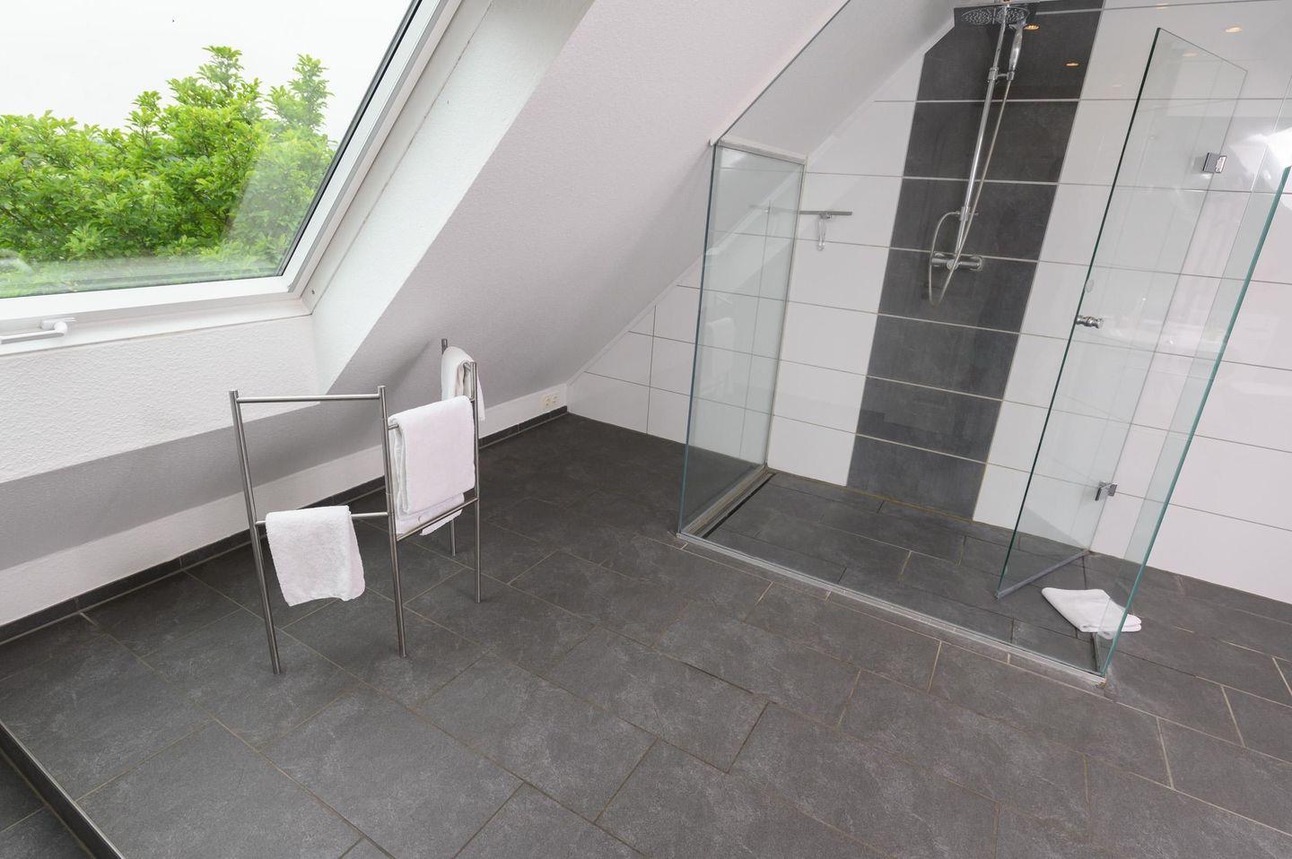 Das großzügige Badezimmer im Dachgeschoss ist mit einer gläsernen Regenwalddusche ausgestattet und sorgt für ein echtes Wellness-Gefühl.