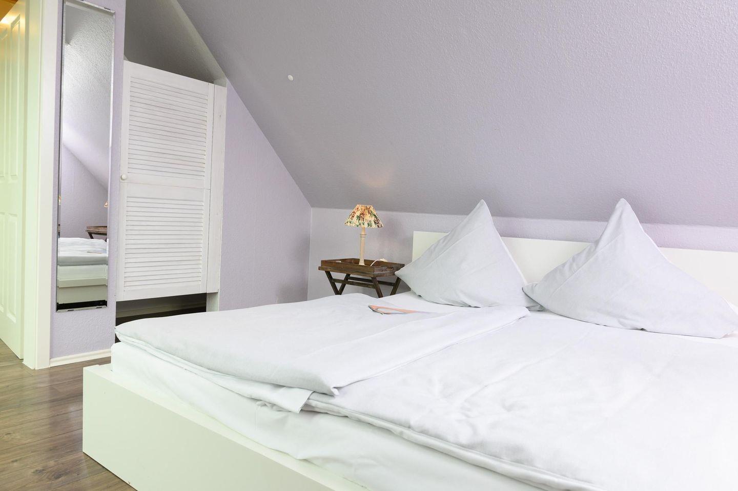 Das Schlafzimmer im Dachgeschoss begeistert mit freiliegenden Balken und Blick über das Landschaftsschutzgebiet.