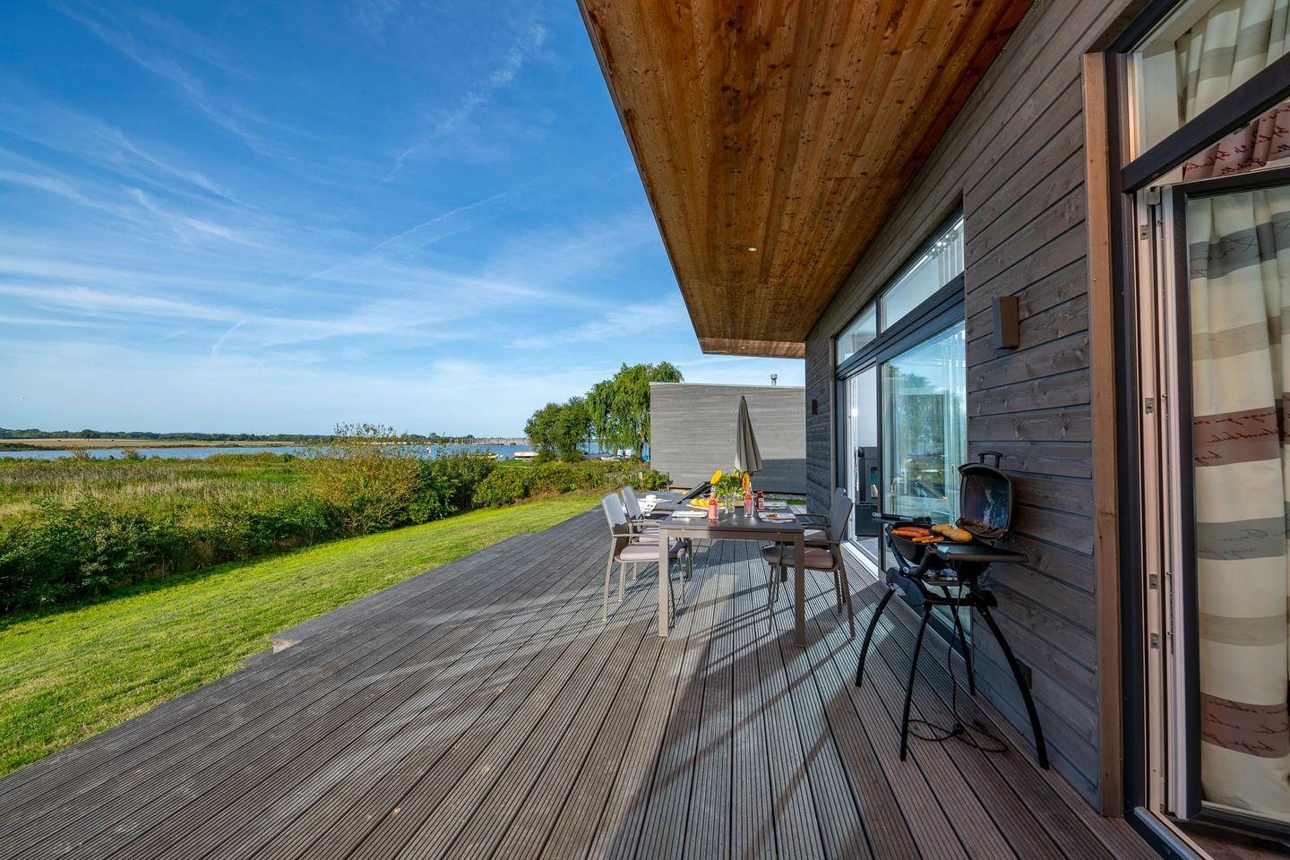 Die großzügige, 55 m² große Bankirai-Holzterrasse bietet ganztägig Sonne und lädt zum Entspannen ein.