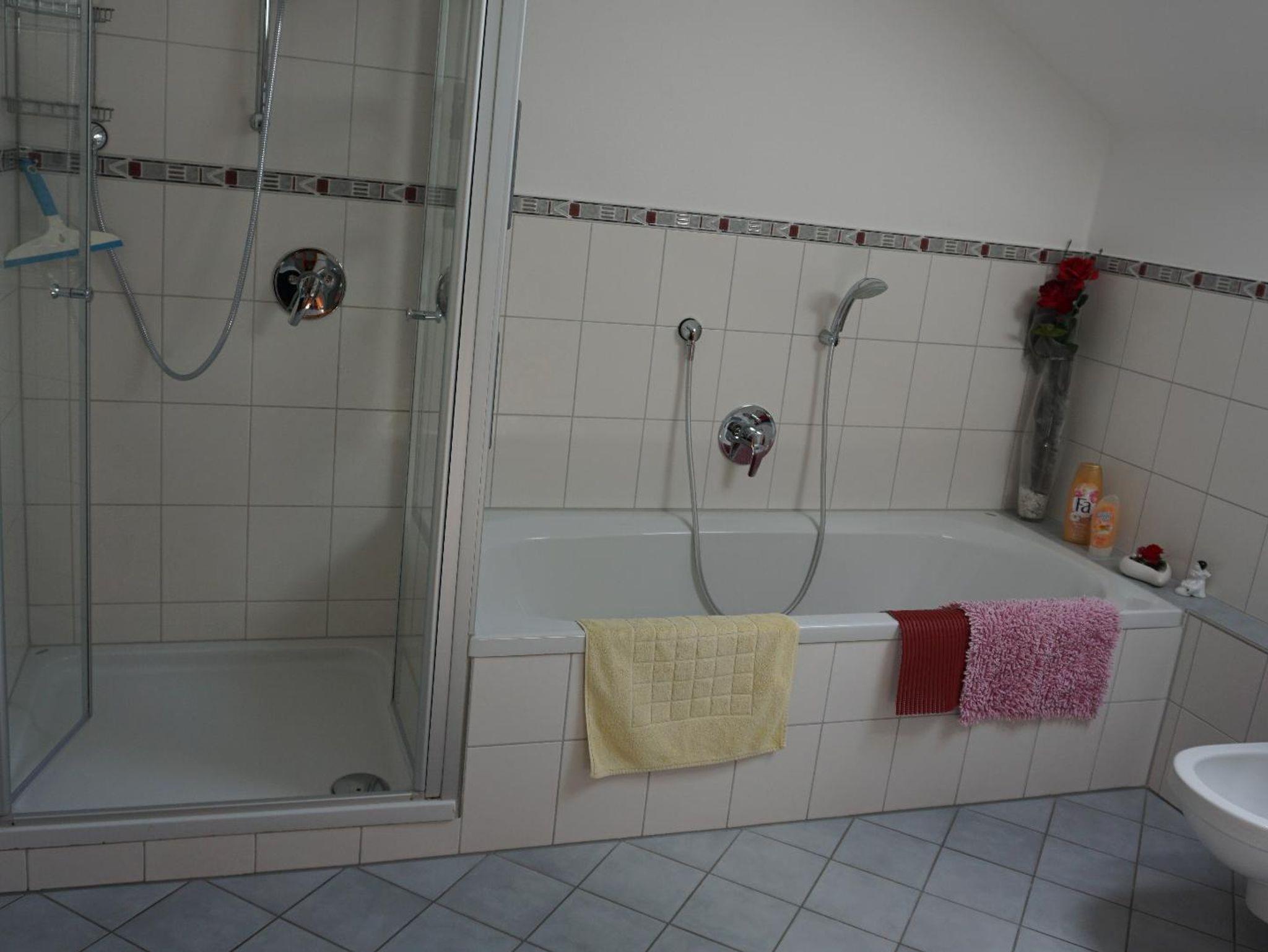 Das Badezimmer mit Fenster u. Lüftungsanlage, zusätzlicher überlanger Badewanne, Bidet usw. wird sie begeistern. Ein Haarföhn und diverse Kosmetik- Pflegeartikel stehen bereit. Gerne können sie die Waschmaschine gegen geringe Gebühr im UG benützen.