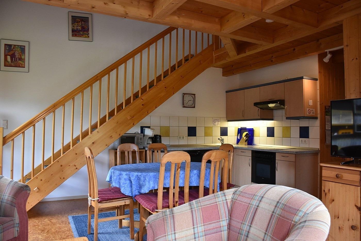 Im EG: Wohnschlafraum mit Doppelbettcouch, Farb-TV, Essplatz für 6 Personen, Küchenzeile mit E-Herd (Geschirrspüler, Backrohr, Mikrowelle, Toaster und Kaffeemaschine),