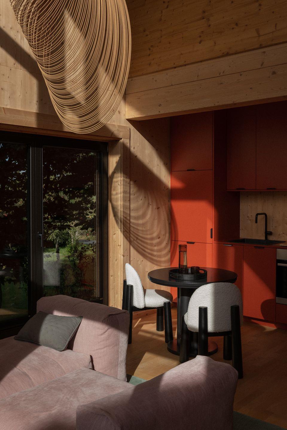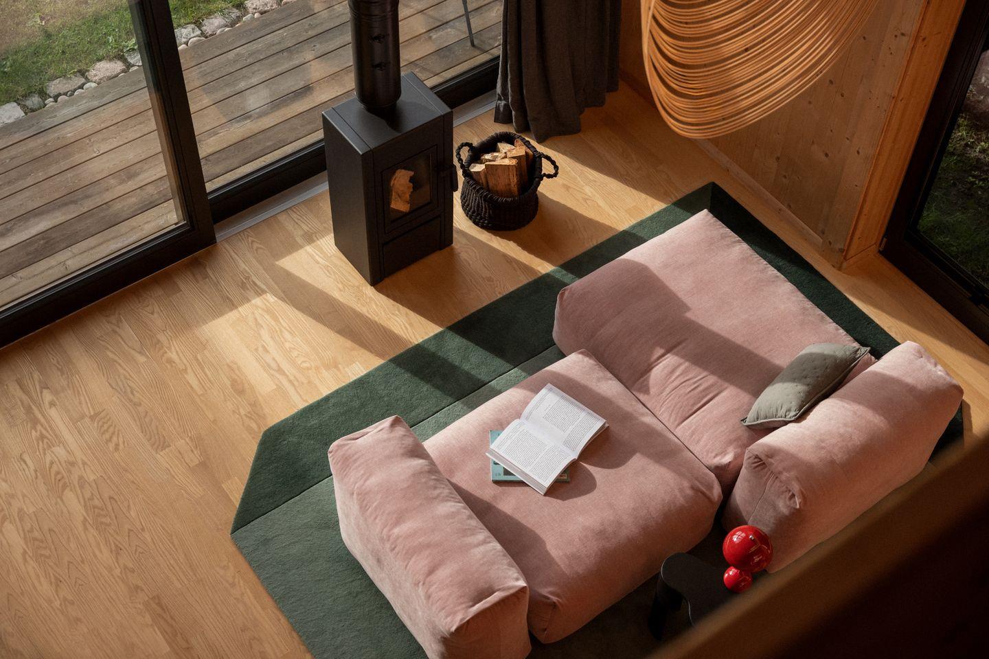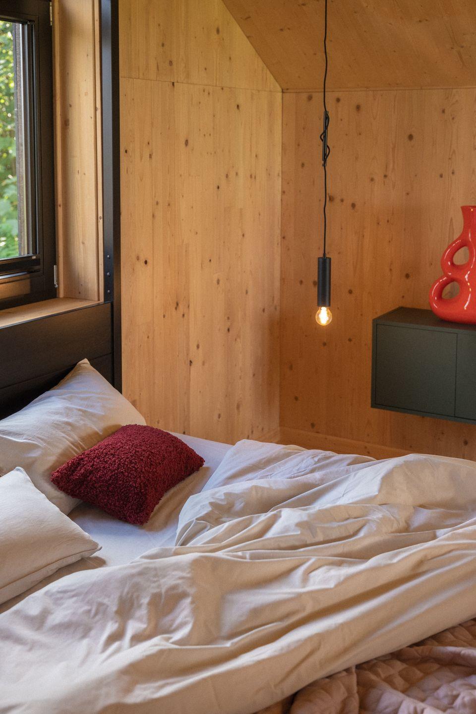 Die große Fensterfront ist gleichzeitig der Eingang und sorgt für das minimalistische und gleichzeitig großzügige Wohngefühl. Die sieben Meter hohen Decken, ebenso wie das gesunde Raumklima, das durch die unbehandelten Hölzer und die folienfreie Bauweise erreicht wird, lassen euch so richtig durchatmen. Davon profitieren nicht nur Allergiker - ihr schlaft besser und werdet gleich beim Eintreten den angenehmen, beruhigenden Effekt der Holz-Umgebung feststellen. Die Fußbodenheizung sorgt das ganze Jahr über für eine angenehme Wärme und kann im Haus reguliert werden. Sollte sich das Haus doch einmal aufheizen, kühlt ihr es per Fernbedienung in wenigen Minuten mit der Klimaanlage herunter. Der Kamin ermöglicht euch ausserdem jederzeit zusätzliche Wohlfühlwärme. Ein Korb mit Feuerholz ist vorhanden.