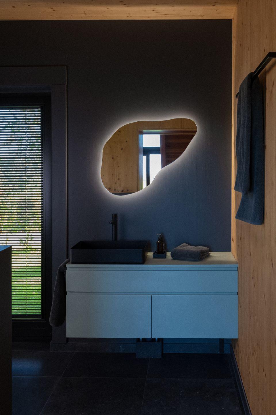 Das geräumige Bad in Grau- und Grüntönen greift die Farben der Umgebung auf und verfügt über ein bodentiefes Fenster. Die offene Dusche hat eine supersofte Regenfunktion und eure Haut und Haare werden sich freuen, da unsere Entkalkungsanlage für weiches Wasser sorgt, das keine Kalkrückstände bildet. Indirektes Licht im Spiegel, ein Fön und große Schubladen für eure Kosmetikartikel sowie Ablageelemente aus Schiefer für Seifen und Co. runden die hochwertige Ausstattung ab. Da das Haus eine eigene Öko-Kläranlage hat, werft bitte keine Hygieneartikel in die Toilette und nutzt keine toxischen Reinigungs- und Pflegemittel. Seife und Toilettenpapier sind vor Ort.