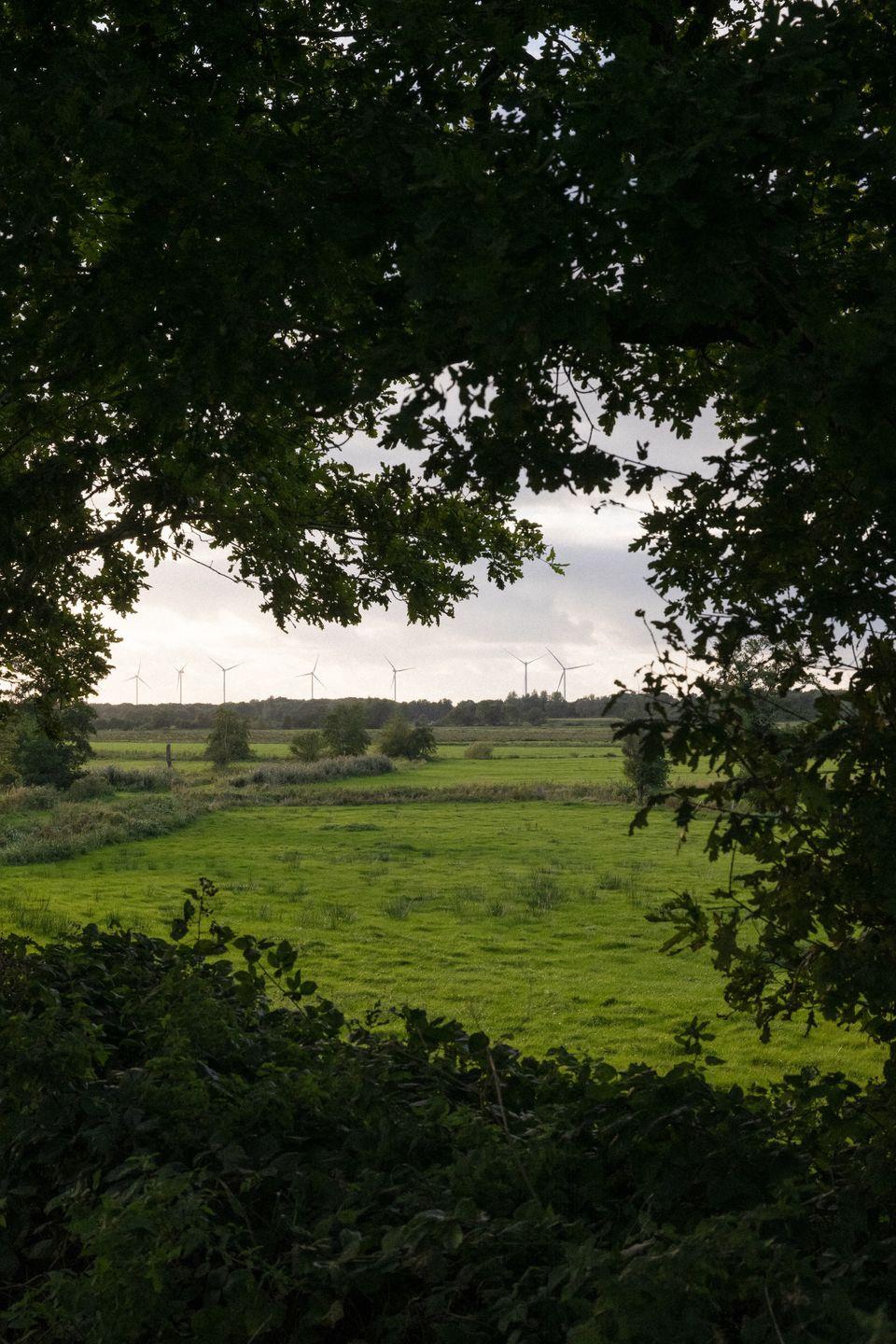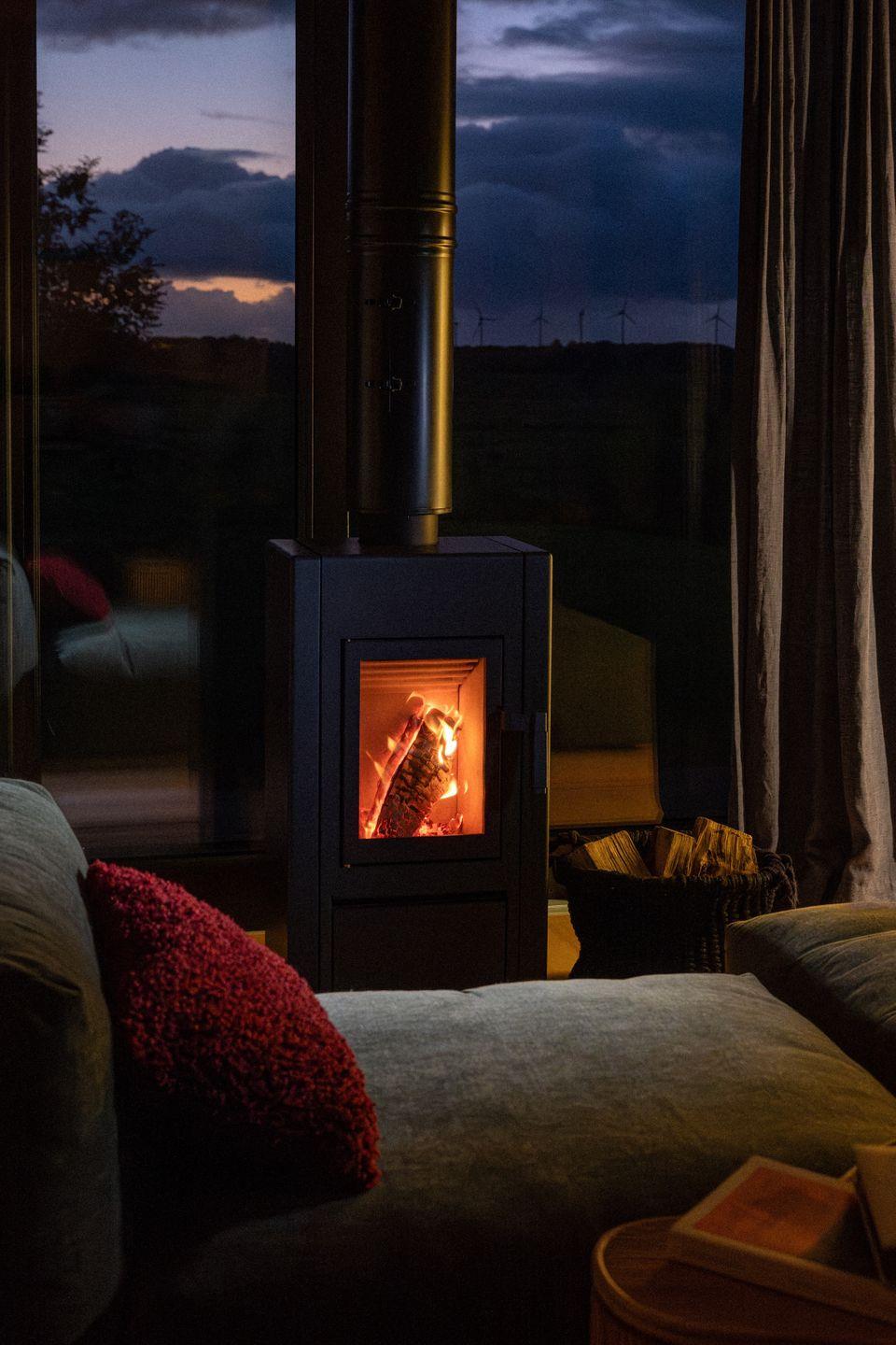 Das Wohnzimmer verfügt über einen Kamin und eine Sofalandschaft, auf der Ihr euch einkuscheln könnt. Der Blick in die Weite begeistert bei jedem Wetter - hier fühlt sich Stubenhocken an wie Draußensein. Ihr könnt Rehe und Fasane beobachten und blickt über die Feuchtwiesen bis hin zu den Windrädern am Horizont. Eine Sitzbank unter der Treppe bietet Ablagefläche und Stauraum. Bei eurer Anreise findet Ihr einen Korb mit Feuerholz vor, der für 2-3 Tage ausreicht. Solltet ihr mehr Holz benötigen, gibt es in der Umgebung jede Menge Supermärkte und private Anbieter.