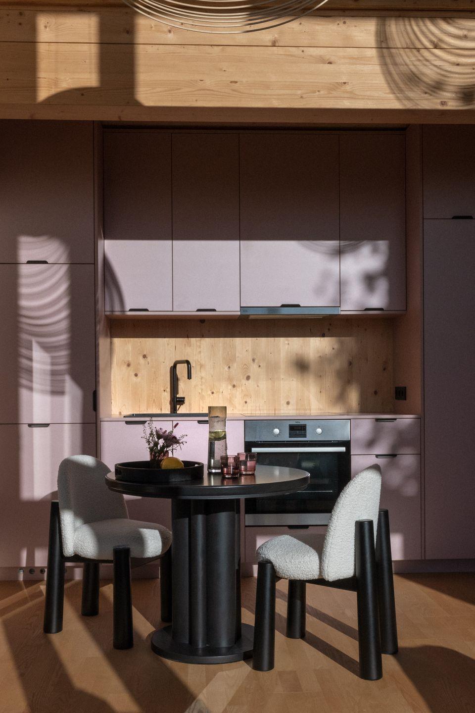 Die Einbauküche trennt Wohnraum und Bad und enthält neben einem Schrank für Jacken, Hemden und alles, was ihr auf Bügeln aufhängen möchtet, auch den Durchgang zum Bad. Die Küche ist mit allem ausgestattet, was ihr braucht: ein hochwertiges, gusseisernes Topfset, Gläser und Geschirr, einem Esstisch, Kork-Sets, einer Nespressomaschine mit Milchaufschäumer und ökologischen Kaffee-Kapseln (genug für 2-3 Tage Aufenthalt), einem Toaster, dazu Wasserkocher, Eierbecher, scharfe Messer und natürlich Besteck, Kochlöffel, eine Reibe und Sparschäler, Korkenzieher, Espressotassen, Salatschüsseln, Butterdose eine Karaffe und vieles mehr. Es steht ein Geschirrspüler und ein Kühlschrank mit Gefrierfach zu Verfügung. Geschirrspültabs sind vor Ort.