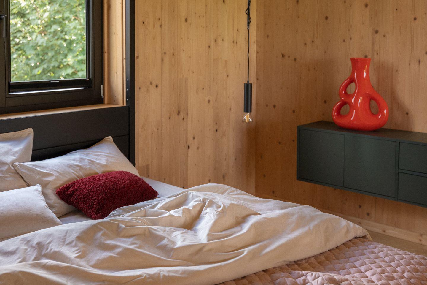 Die große Fensterfront ist gleichzeitig der Eingang und sorgt für das minimalistische und gleichzeitig großzügige Wohngefühl. Die sieben Meter hohen Decken, ebenso wie das gesunde Raumklima, das durch die unbehandelten Hölzer und die folienfreie Bauweise erreicht wird, lassen euch so richtig durchatmen. Davon profitieren nicht nur Allergiker - ihr schlaft besser und werdet gleich beim Eintreten den angenehmen, beruhigenden Effekt der Holz-Umgebung feststellen. Die Fußbodenheizung sorgt das ganze Jahr über für eine angenehme Wärme und kann im Haus reguliert werden. Sollte sich das Haus doch einmal aufheizen, kühlt ihr es per Fernbedienung in wenigen Minuten mit der Klimaanlage herunter. Der Kamin ermöglicht euch ausserdem jederzeit zusätzliche Wohlfühlwärme. Ein Korb mit Feuerholz ist vorhanden.