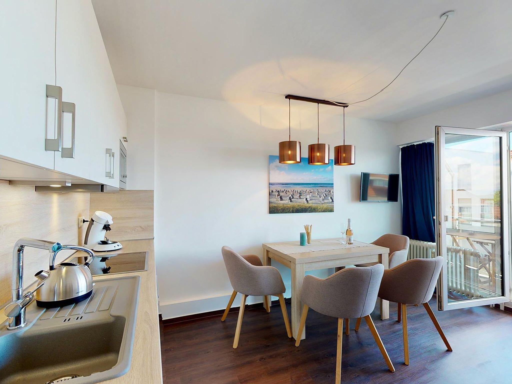 Modern eingerichtete Ferienwohnung mit Balkon nahe dem Wangerooger Badestrand und zentraler Lage.