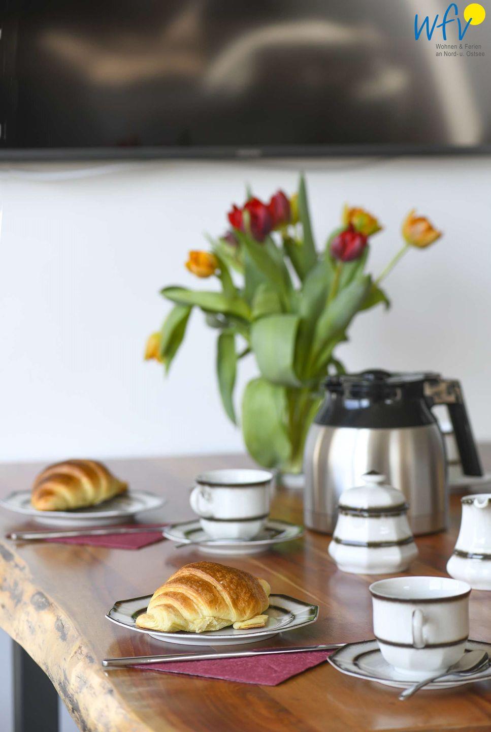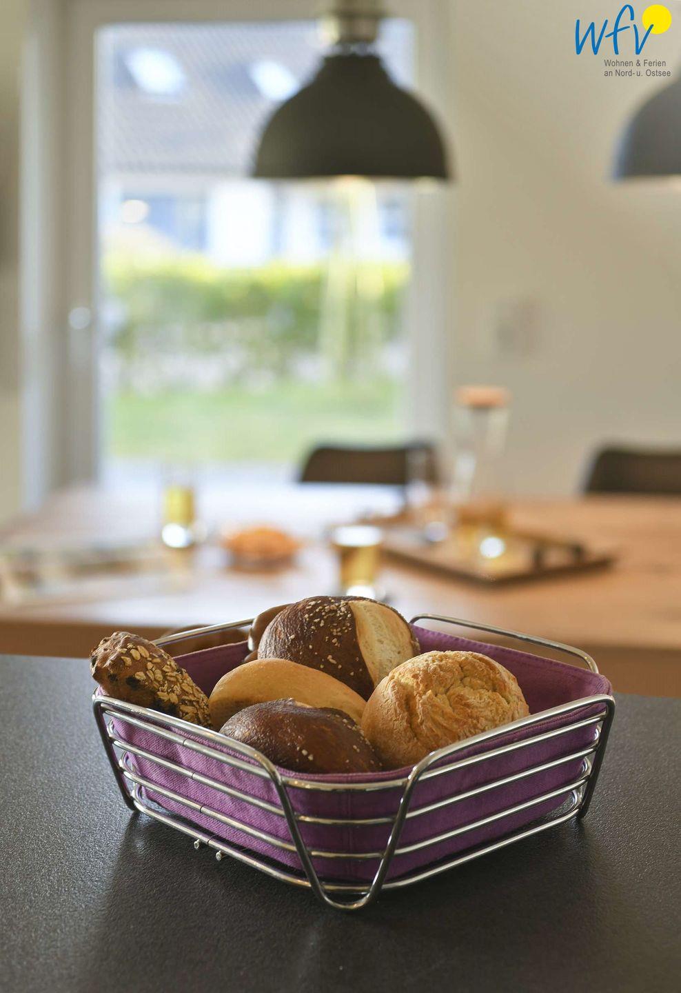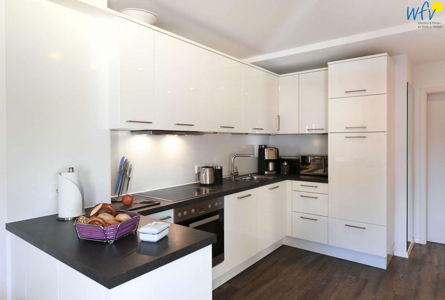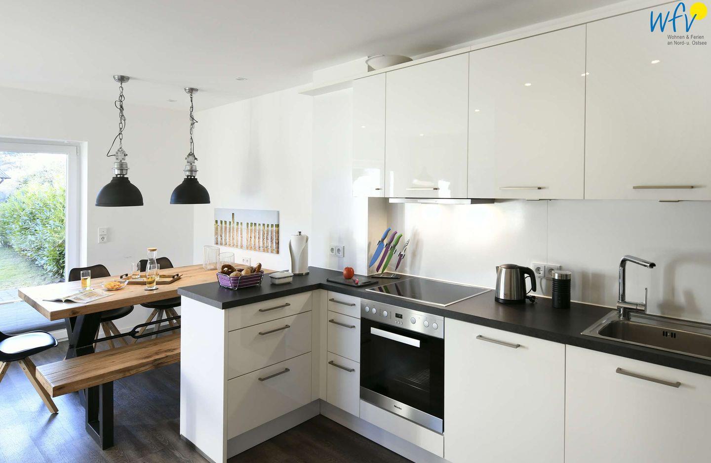 Damit Sie sich in Ihrem Urlaub auf Wangerooge angenehm selbst verpflegen können, ist in beiden Wohnräumen der Ferienwohnung eine moderne Einbauküchenzeile integriert - u.a. mit Ceranherd, Backofen, Kühlschrank mit Gefrierfach, Spülmaschine und Mikrowelle sowie Kaffeemaschine, Wasserkocher und Toaster.