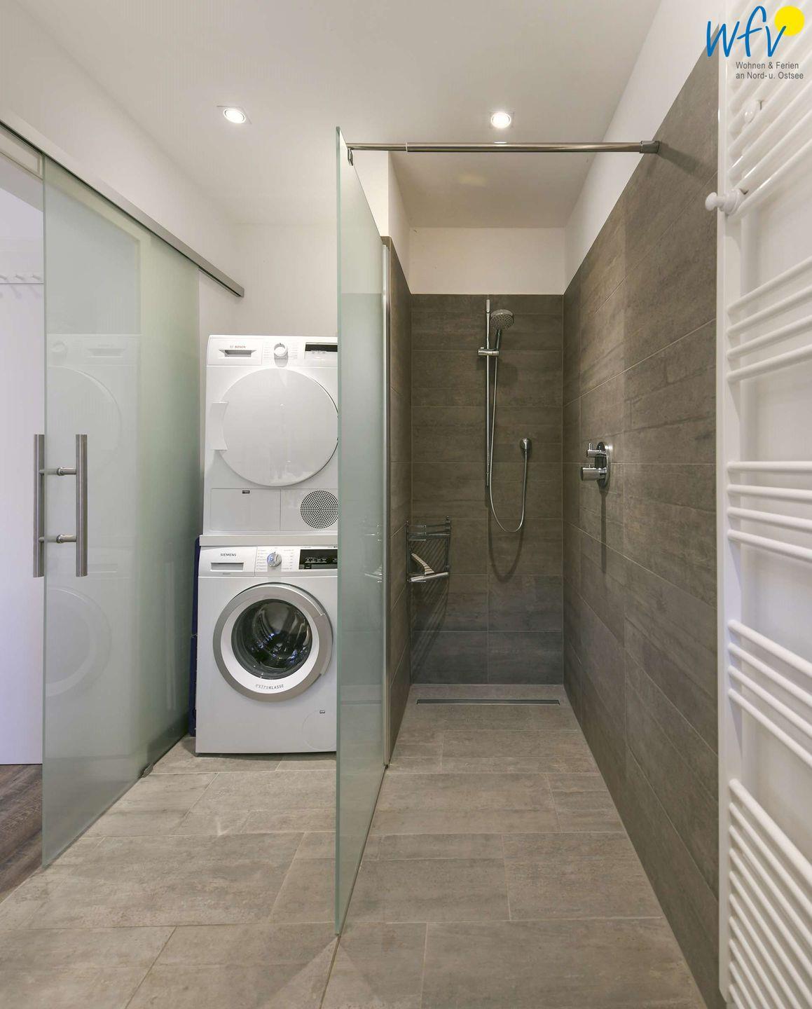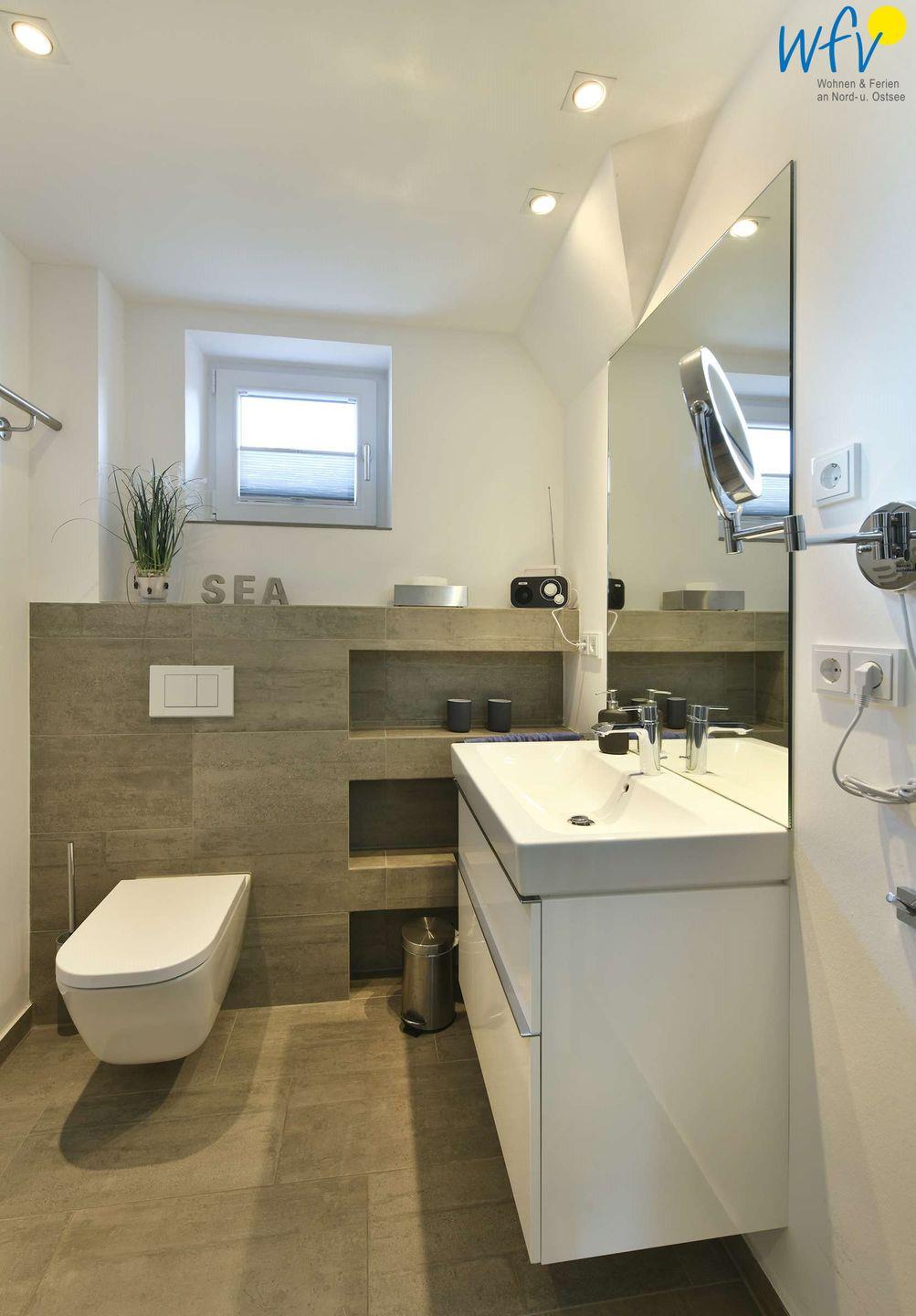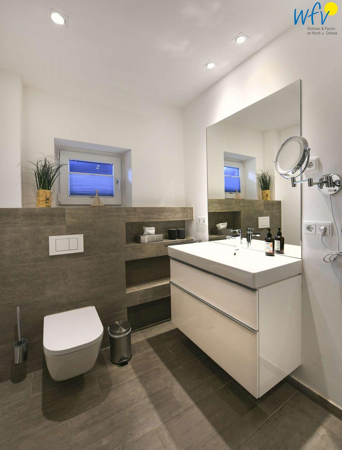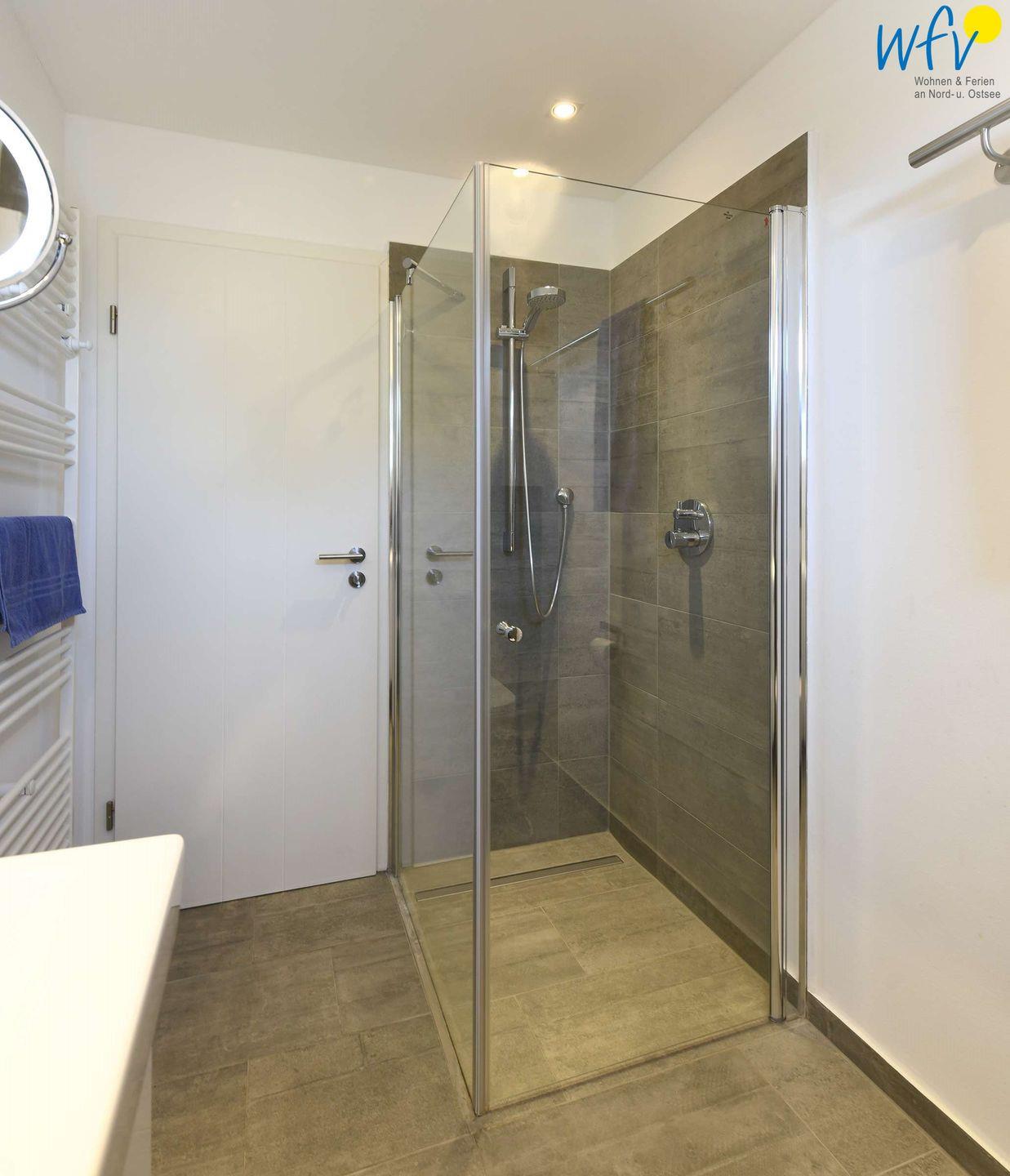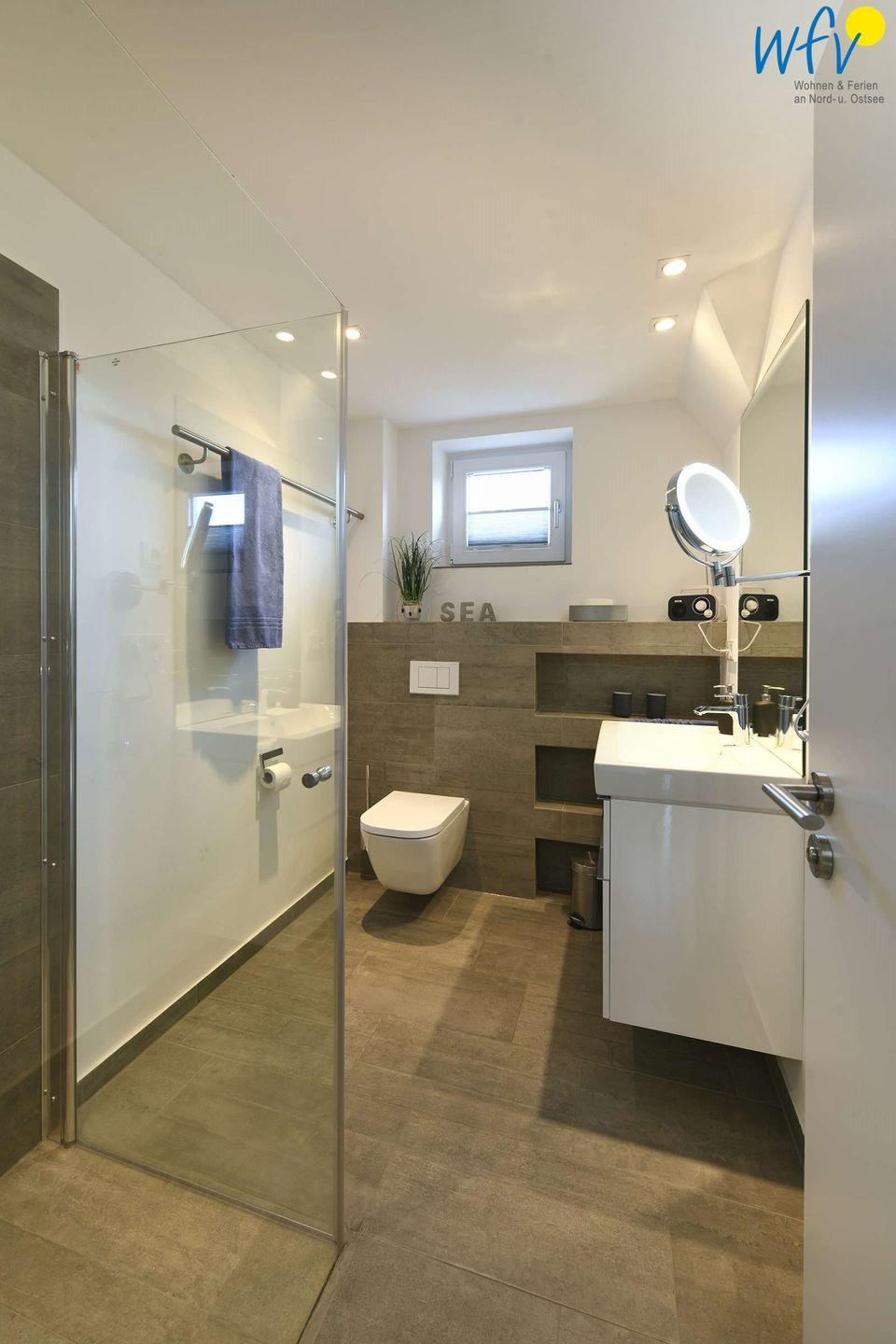 Wohnkomfort erwartet Sie auch in den beiden Bädern des Ferienhauses "Sonnenhaus" auf Wangerooge. Eine moderne Ausstattung - u.a. mit Glasdusche und Fußbodenheizung - sorgt für ein angenehmes Wohlgefühl.