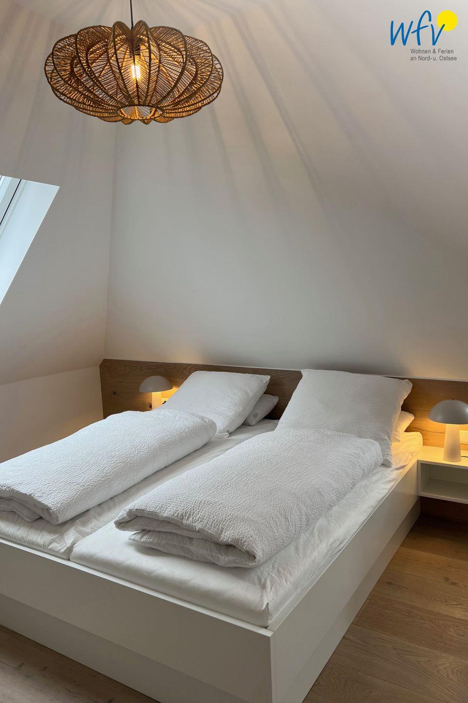 Drei separate Schlafzimmer bieten Ihnen in der Ferienwohnung angenehme Rückzugsmöglichkeiten. Zwei der Zimmer sind jeweils mit einem komfortablen Doppelbett ausgestattet( 1,80 m x 2,00 m) für weitere Gäste ist das dritte Schlafzimmer mit einem hübschen Etagenbett eingerichtet( 0,90 m x 2,00 m) Ihre Urlaubsgarderobe findet in den geräumigen Kleiderschränken Platz, ihre Gepäckstücke auf den separaten Kofferablagen.
