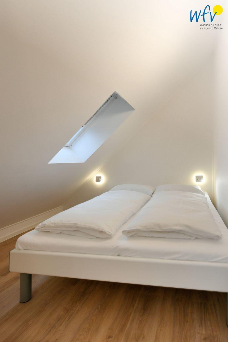 Angenehme Rückzugsmöglichkeiten bieten Ihnen zwei separate Schlafzimmer im Spitzboden. Sie sind mit einem komfortablen Doppelbett (160 cm x 200 cm) bzw. einem Einzelbett ausgestattet (90 x 200 cm; mit Auszug 80 cm x 190 cm). Für Ihre Urlaubsgarderobe befindet sich im Flur zwischen den Schlafzimmern ein geräumiger Kleiderschrank. Aufhängevorrichtungen mit Bügeln gibt es in den Einbauschränken unter der Treppe. Auf der bequemen Schlafcouch im Wohnzimmer können zwei weitere Personen schlafen.