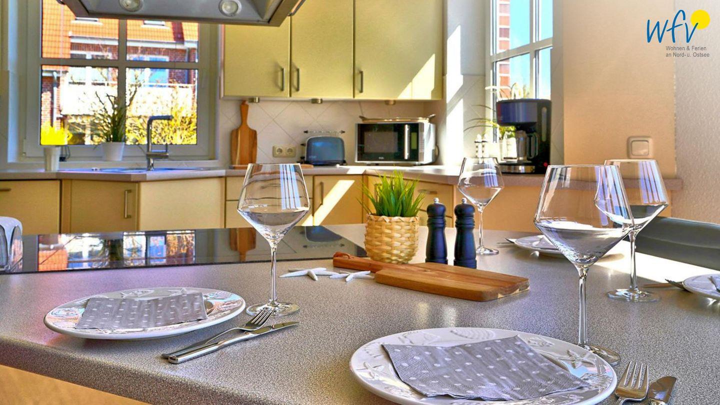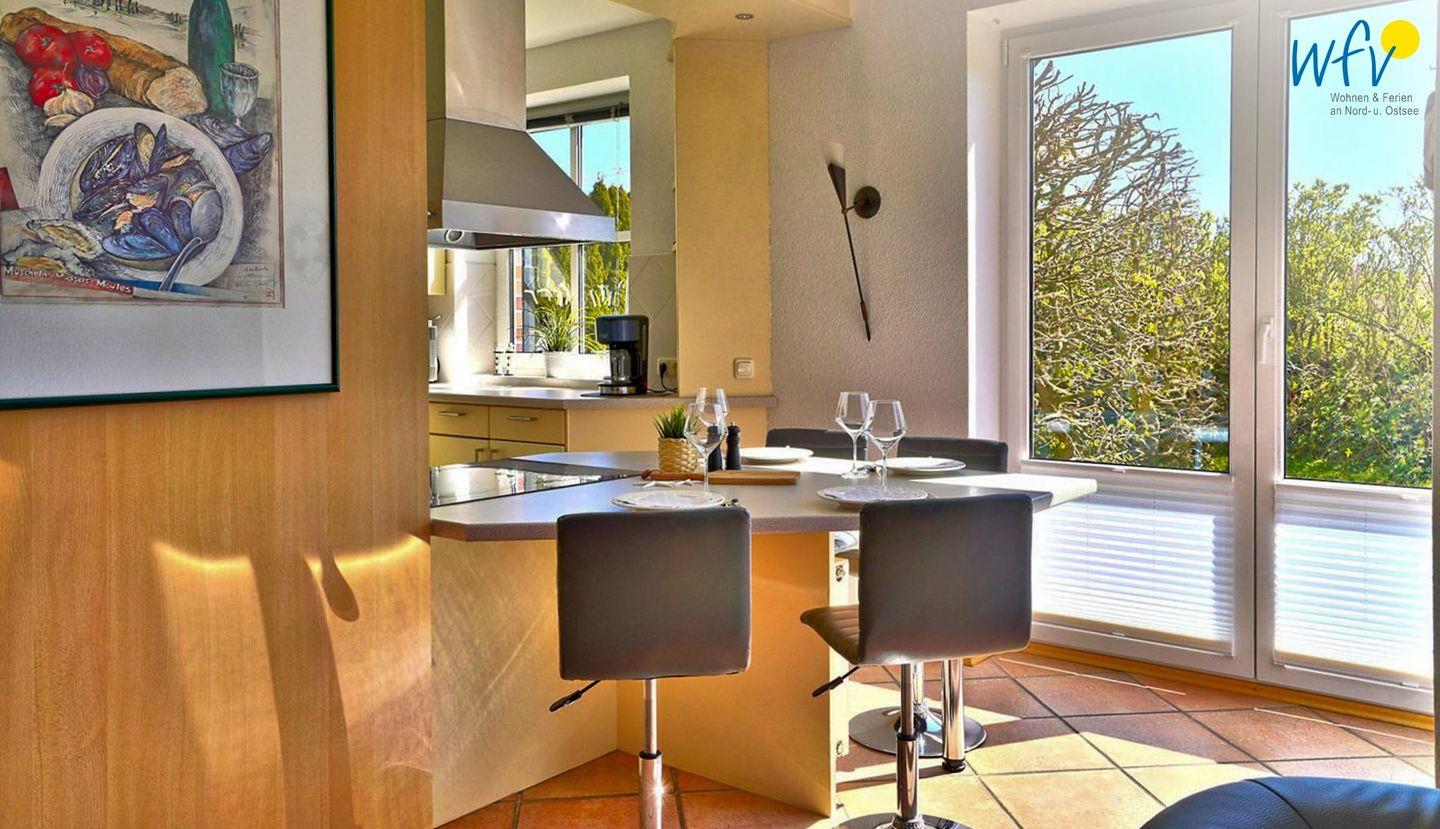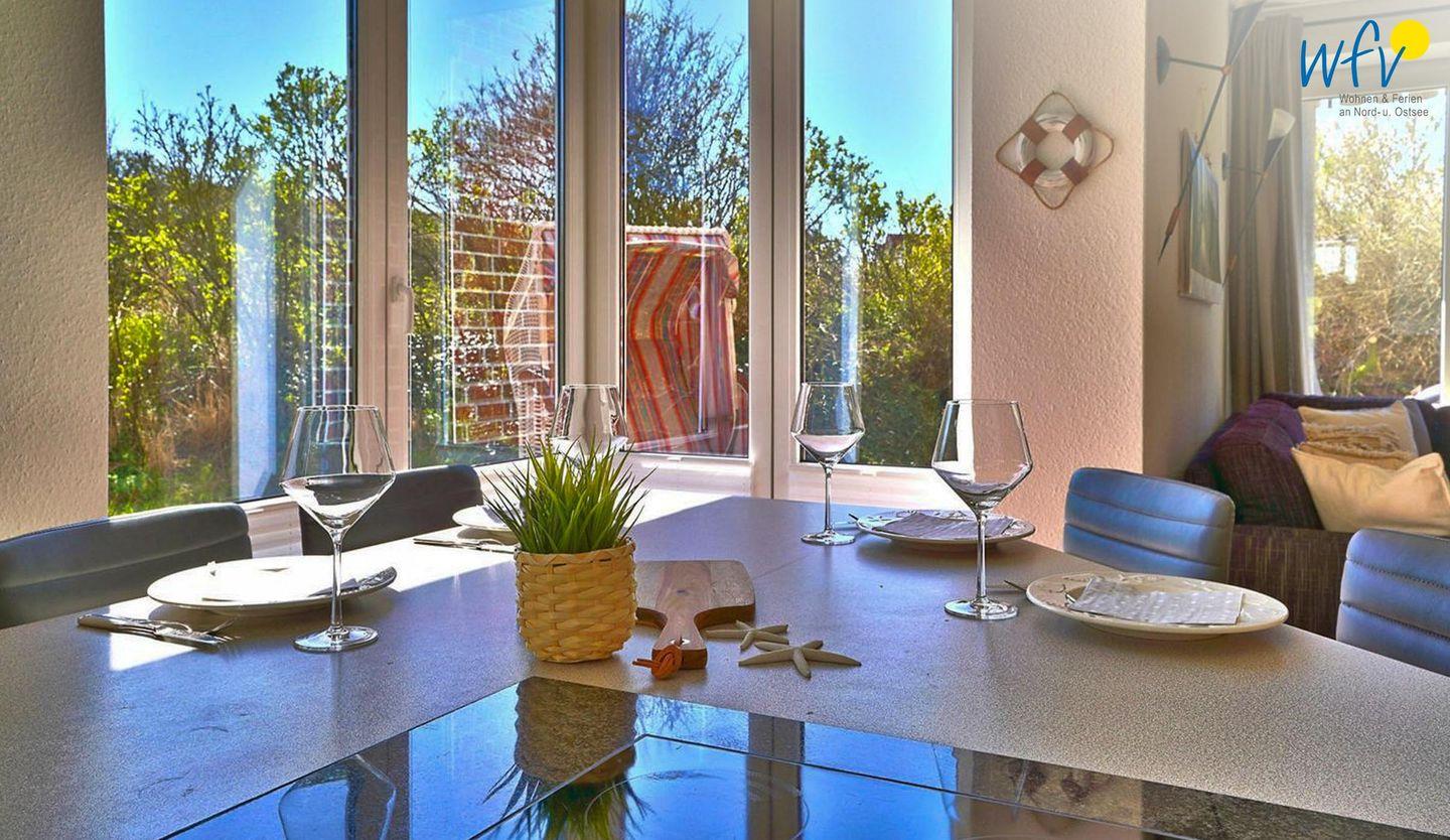 In dem hellen Wohnraum (EG) empfängt Sie ein geschmackvolles Ensemble aus einer Couchecke mit modernem TV und einer offenen Küche mit Essbereich. So können Sie nach der Fahrradtour oder dem Strandtag gemütlich zusammen sitzen oder Ihre Mahlzeiten genießen. Leckere Snacks für den Ausflug oder Gerichte am Abend lassen sich schnell und einfach in der separaten voll ausgestatteten Küche zaubern - u.a. mit Induktionsherd, Backofen und Mikrowelle. Den Abwasch übernimmt für Sie der Geschirrspüler. Bei schönem Wetter können Sie auf der Ost- und Südterrasse im Sonnenschein frühstücken und zu Abend essen.