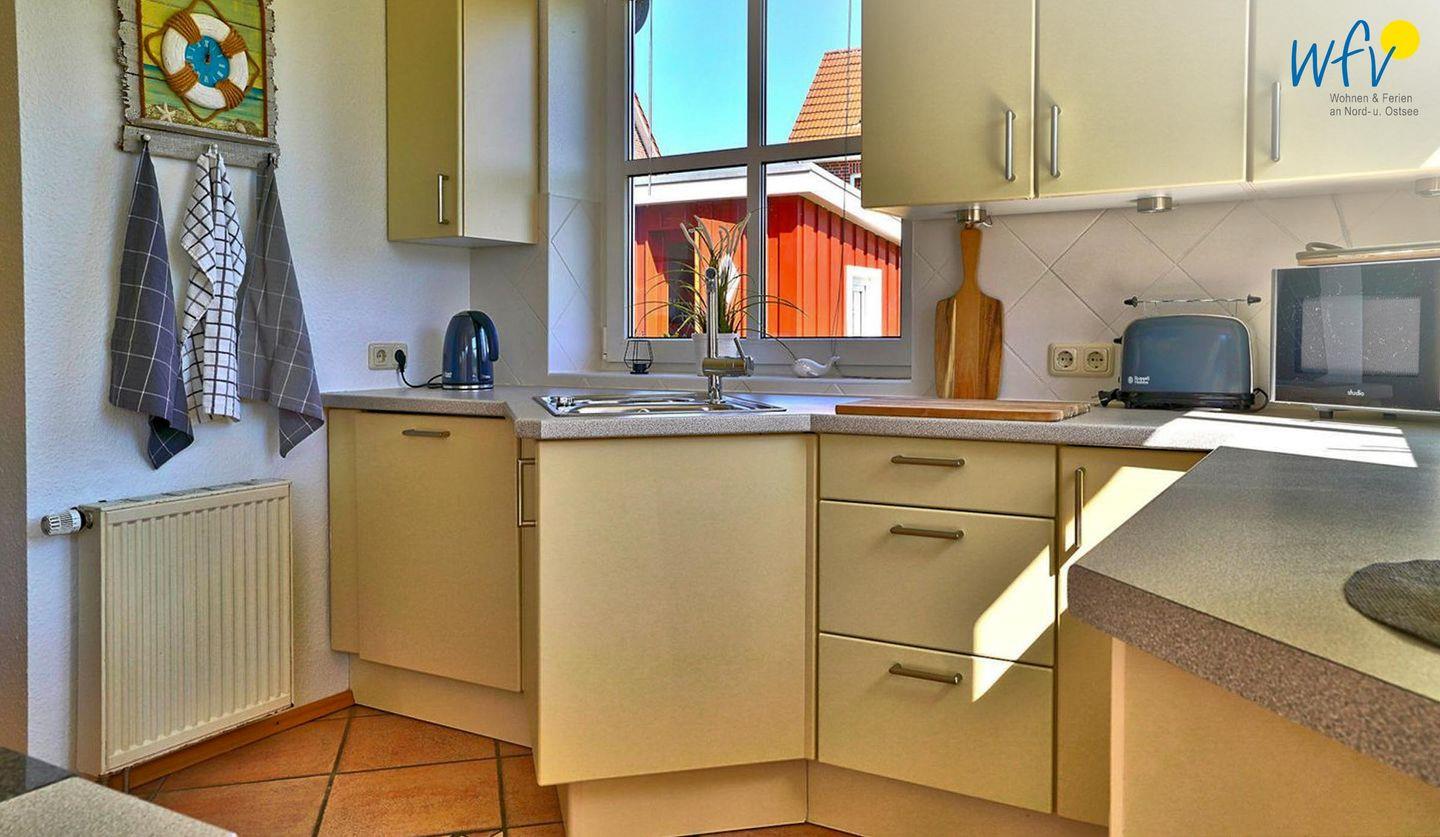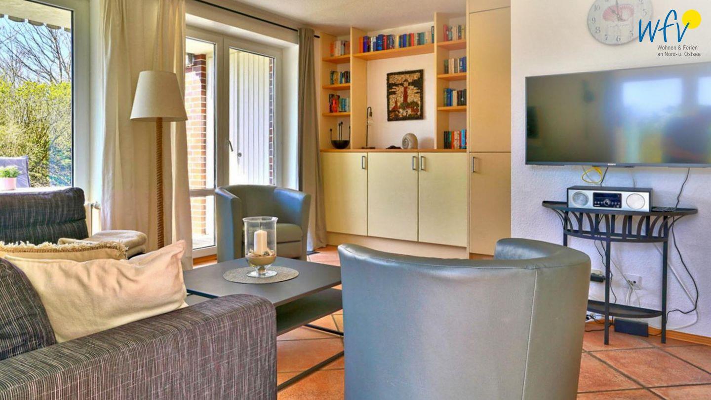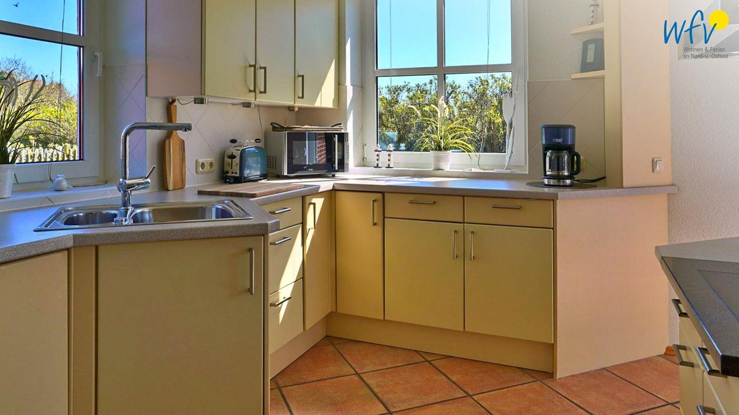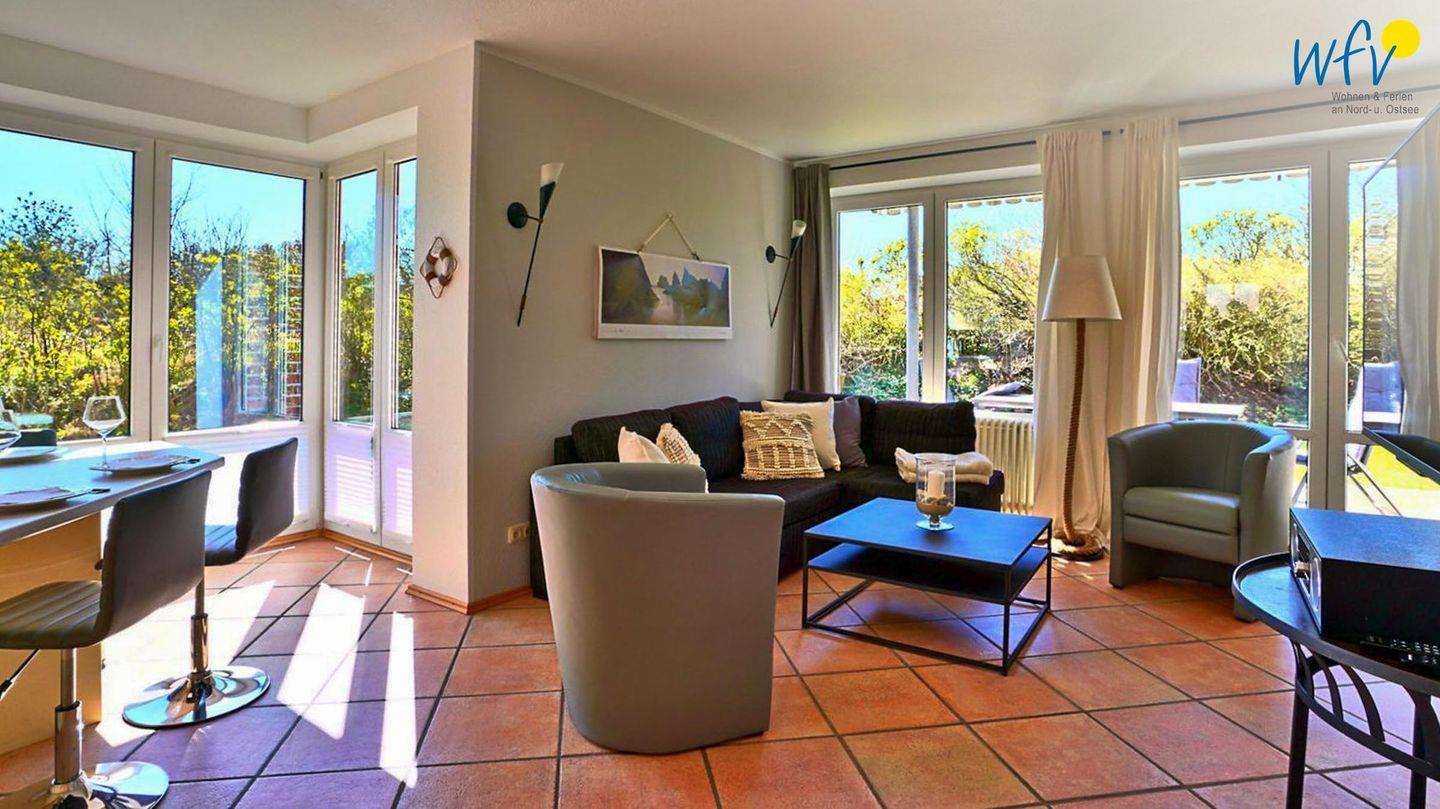In dem hellen Wohnraum (EG) empfängt Sie ein geschmackvolles Ensemble aus einer Couchecke mit modernem TV und einer offenen Küche mit Essbereich. So können Sie nach der Fahrradtour oder dem Strandtag gemütlich zusammen sitzen oder Ihre Mahlzeiten genießen. Leckere Snacks für den Ausflug oder Gerichte am Abend lassen sich schnell und einfach in der separaten voll ausgestatteten Küche zaubern - u.a. mit Induktionsherd, Backofen und Mikrowelle. Den Abwasch übernimmt für Sie der Geschirrspüler. Bei schönem Wetter können Sie auf der Ost- und Südterrasse im Sonnenschein frühstücken und zu Abend essen.