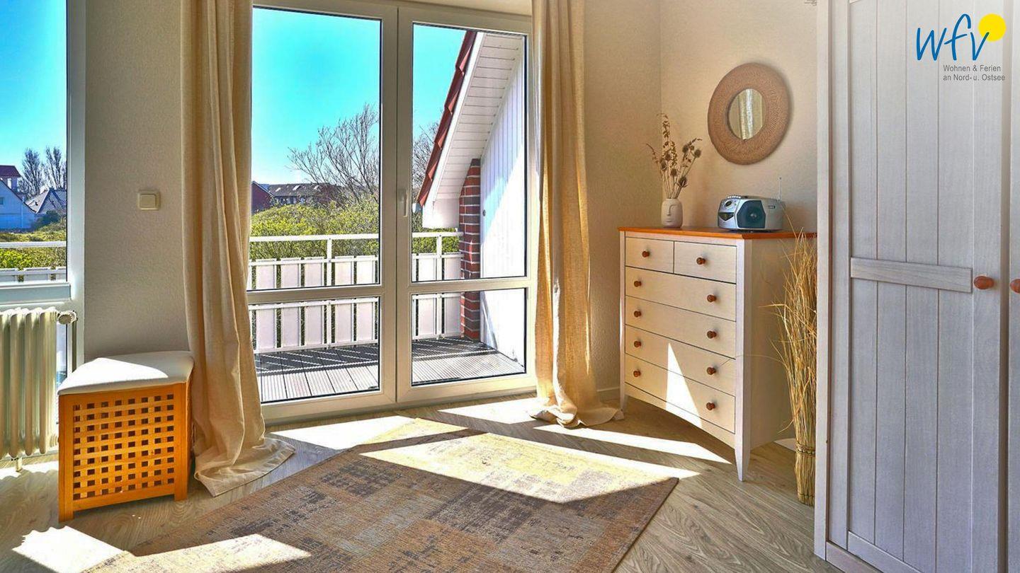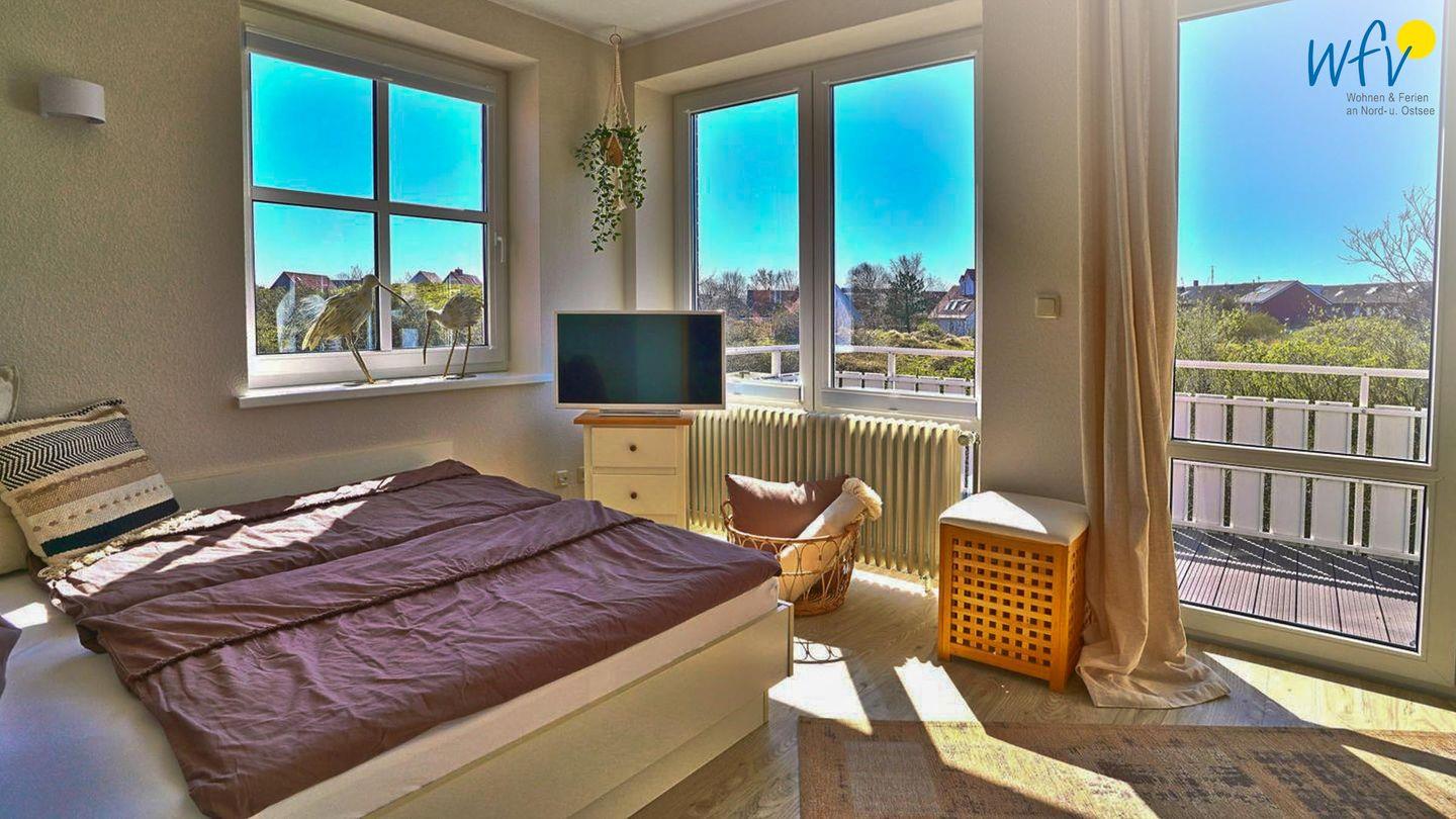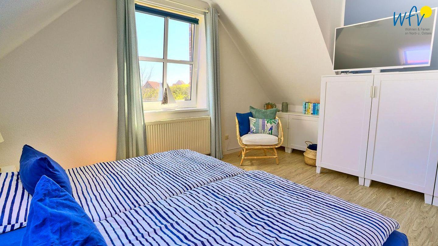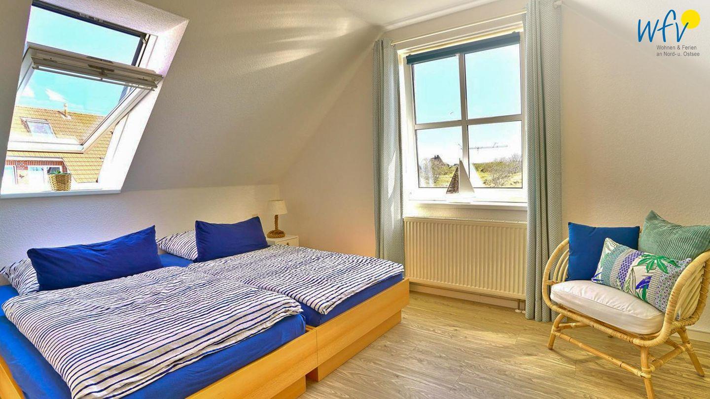 Zwei großzügige und freundlich eingerichtete separate Schlafzimmer mit sehr schönem Dünenblick im OG bieten Ihnen Platz zum Ausspannen. Eines der Zimmer ist mit einem großen Doppelbett eingerichtet (2 x 100 x 200 cm), das andere mit einem kleinen Doppelbett (160 x 200 cm).