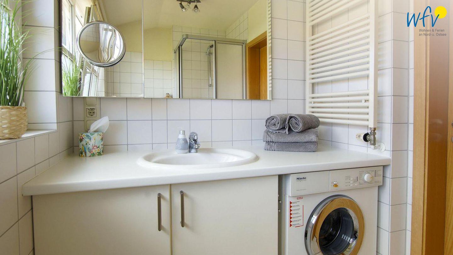 Neben einem Badezimmer mit Dusche im EG bietet das Ferienhaus im OG ein weiteres, geräumiges Badezimmer mit Waschmaschine. Das Gäste-WC im EG entspannt dabei die täglichen Badezimmer-Routinen.