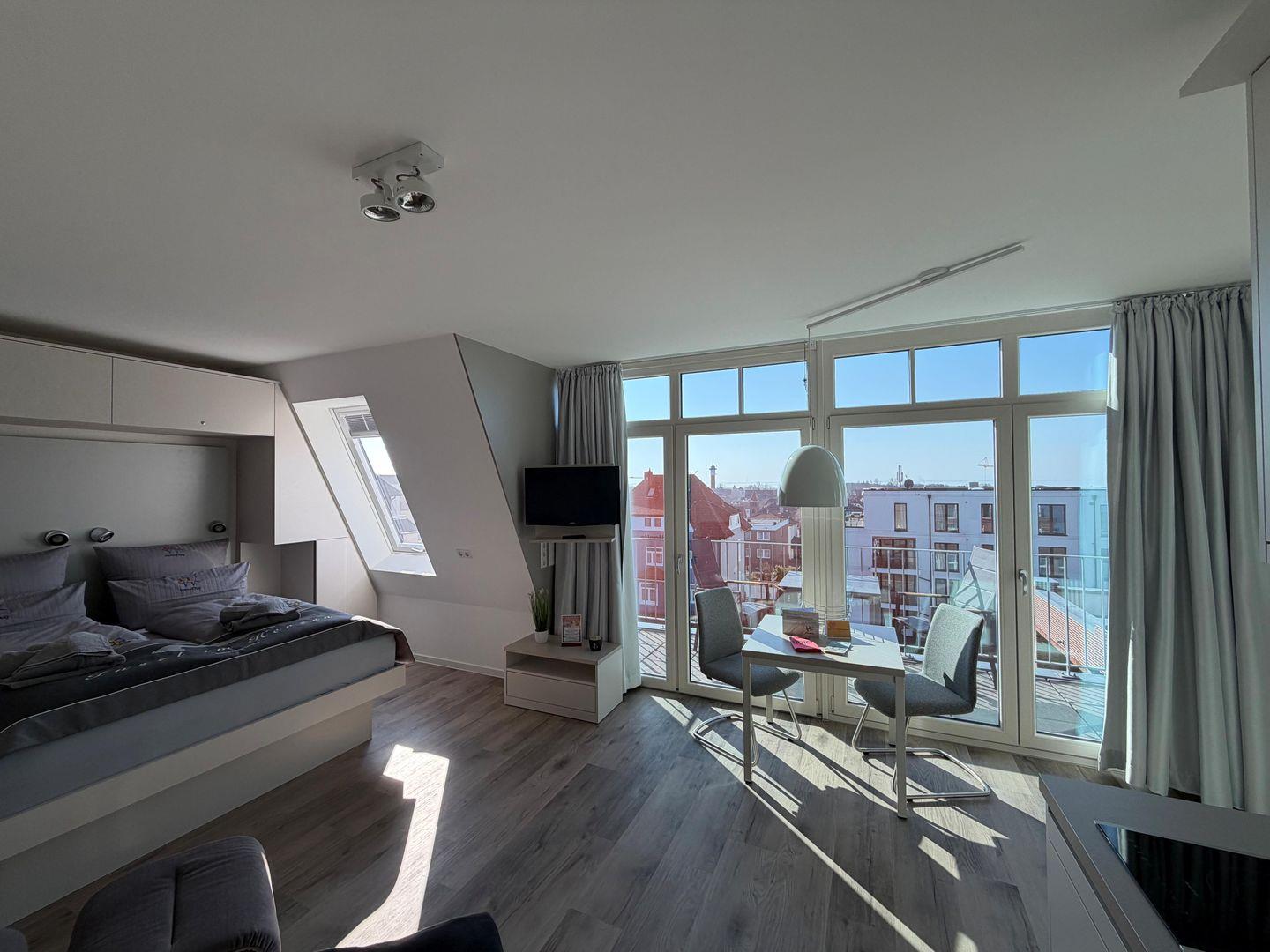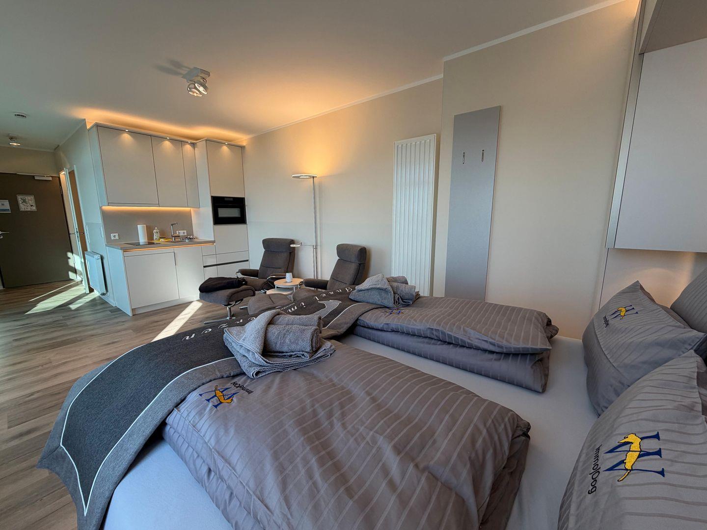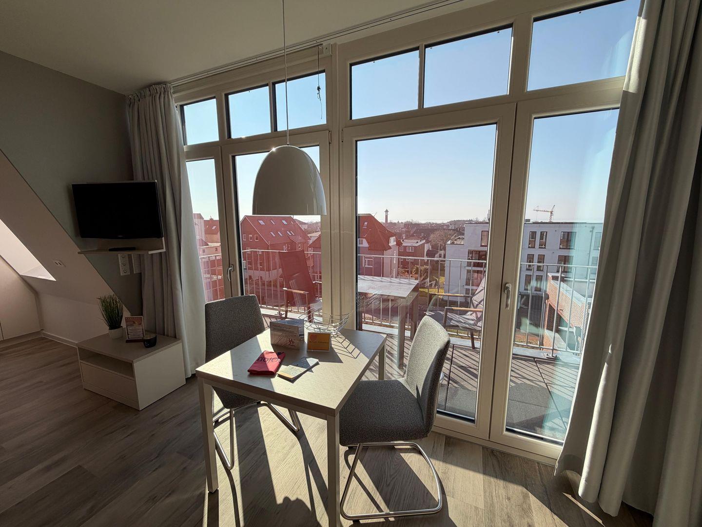 Stilvolles Aparthotel-Appartement auf Wangerooge mit Balkon und Wattenmeerblick, nur 10 m vom Strand entfernt.