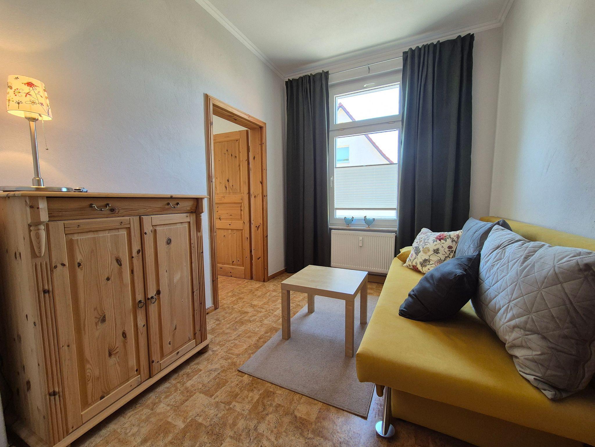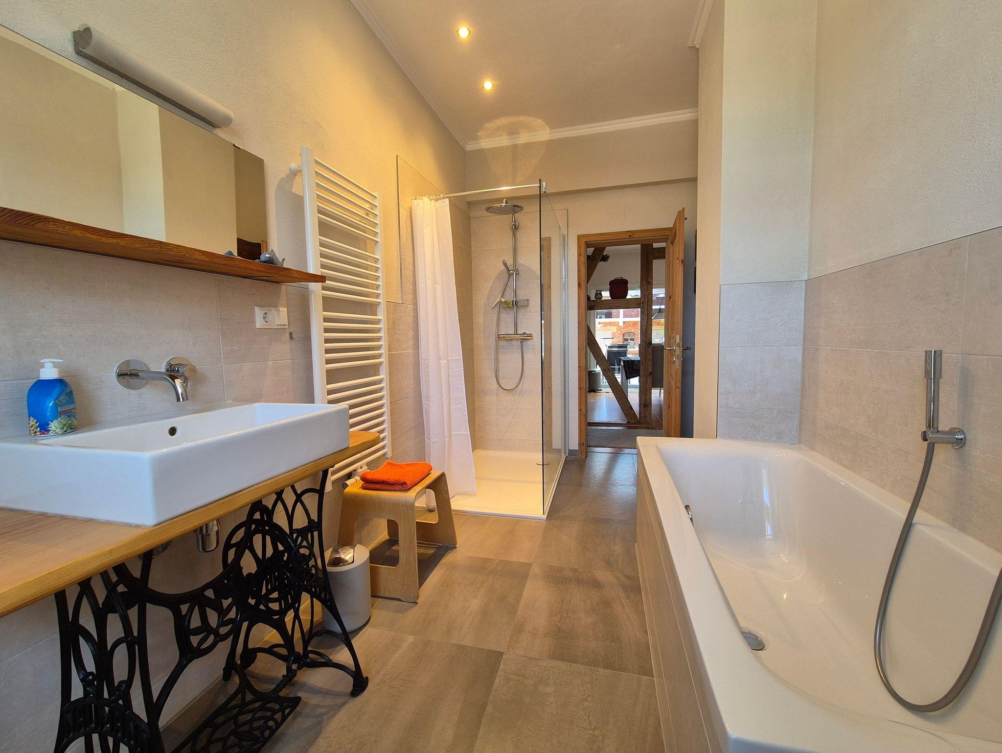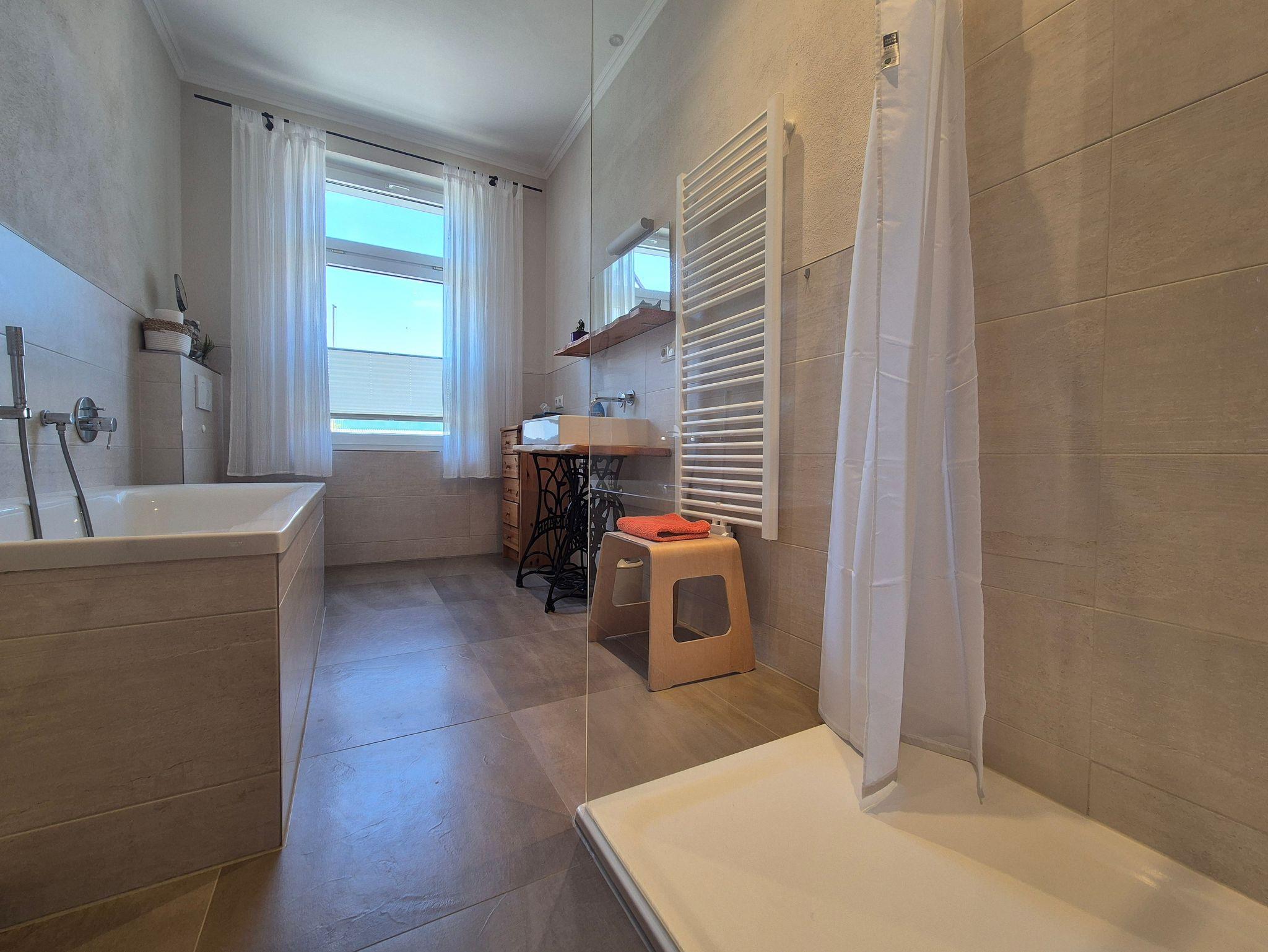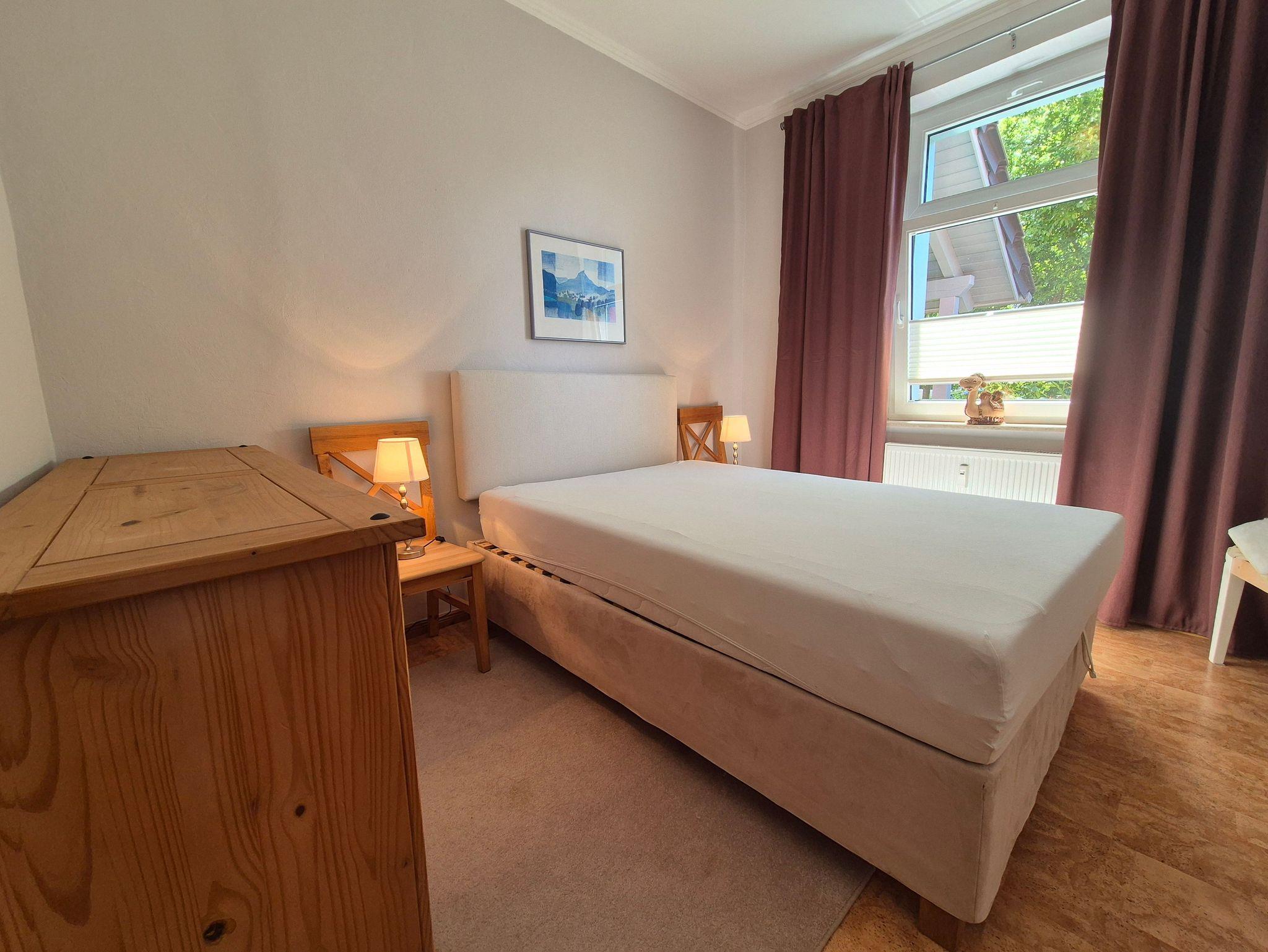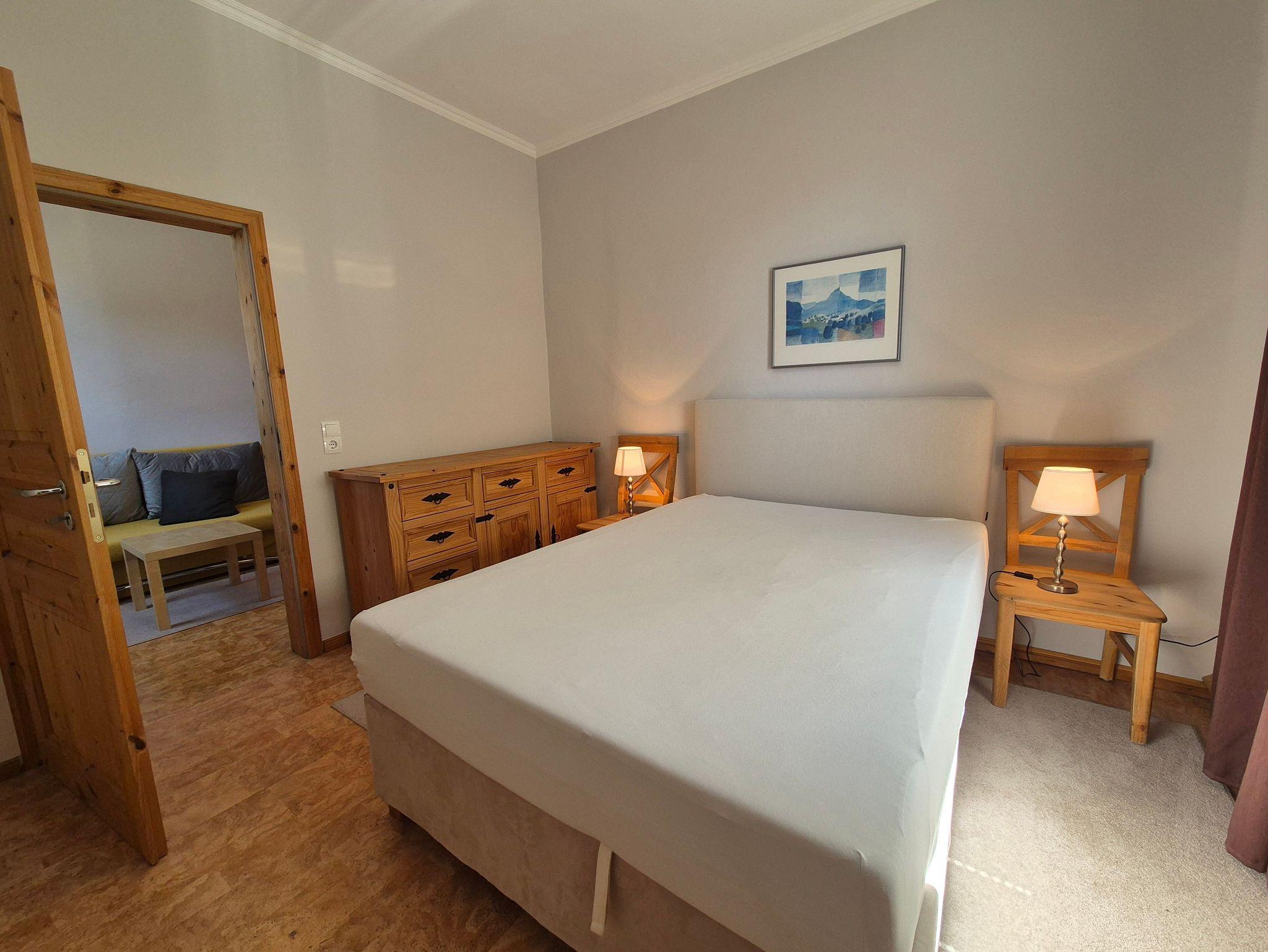 Das erste Schlafzimmer, das vom Wohnzimmer aus erreichbar ist, bietet ein Doppelbett (1,60 m breit). Zwei weitere Schlafzimmer, die hintereinander liegen, sind mit einem Doppelbett (1,40 m breit) und einer zusätzlichen Schlafcouch ausgestattet. Das helle Tageslichtbadezimmer verfügt über eine ebenerdige Dusche und eine Badewanne.
