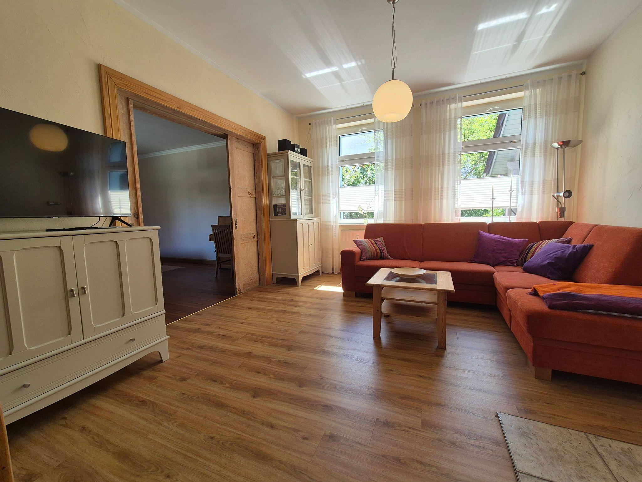 Ihr Ferienquartier begrüßt Sie mit einem Flur, der über eine Garderobe und Schuhablage verfügt. Von hier aus gelangen Sie in die großzügige Wohnküche mit Esstisch und direktem Blick ins Wohnzimmer, das mit einer ausziehbaren Couch, einem Kamin und einem TV ausgestattet ist. Die überdachte Terrasse ist direkt von der Küche aus zugänglich.