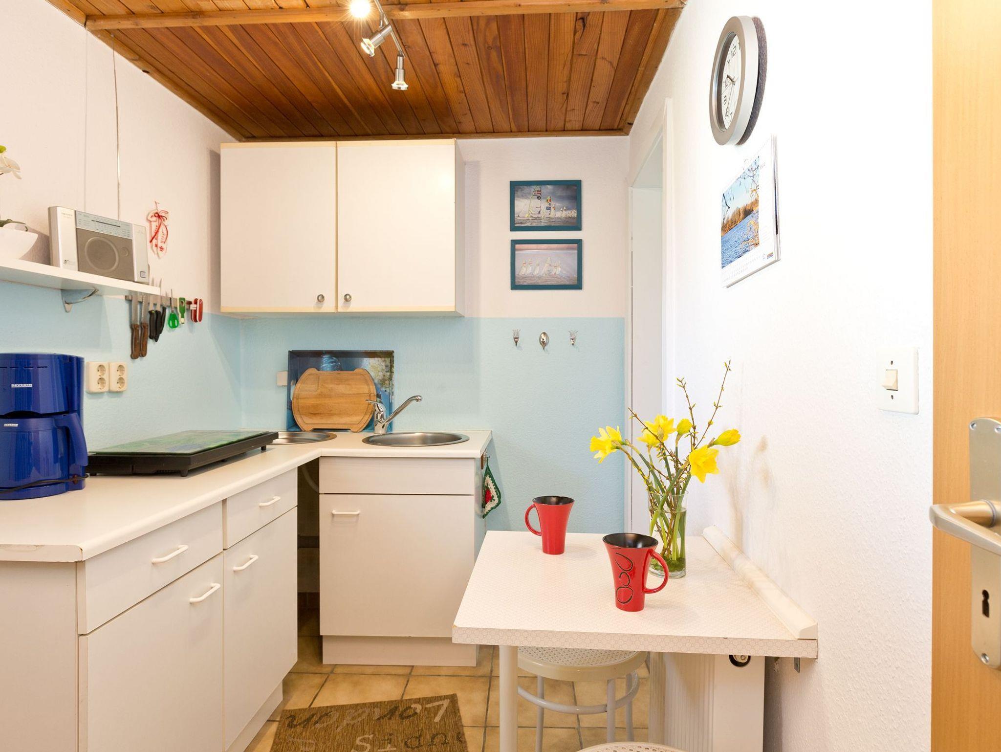 Die kleine Küche ist ideal für die Zubereitung von Snacks und bietet alles, was Sie brauchen: einen 2-Platten-Herd, eine Kaffeemaschine und einen Esstisch für zwei Personen. Ein Kühlschrank mit Gefrierkombination und eine Mikrowelle runden die Ausstattung ab. Von hier aus gelangen Sie in alle weiteren gemütlichen Räumlichkeiten.
