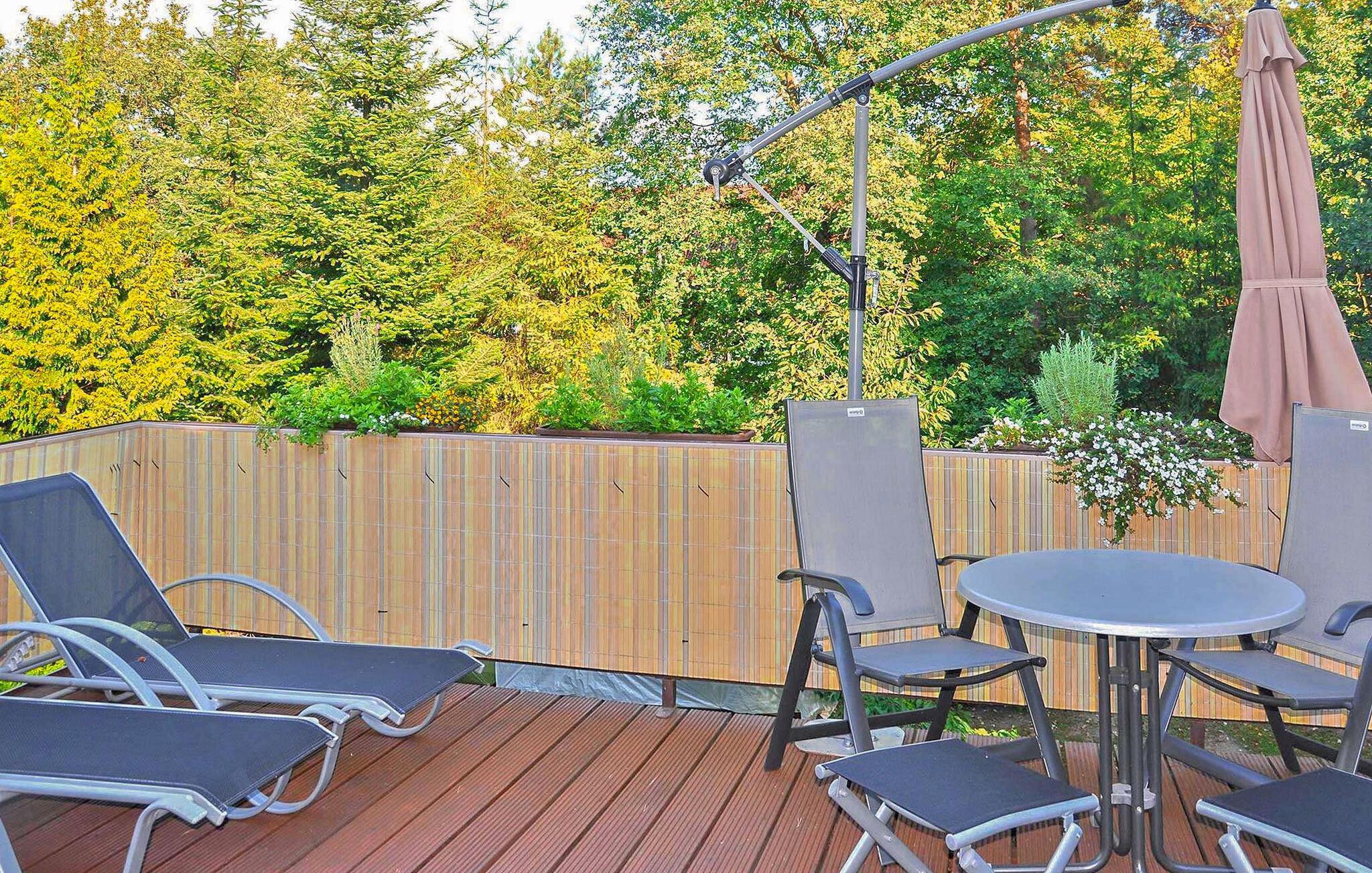 Die ca. 55 qm große, separate Nichtraucher-Ferienwohnung ist ausgestattet mit einem großen Wohnraum (Polstermöbel, Sessel, Flachbild-TV, Radio/CD-Player, Essecke), separater Küche (Gasherd mit Backofen, Kühlschrank mit Gefriermöglichkeit, Mikrowelle, div. Küchenkleingeräte, Ess-Theke), einem Schlafraum (Doppelbett), Bad (Dusche, WC, Fön) und einer großen möblierten Dachterrasse. Die Wohnung wird zentral beheizt und verfügt über Insektenschutz an den Fenstern. Weiterhin stehen Parkplatz, ein Grill, 2 Sonnenliegen und W-LAN (nur für Telekomkunden) zur Verfügung.