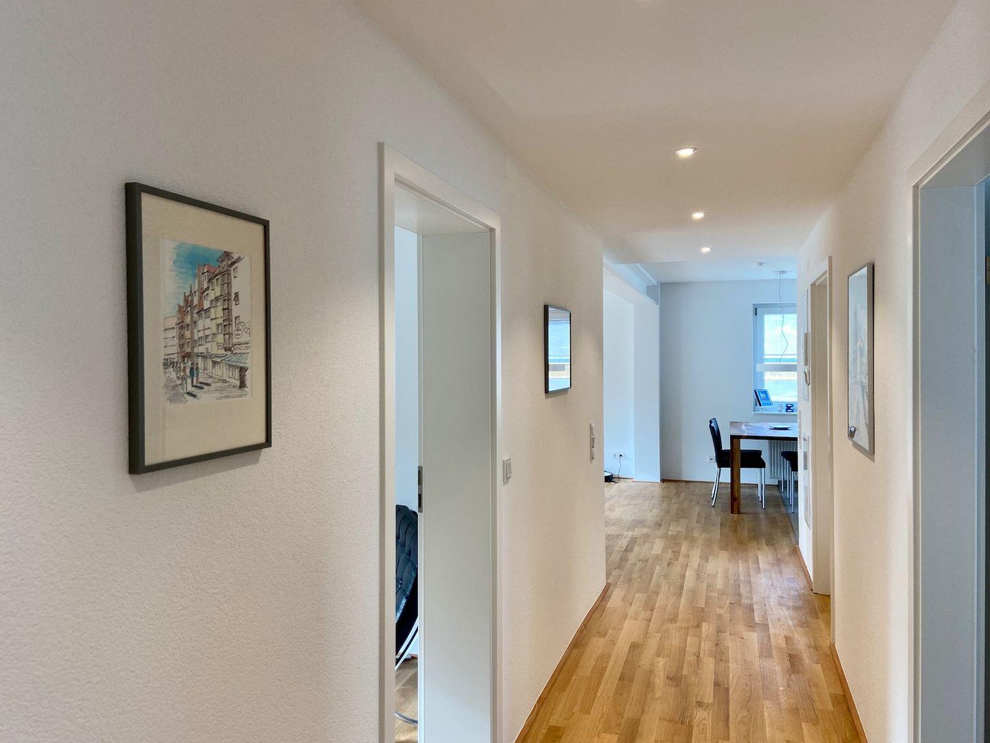 Sie werden sich in der neu renovierten 3 Zimmer Wohnung mit Gartenblick wohl fühlen. Die Ausstattung ist modern und stilvoll, auf hochwertige Materialien wurde Wert gelegt. Die Wohnung hat ca. 85 qm2 und wurde geschmackvoll und mit ausgewählten Möbeln ausgestattet. Der Wohn-/Essbereich besticht mit Nussholz-Esstisch und komfortablen Lederstühlen sowie einer exklusiven Leder-Sitzgarnitur.